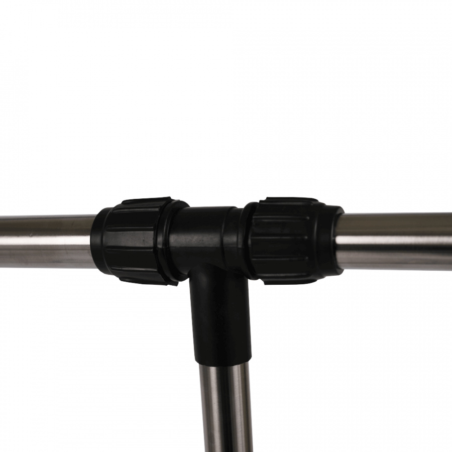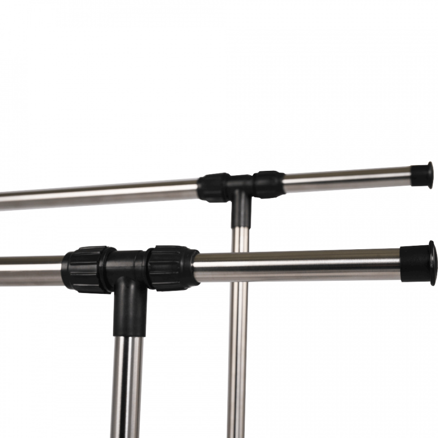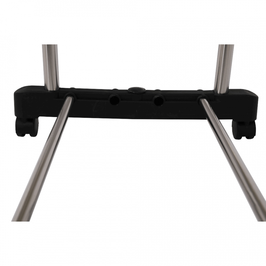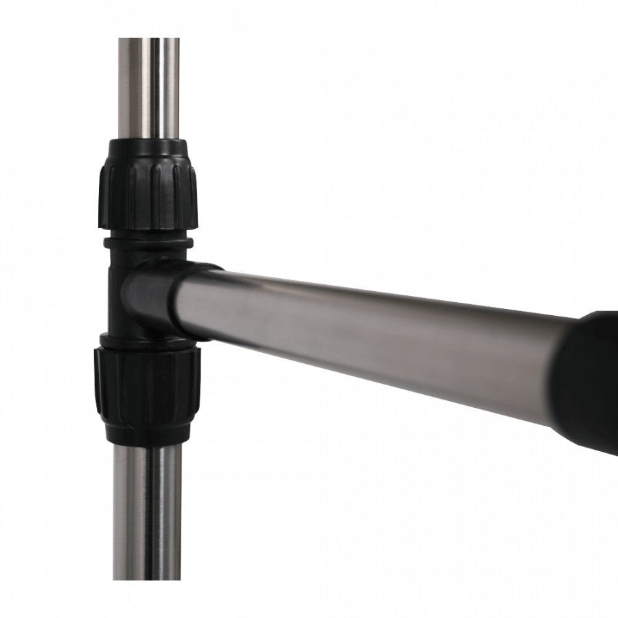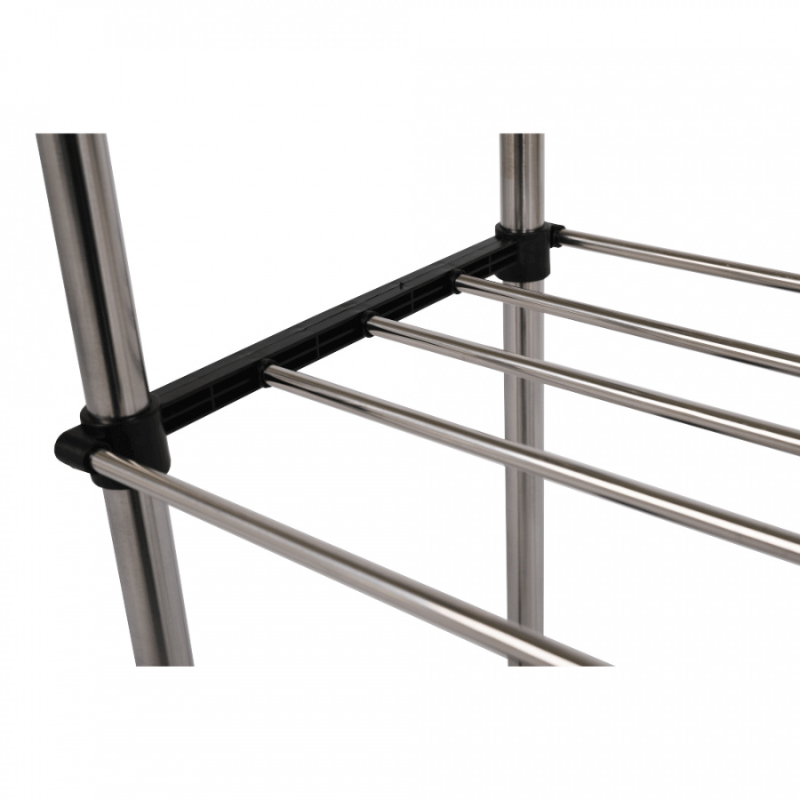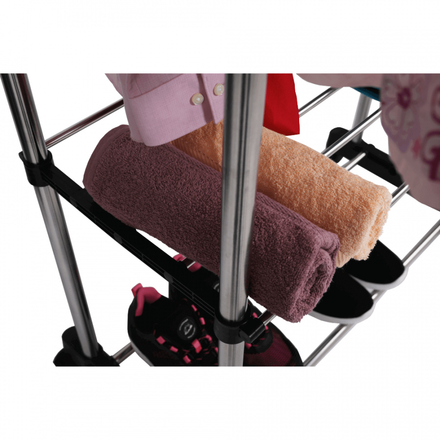 pojízdný věšák s kolečky a dvěma závěsnými výškově nastavitelnými tyčemi a odkládací poličkou, provedení: nerezový kov + černý plast, rozměry ŠxHxV: 80x43x90-160 cm.