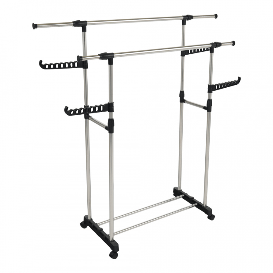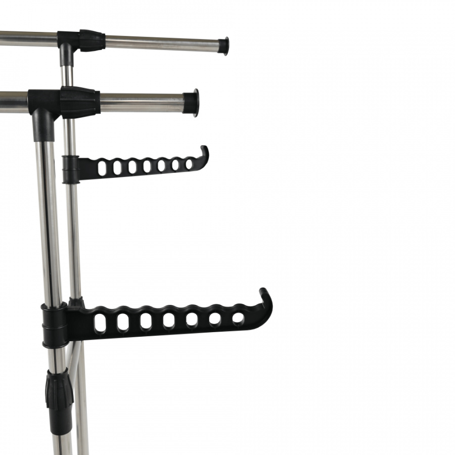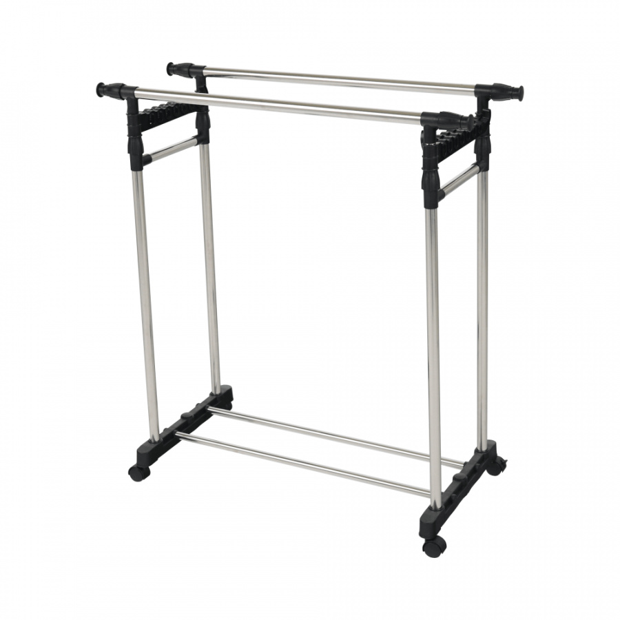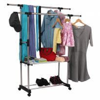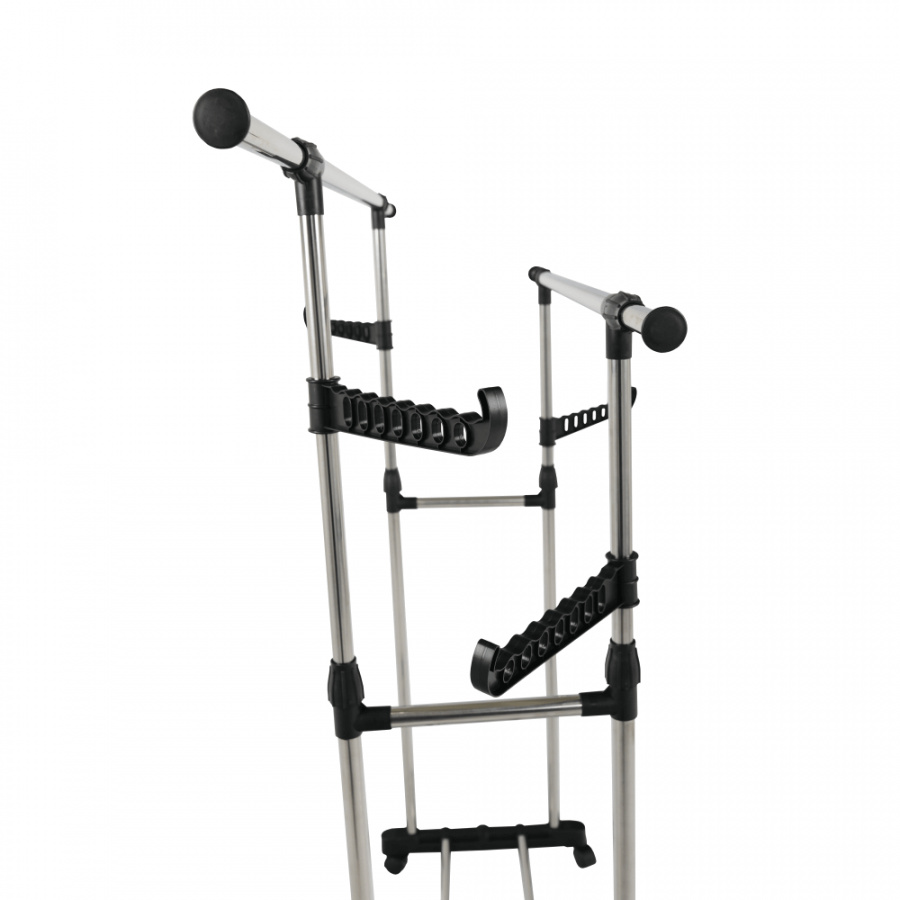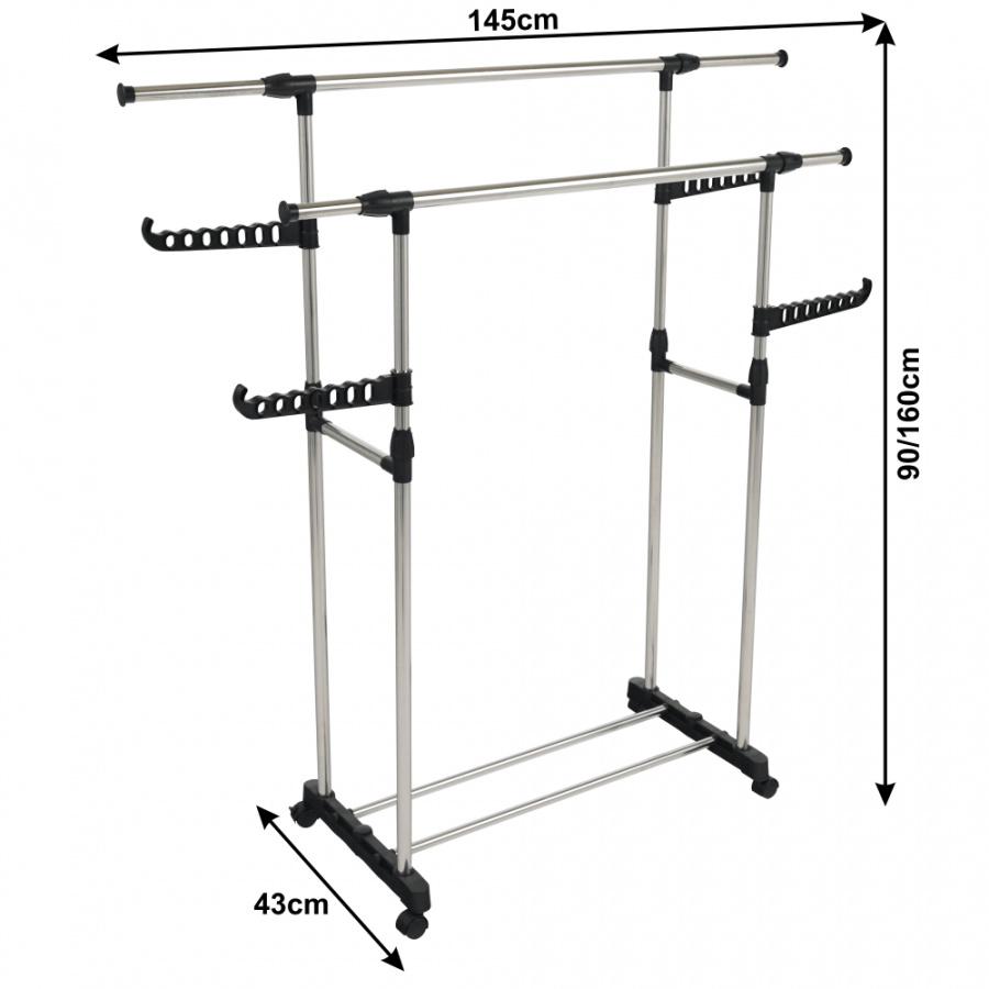 pojízdný věšák s kolečky a dvěma závěsnými výškově nastavitelnými tyčemi, provedení: nerezový kov + černý plast, rozměry ŠxHxV: 145x43x90-160 cm.