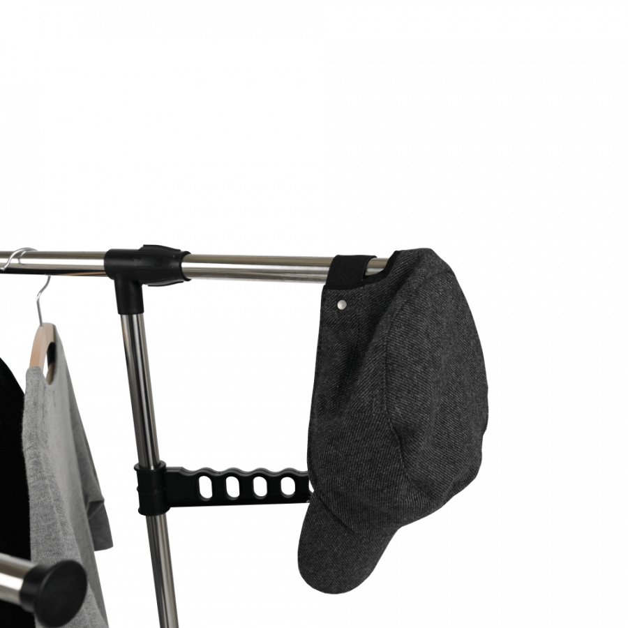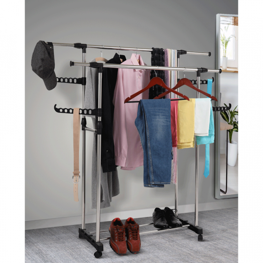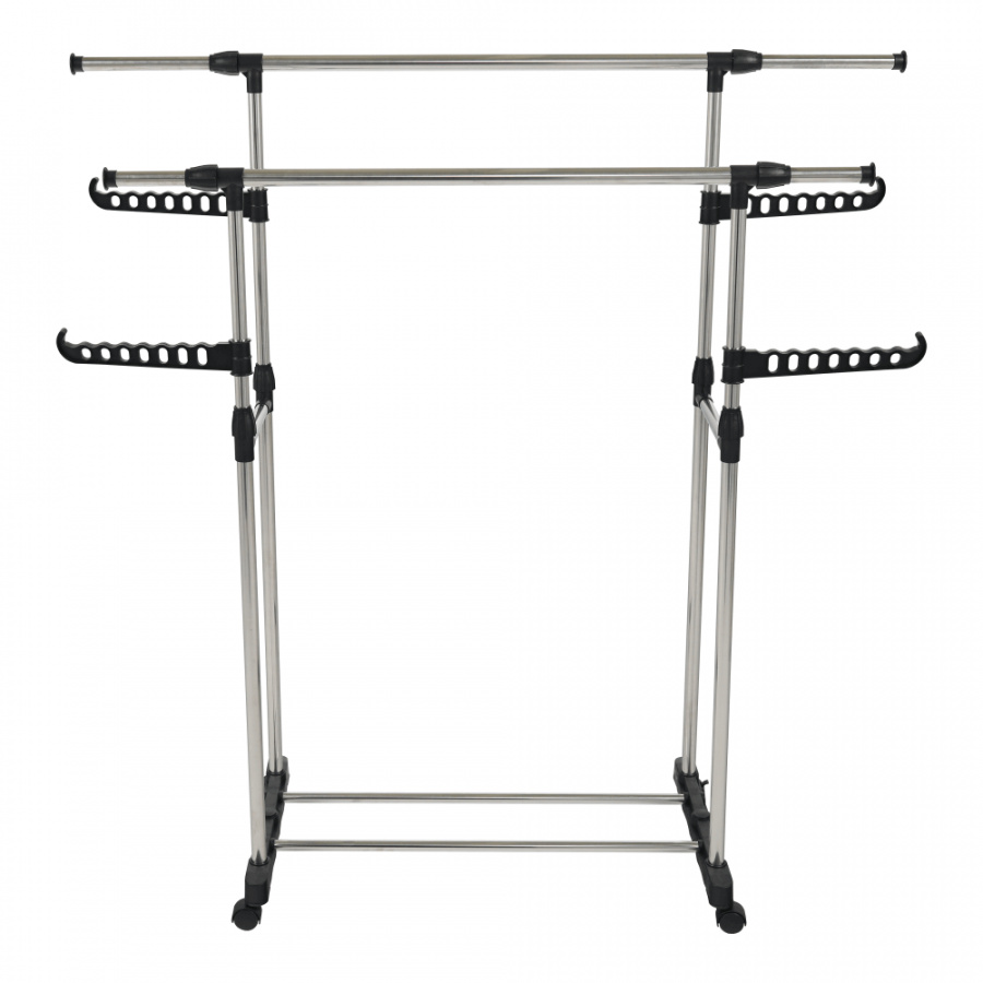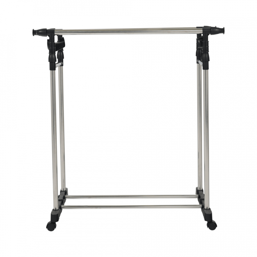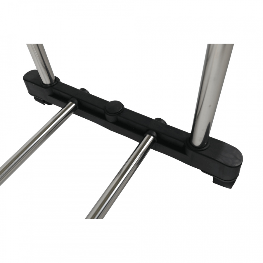 pojízdný věšák s kolečky a dvěma závěsnými výškově nastavitelnými tyčemi, provedení: nerezový kov + černý plast, rozměry ŠxHxV: 145x43x90-160 cm.