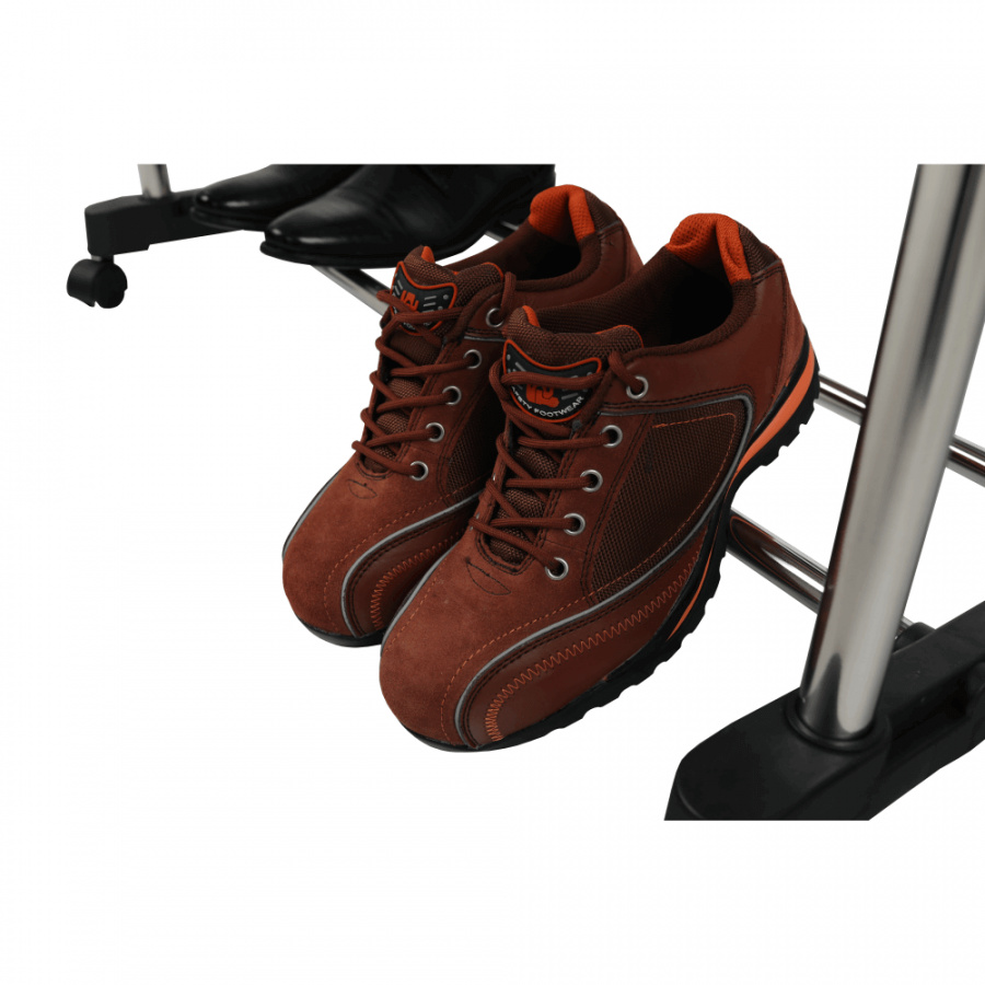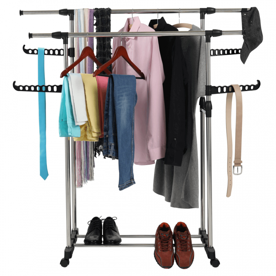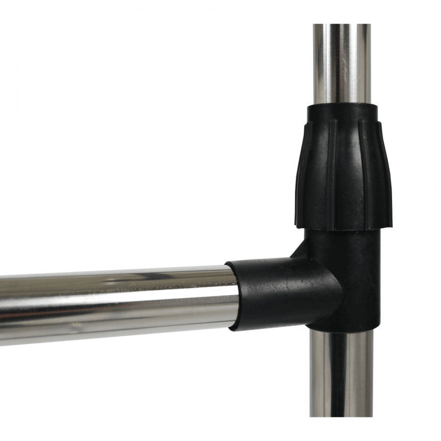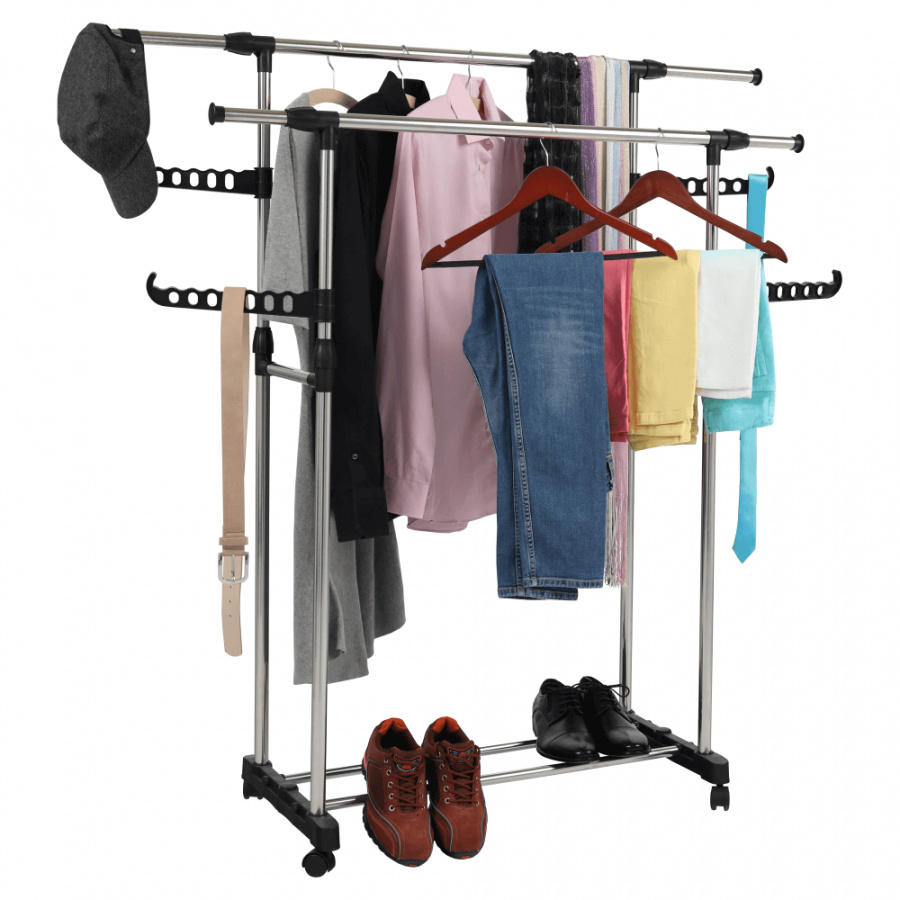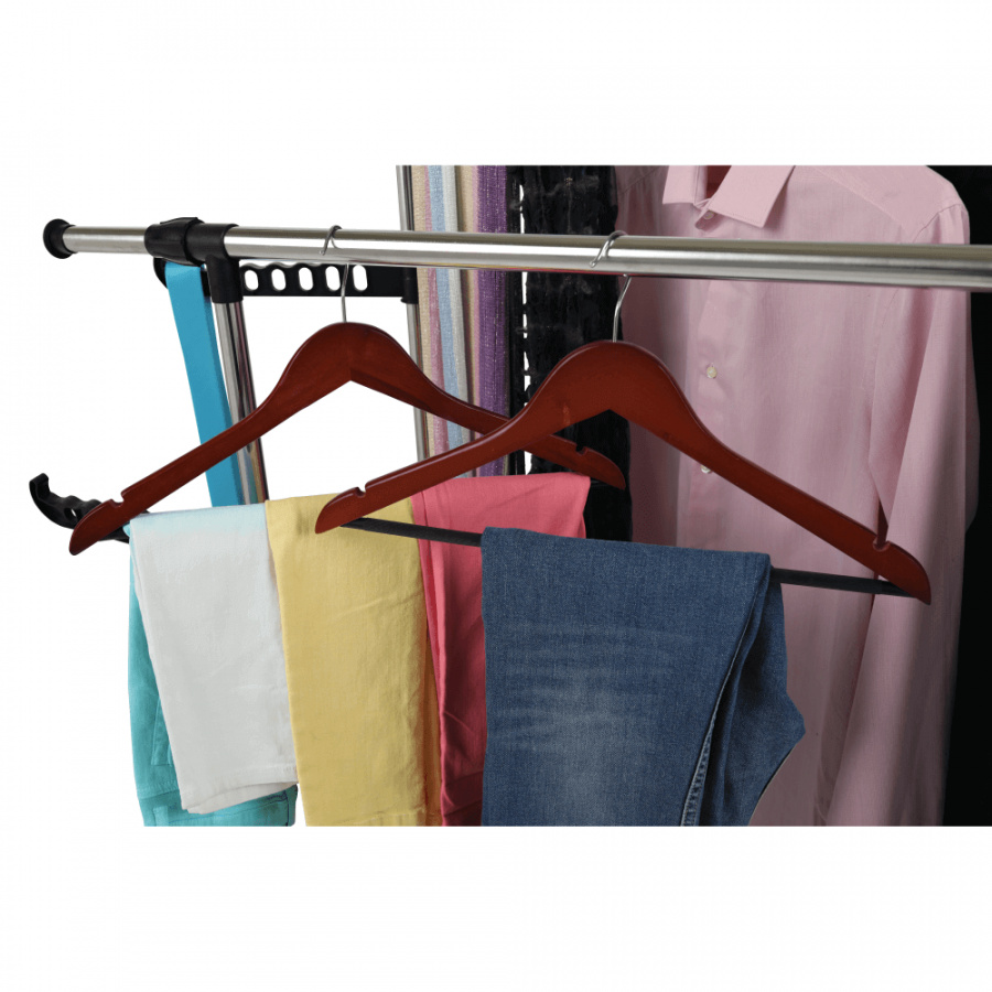 pojízdný věšák s kolečky a dvěma závěsnými výškově nastavitelnými tyčemi, provedení: nerezový kov + černý plast, rozměry ŠxHxV: 145x43x90-160 cm.