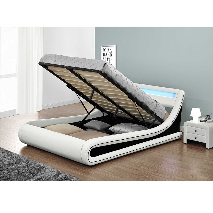 Moderní manželská postel s úložným prostorem, výklopným roštem a RGB LED osvětlením v čele postele.