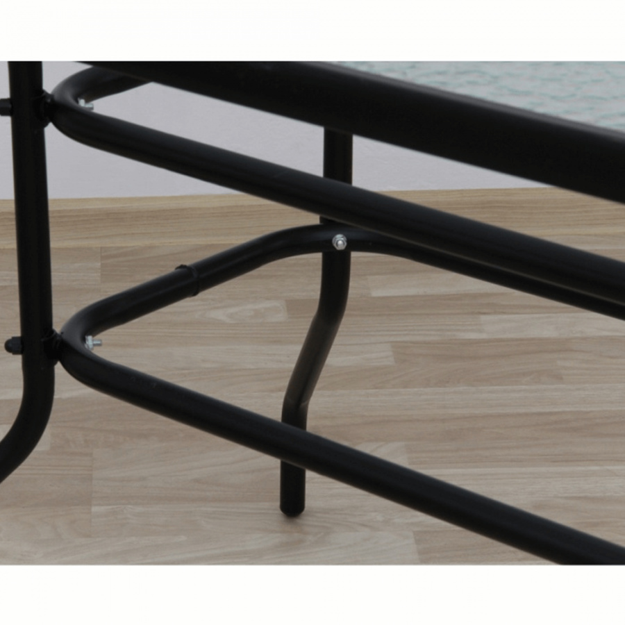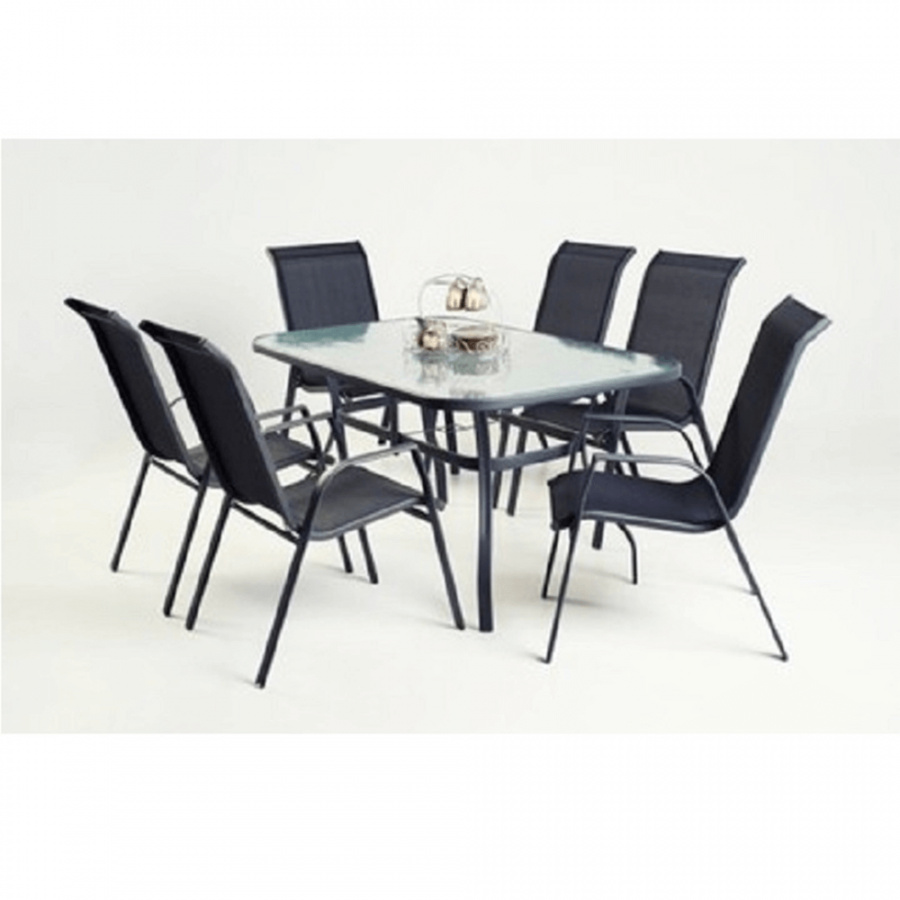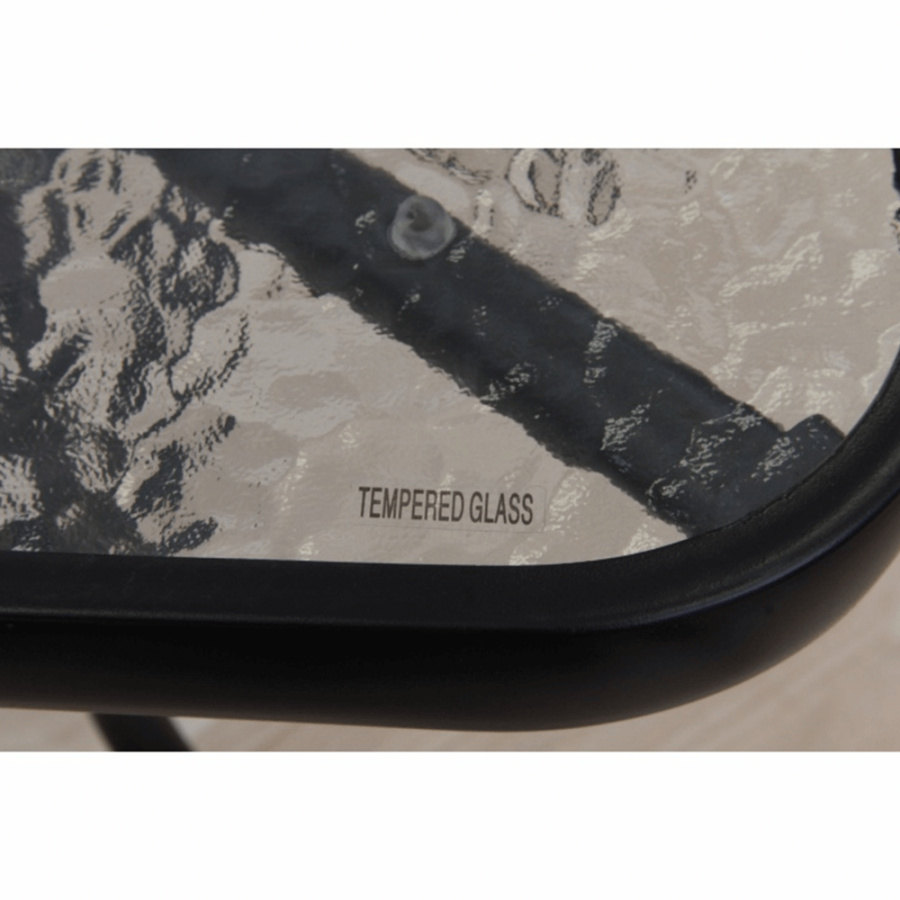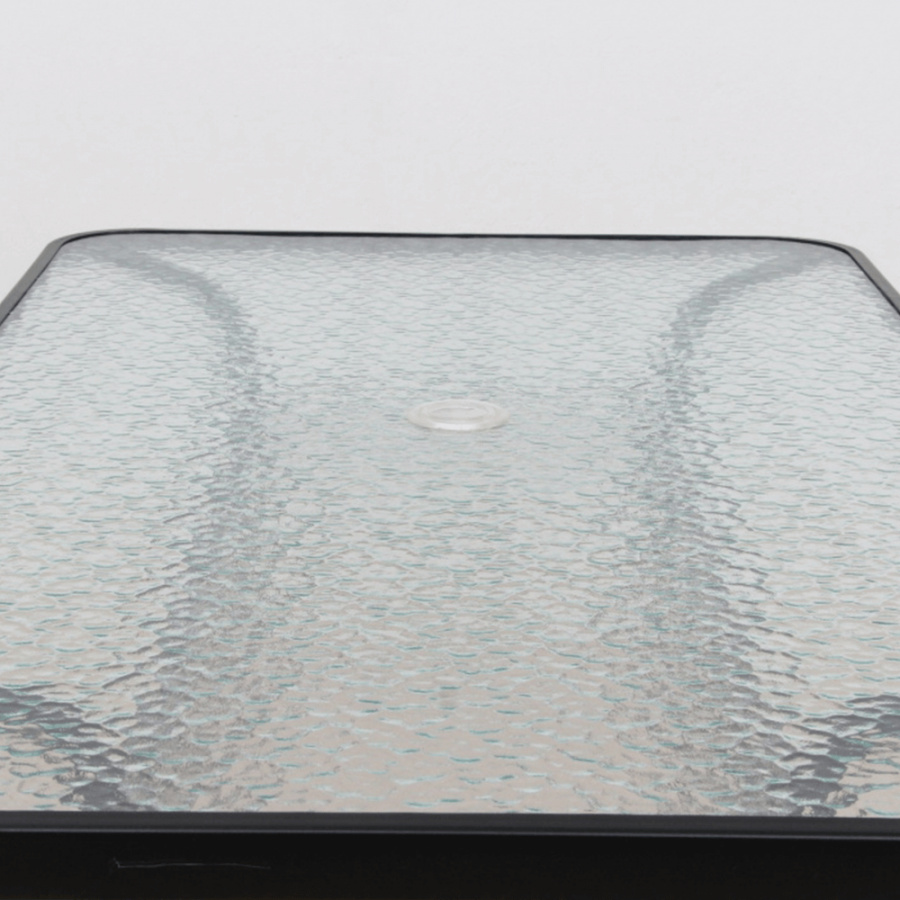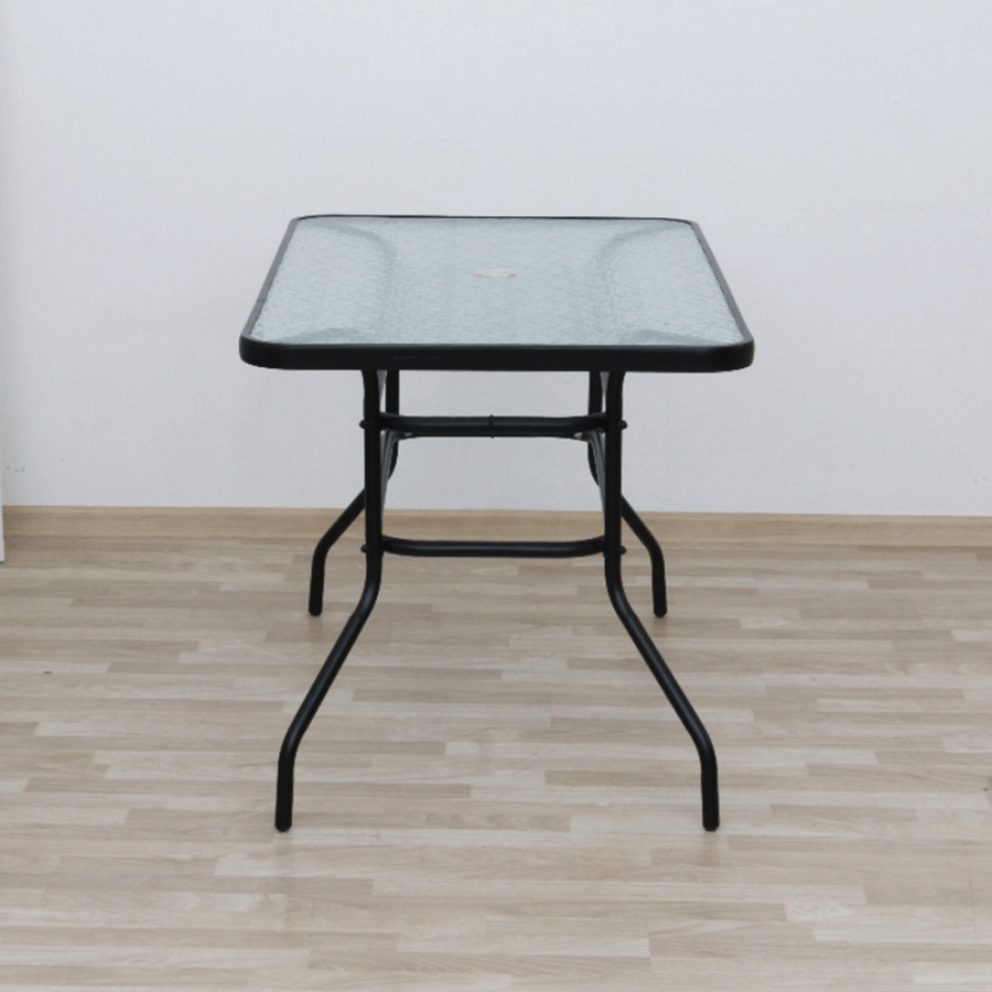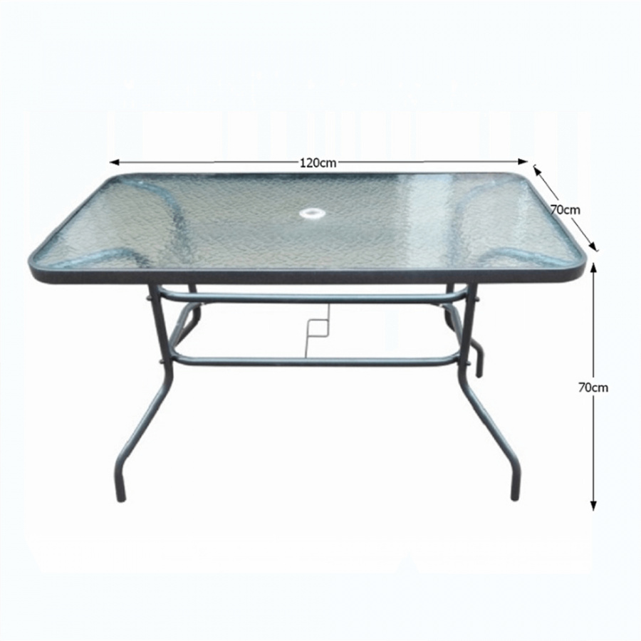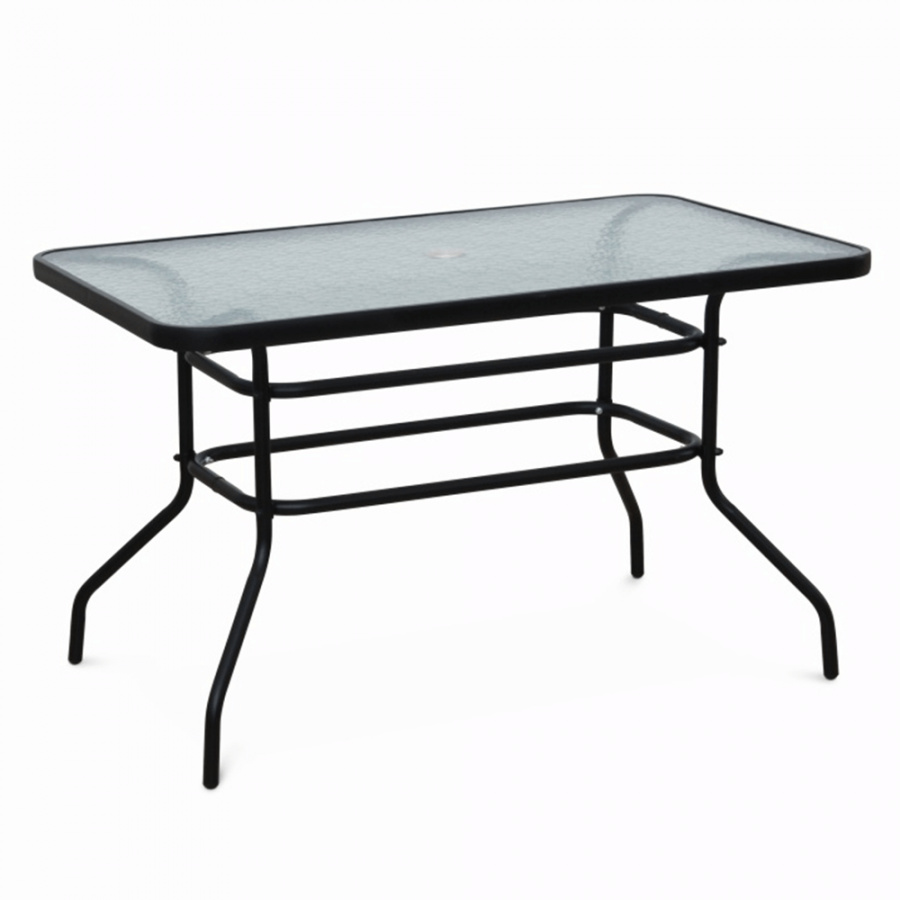 Jídelní stůl vhodný k zahradnímu setu DEMAT NEW Materiál: tvrzené sklo / černá ocel Rozměry (ŠxHxV): 120x70x70 cm S otvorem na slunečník. Dodáván v demontu