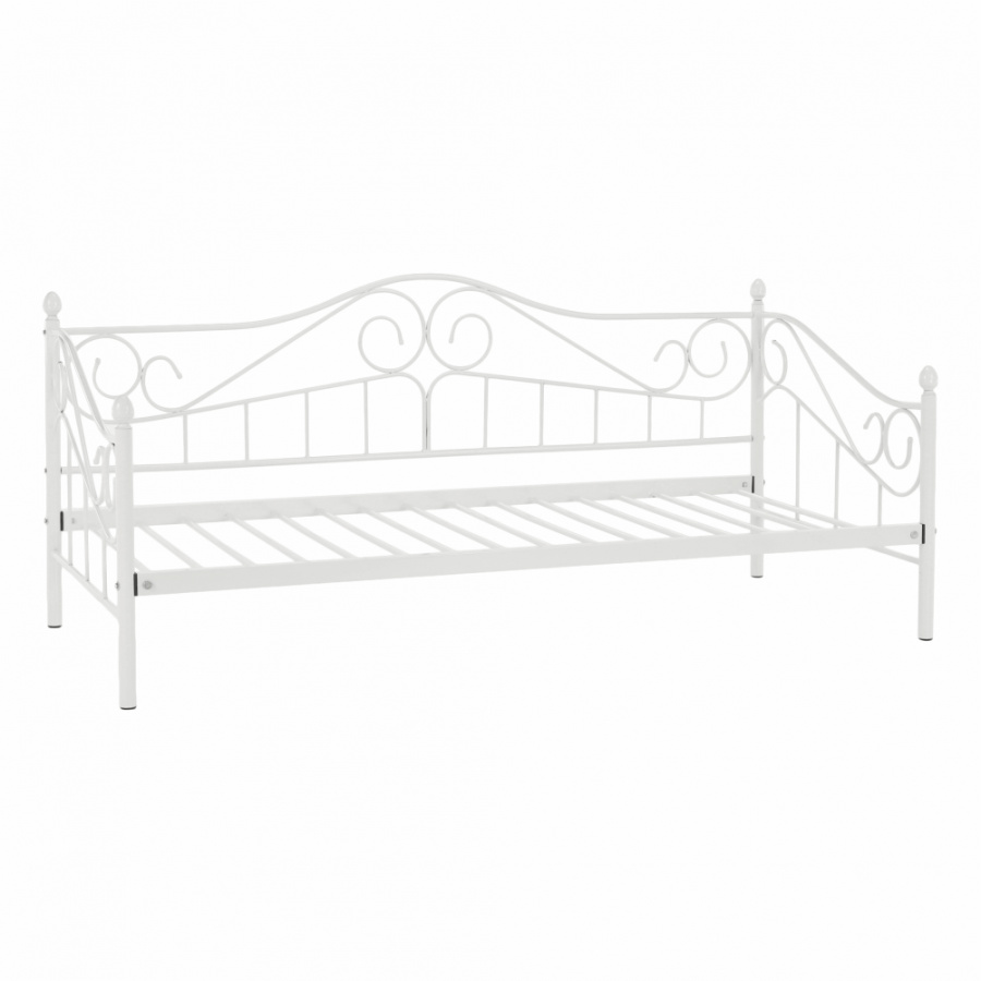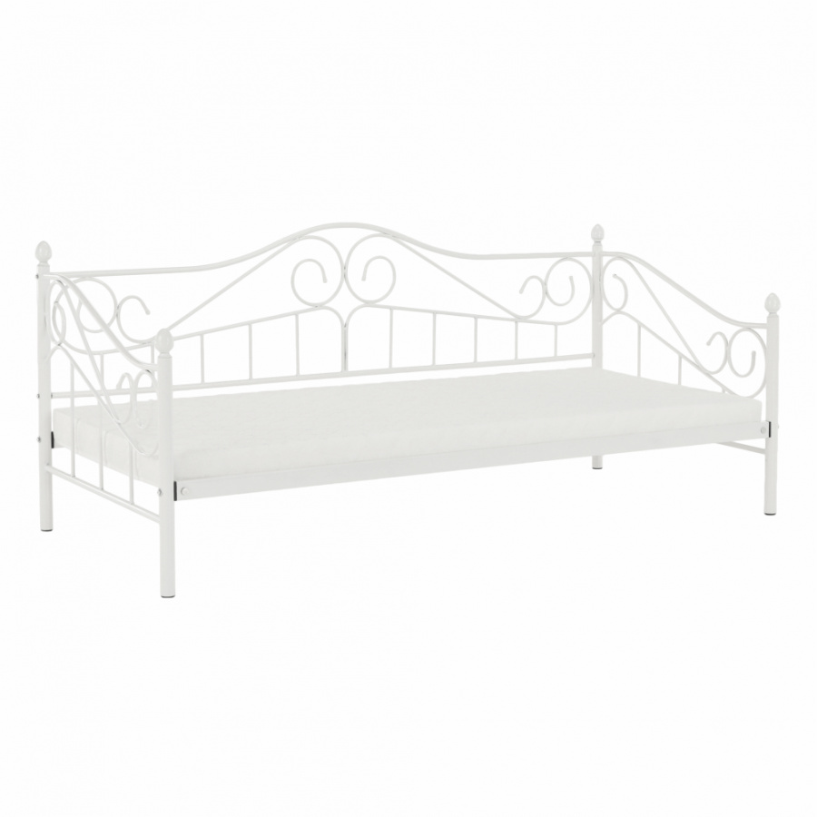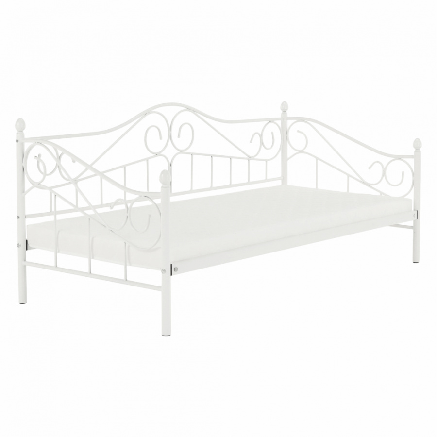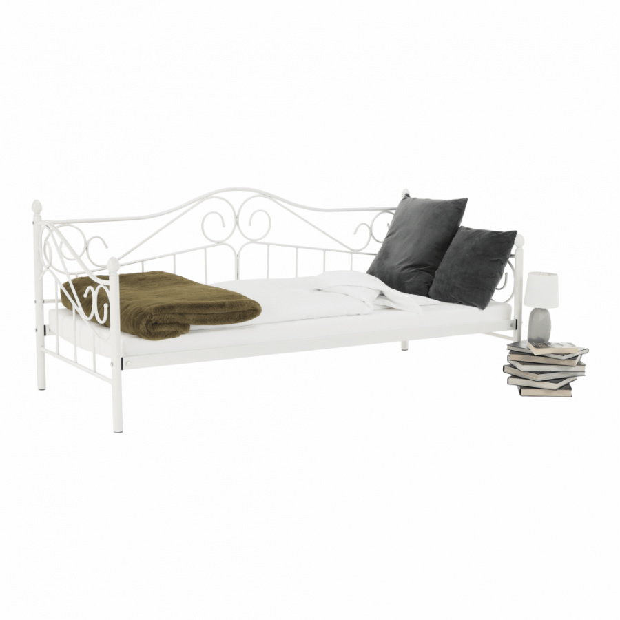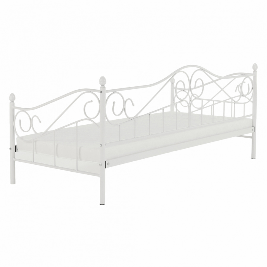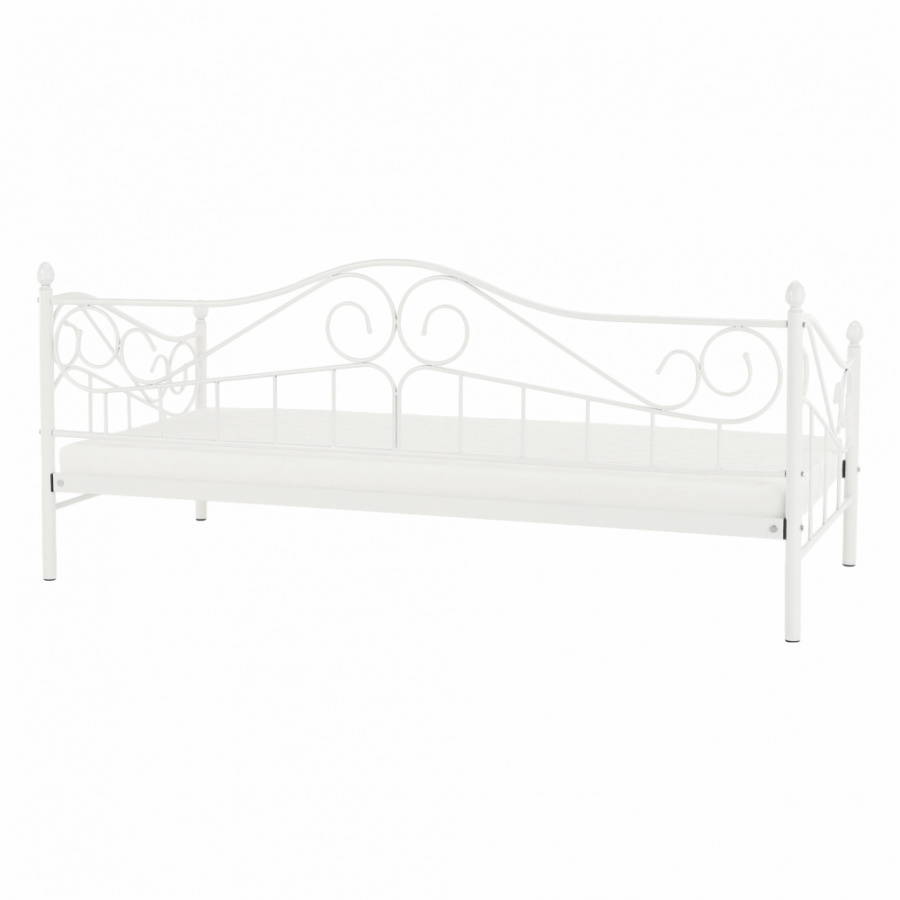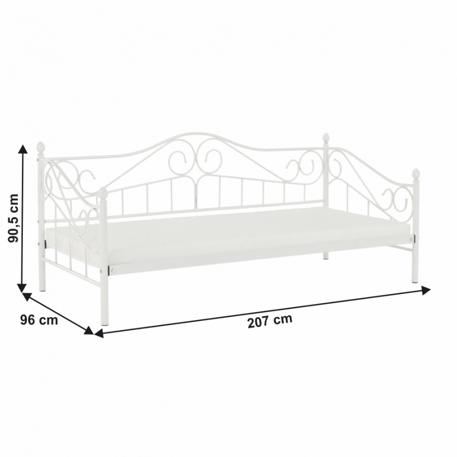 Kovová postel s kovovým roštem, DAINA Materiál: kov Barva: bílá Vnější rozměry postele (ŠxHxV): 207x96x90,5 cm Plocha na spaní: 90x200 cm Výška po rošt: 30 cm Dodávána s kovovým roštem Dodávána bez matrace Dodávané v demontu Možnost dokoupení matrace s rozměrem 90x200 cm