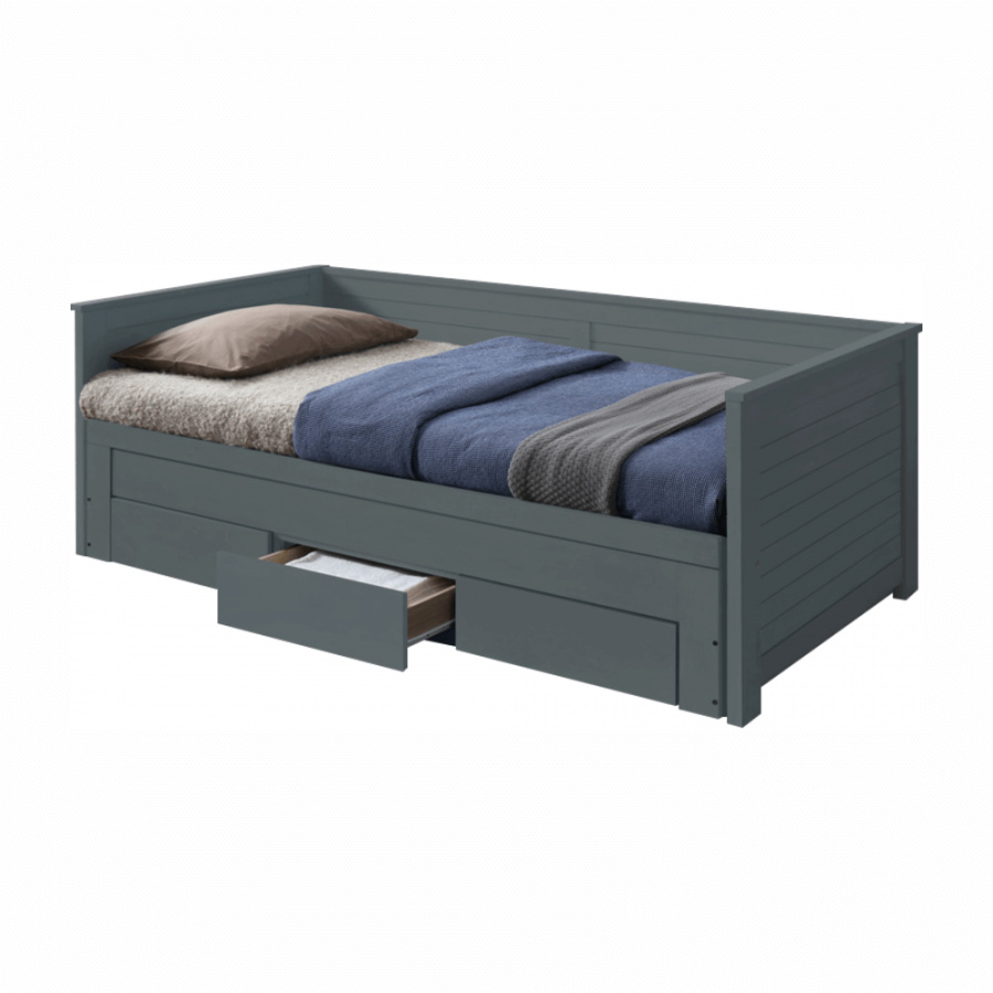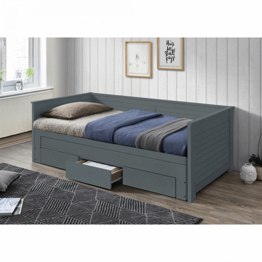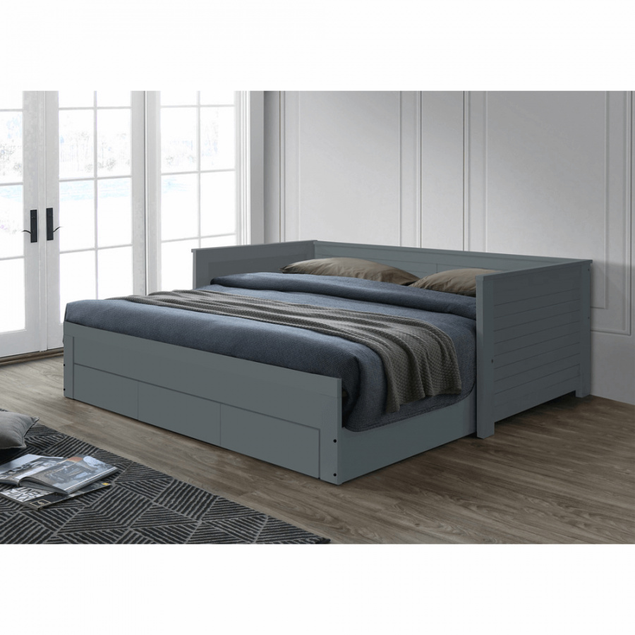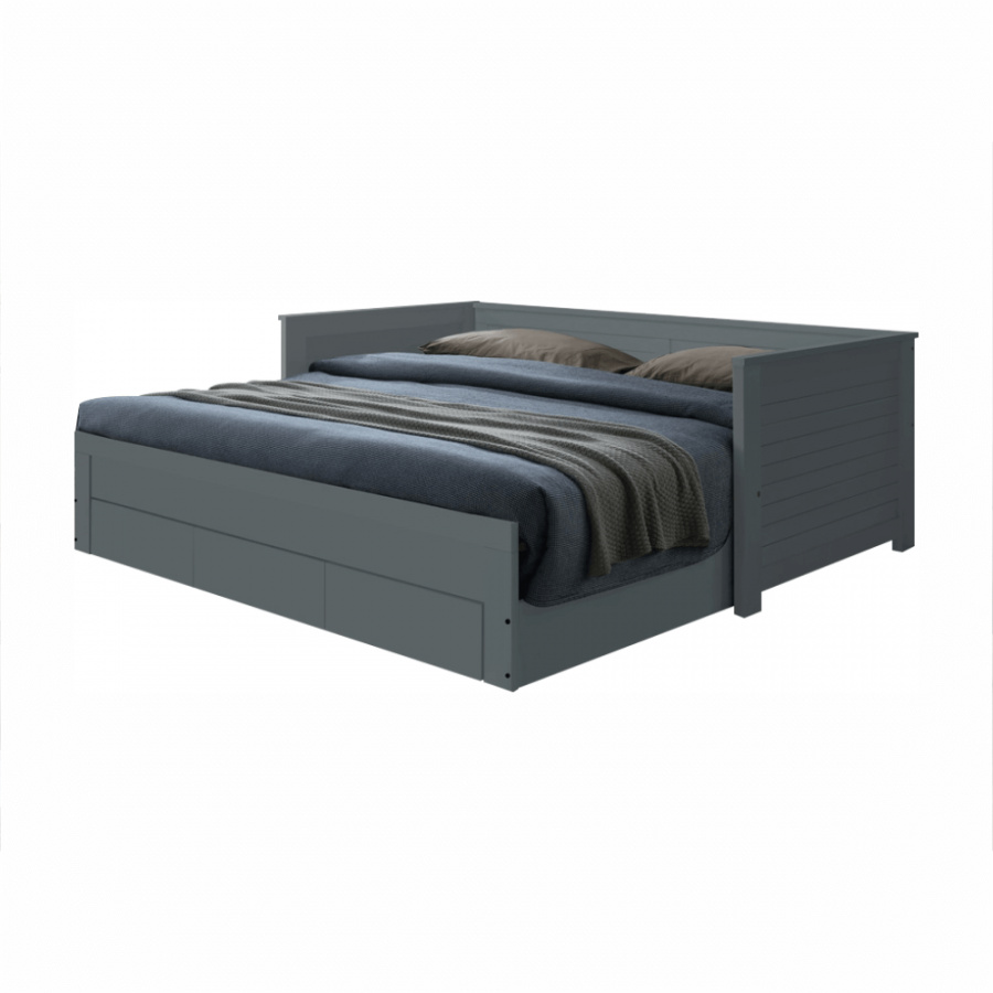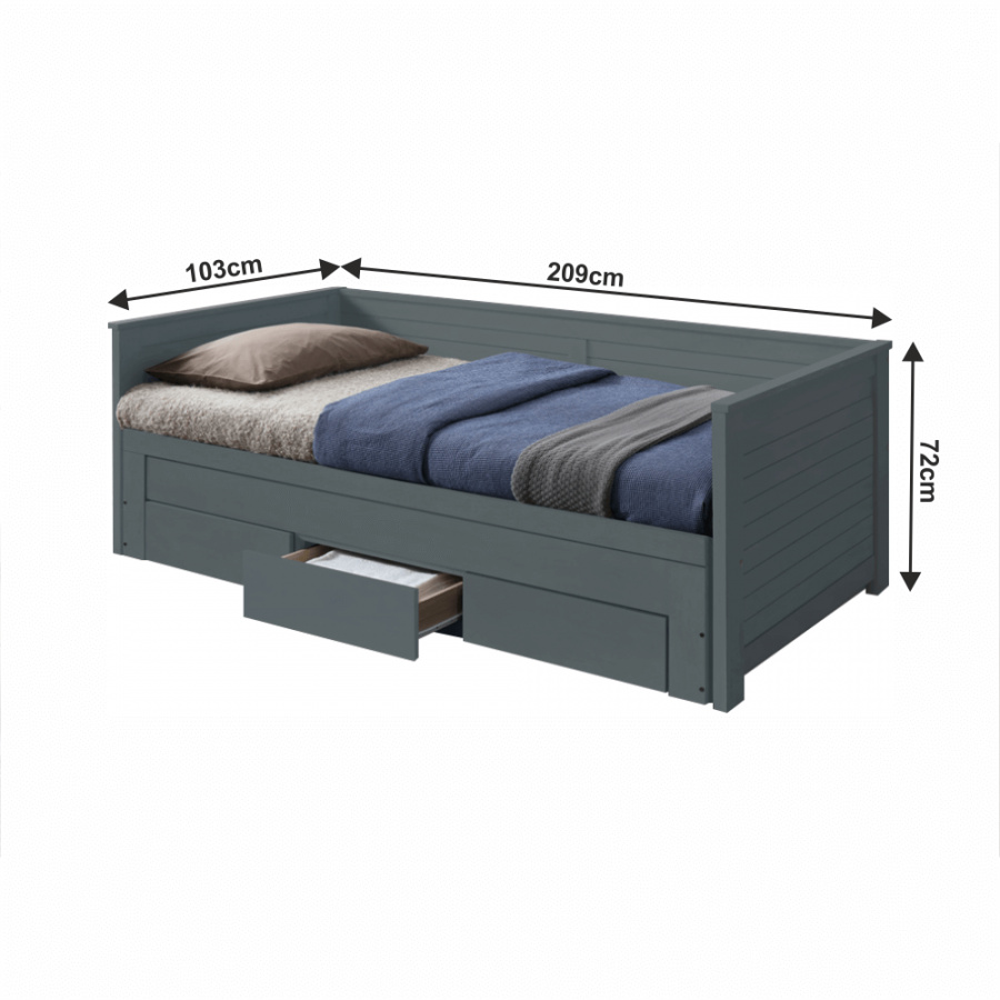 Materiál: masivní dřevo / MDF Barva: šedá Rozměry (ŠxHxV): 209x103x72 cm Rozměry jednolůžka (ŠxHxV): 90x200 cm Rozměry postele po rozložení (ŠxHxV): 180x200 cm Vysouvací konstrukce na kolečkách Dodávané s 2 laťkový rošt Výška po rošt: 36 cm S boční zástěnou S 3 šuplíky Dodávané bez matrace Možnost zakoupit matrace z naší nabídky Dodávané v demontu Pokud plánujete postel používat rozloženou jako manželskou postel, doporučujeme matrace s rozměry 90x200 z naší nabídky. Pokud postel budete používat jako jednolůžko, doporučujeme matrace s rozměrem 85x200 a 95x200 cm.