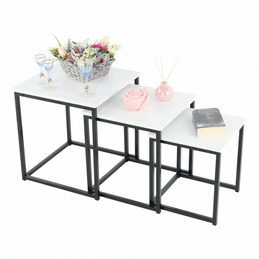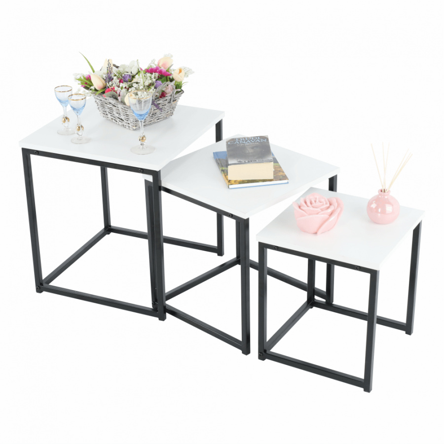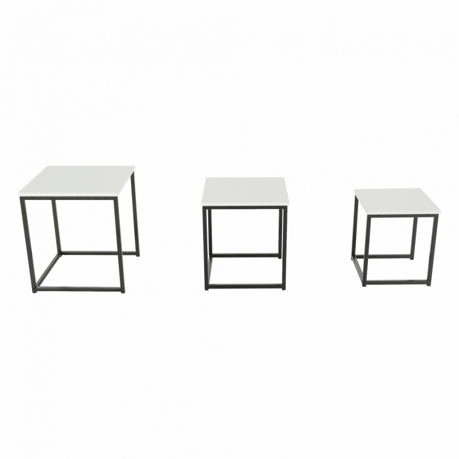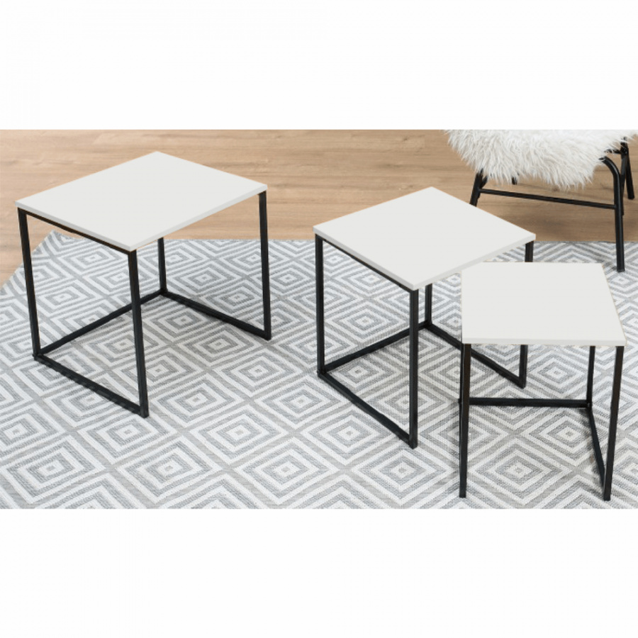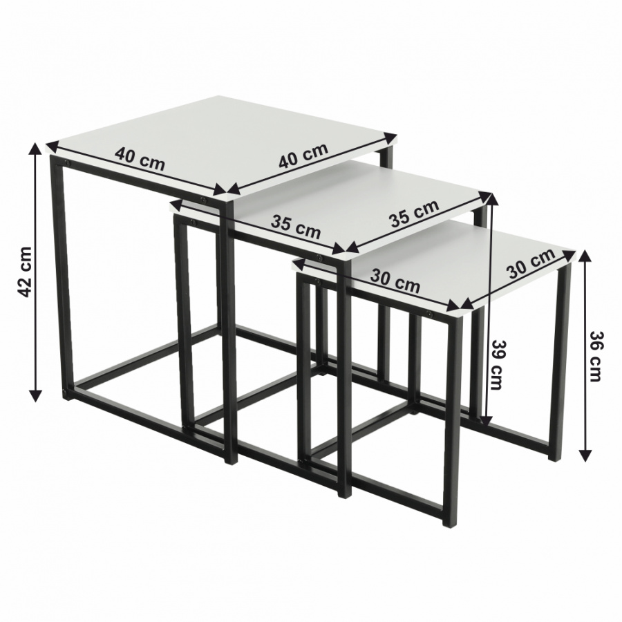 Set 3 konferenčních stolků, Kastler TYP 3 Materiál: MDF / kov Barva: bílá matná / černá Rozměry větší stolek (ŠxHxV): 40x40x42 cm Rozměry střední stolek (ŠxHxV): 35x35x39 cm Rozměry menší stolek (ŠxHxV): 30x30x36 cm Tloušťka materiálu: 15 mm Dodávané v demontu.