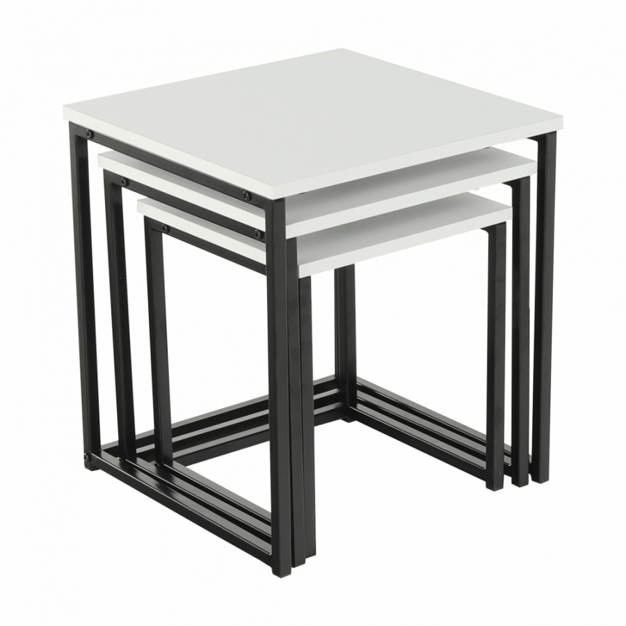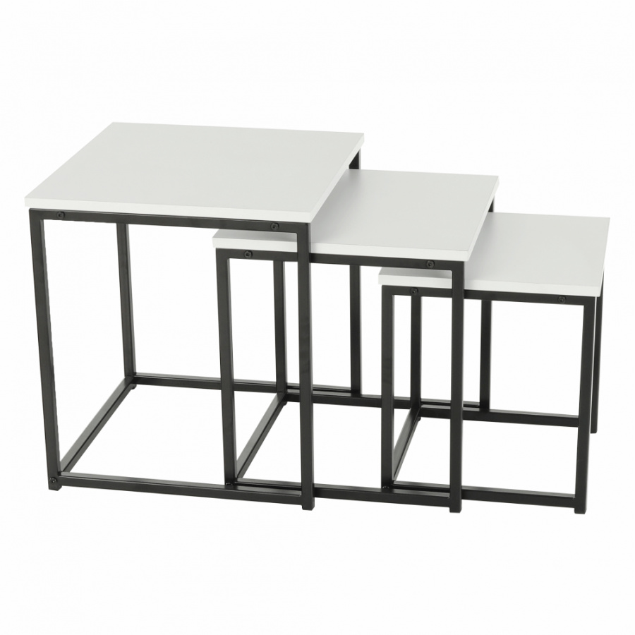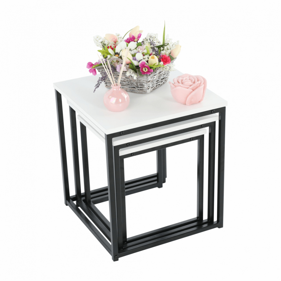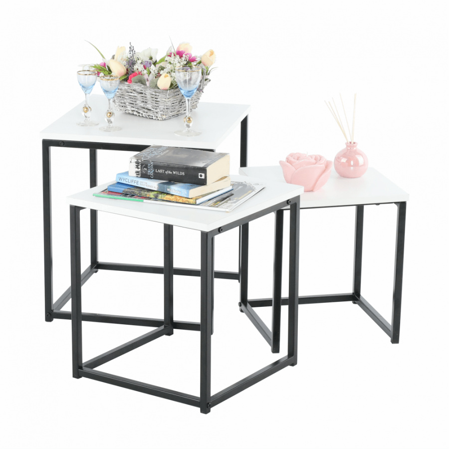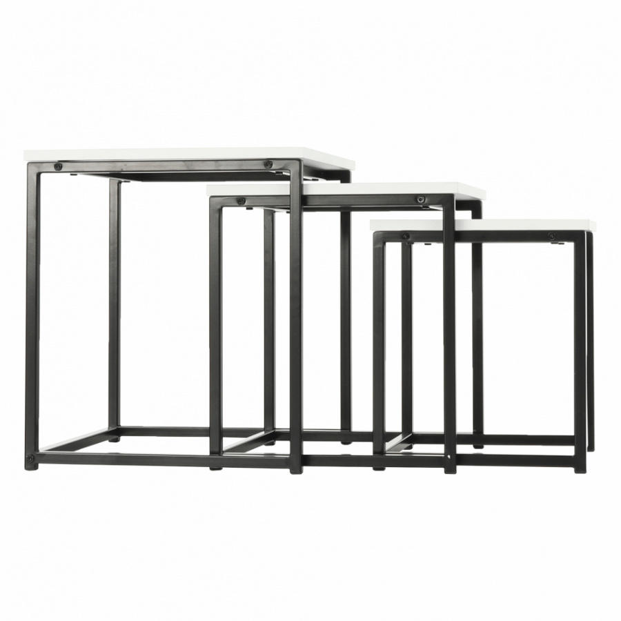 Set 3 konferenčních stolků, Kastler TYP 3 Materiál: MDF / kov Barva: bílá matná / černá Rozměry větší stolek (ŠxHxV): 40x40x42 cm Rozměry střední stolek (ŠxHxV): 35x35x39 cm Rozměry menší stolek (ŠxHxV): 30x30x36 cm Tloušťka materiálu: 15 mm Dodávané v demontu.