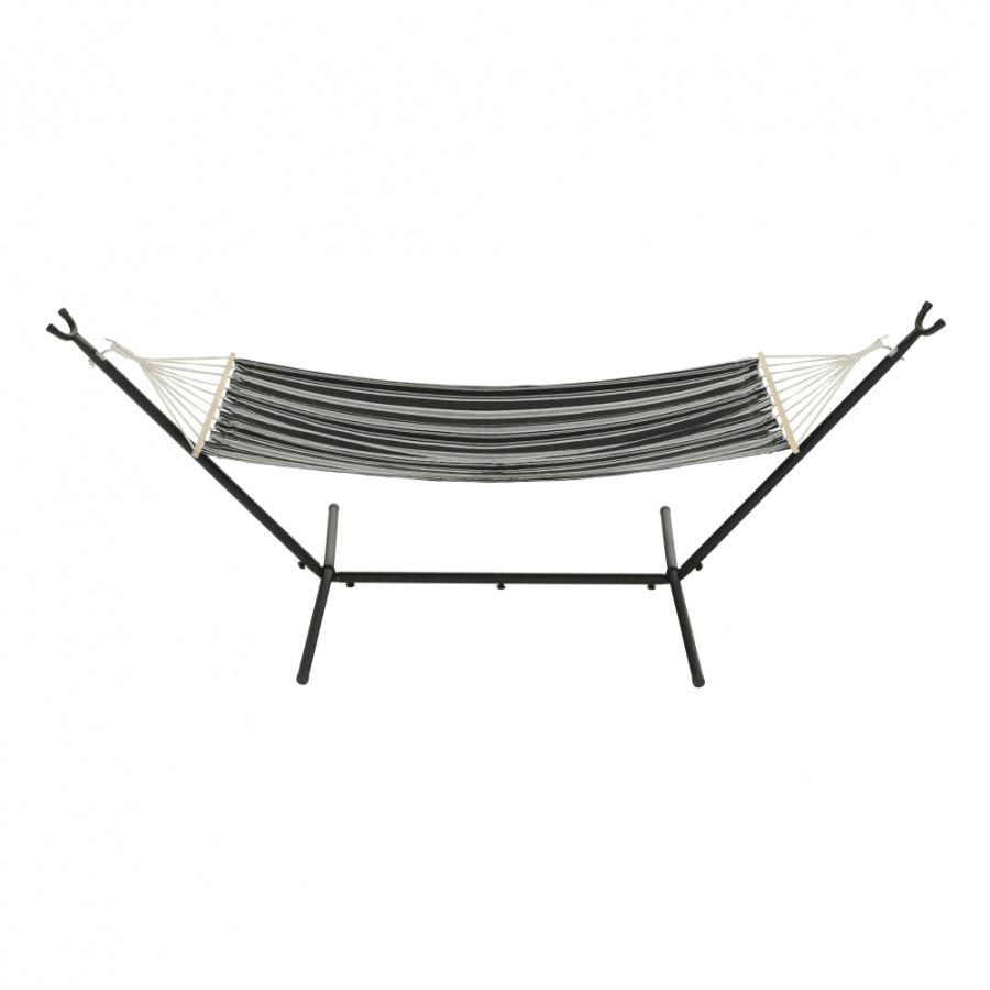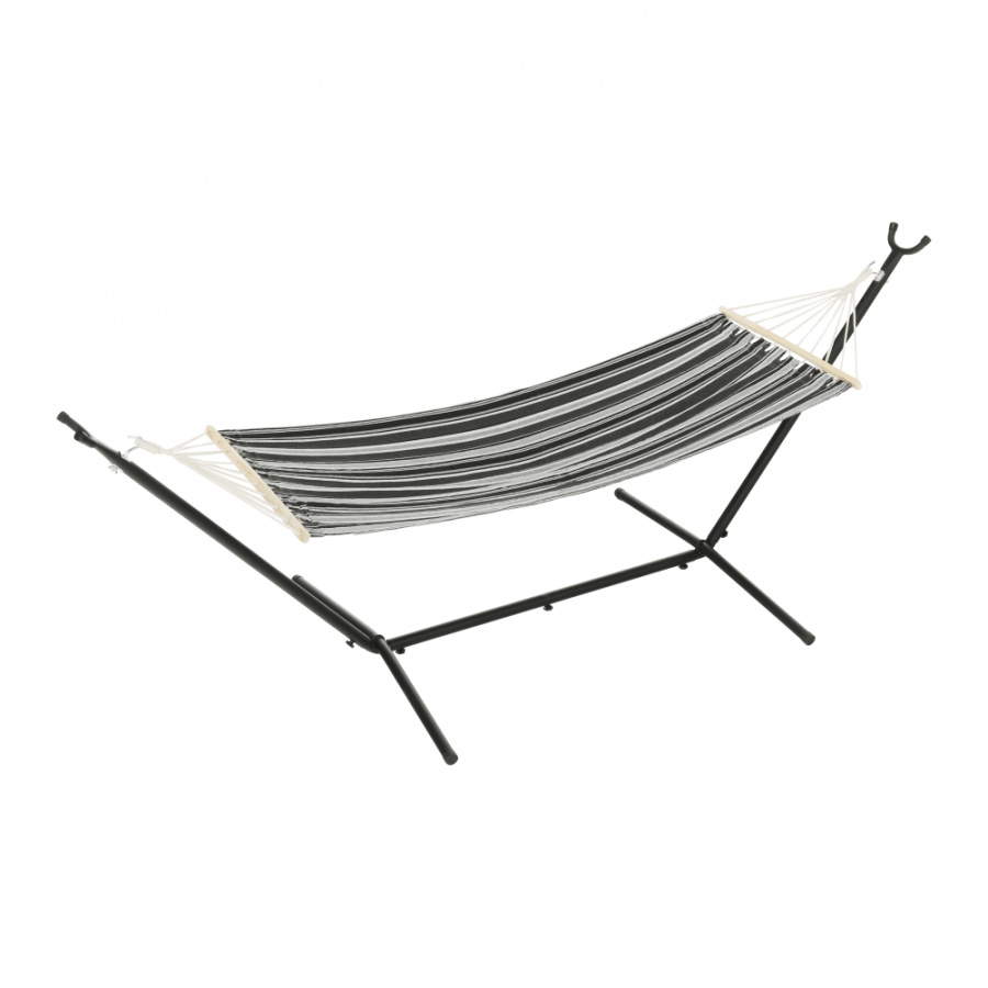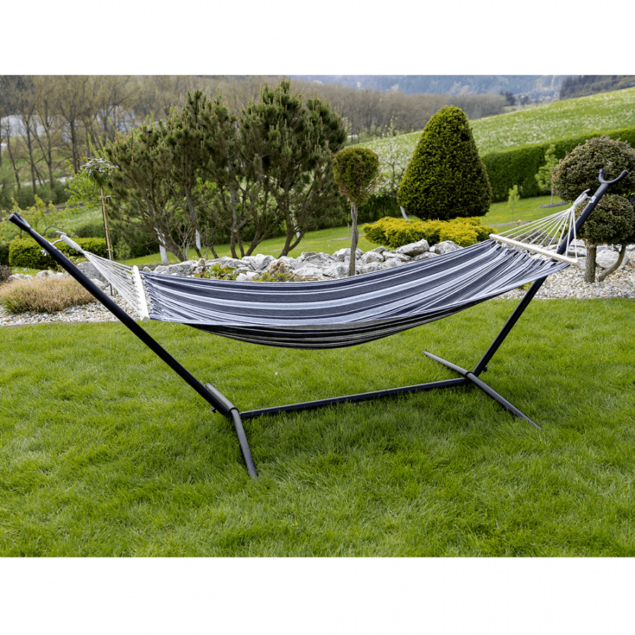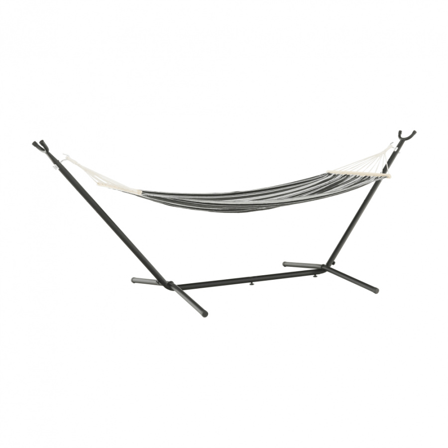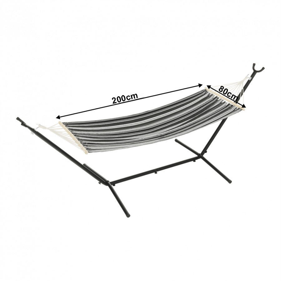 Materiál: 50% bavlna / 50% polyester / dřevo Barva: šedá / bílá Rozměr (ŠxD): 80x200 cm Nosnost: 120 kg Vhodná pro 1 osobu Vhodné do interiéru i exteriéru Stojan není součástí balení, můžete si doobjednat Dodávané v demontu