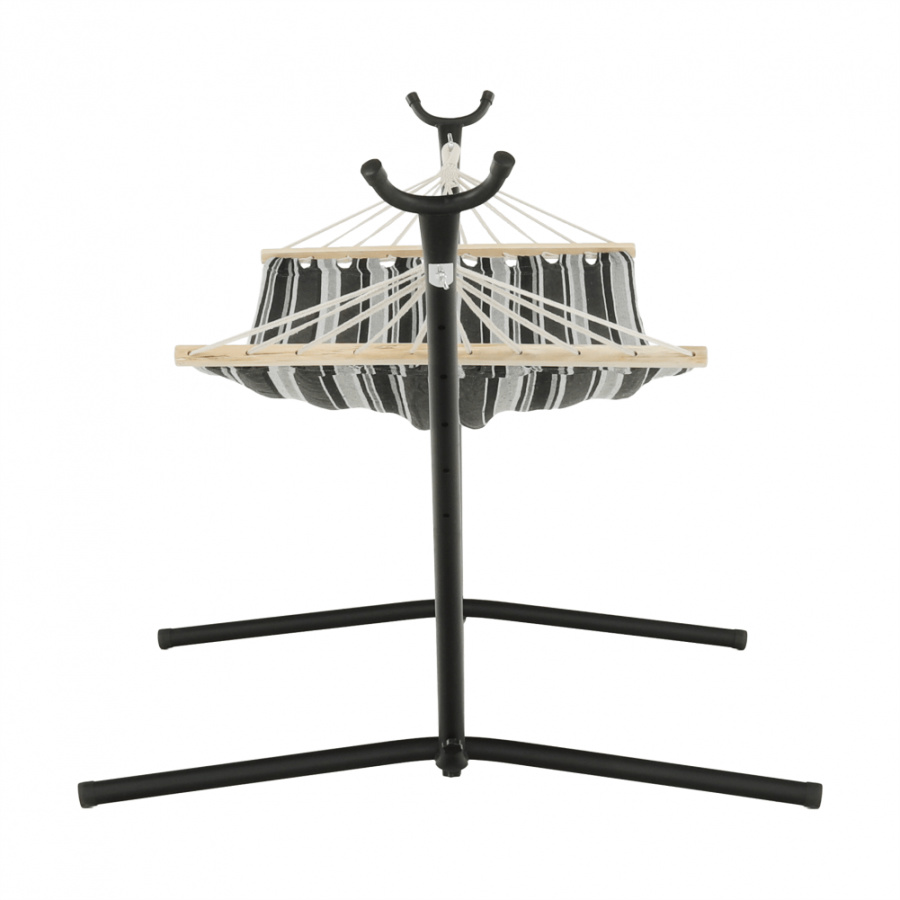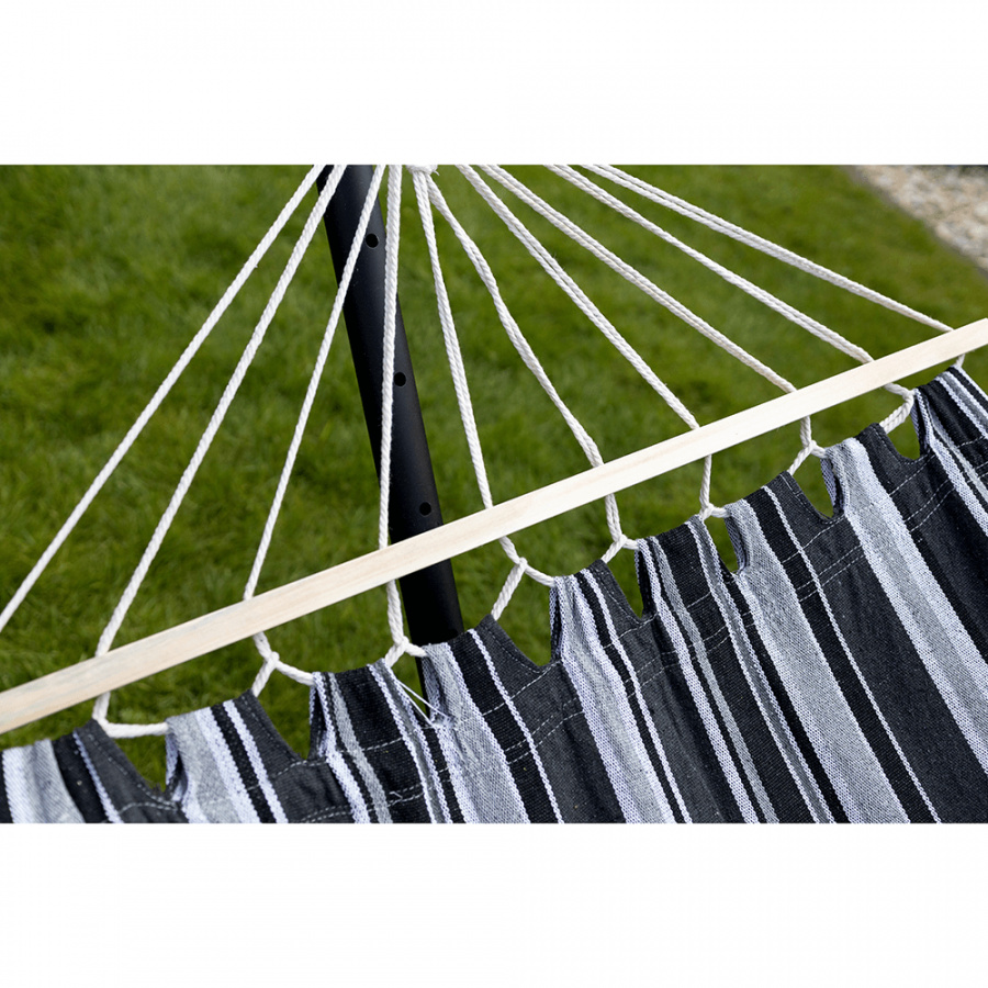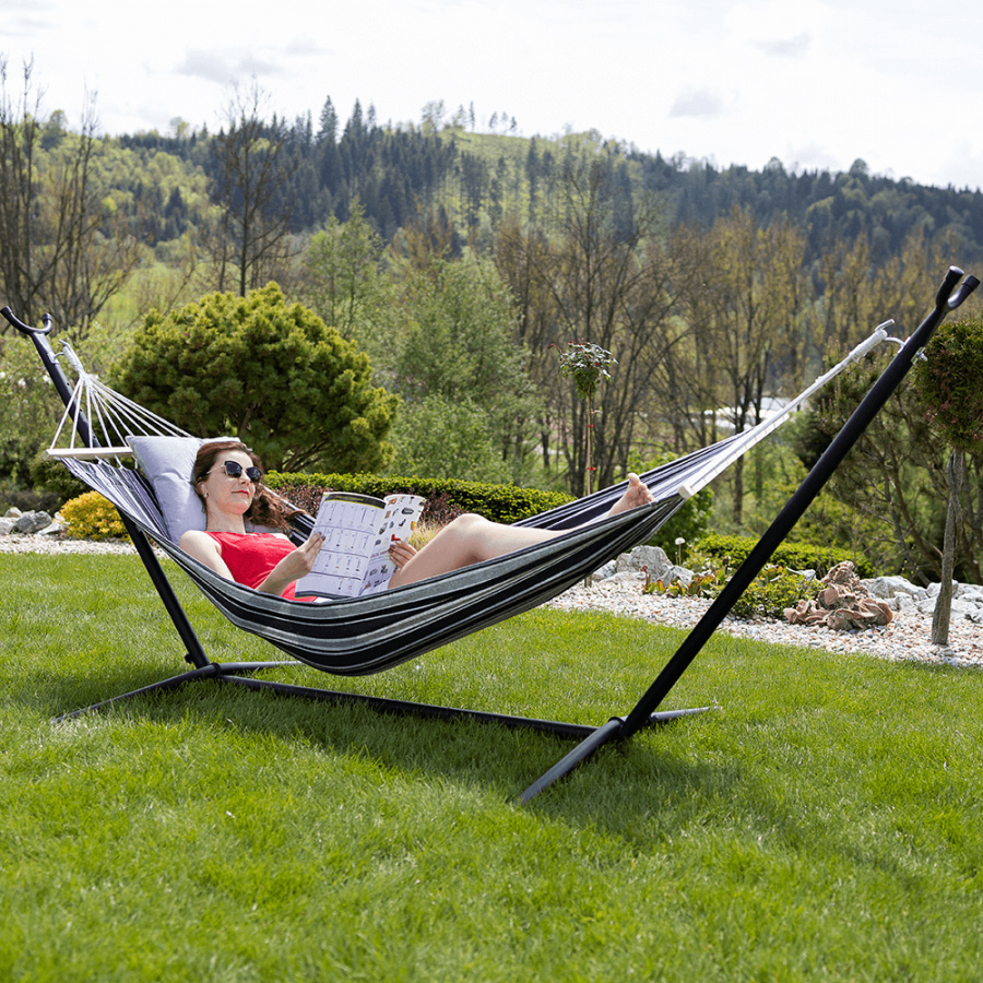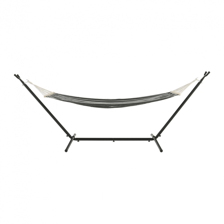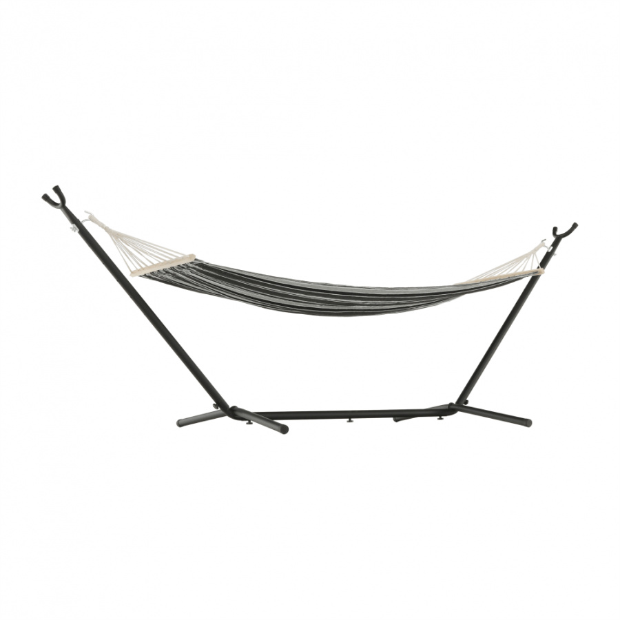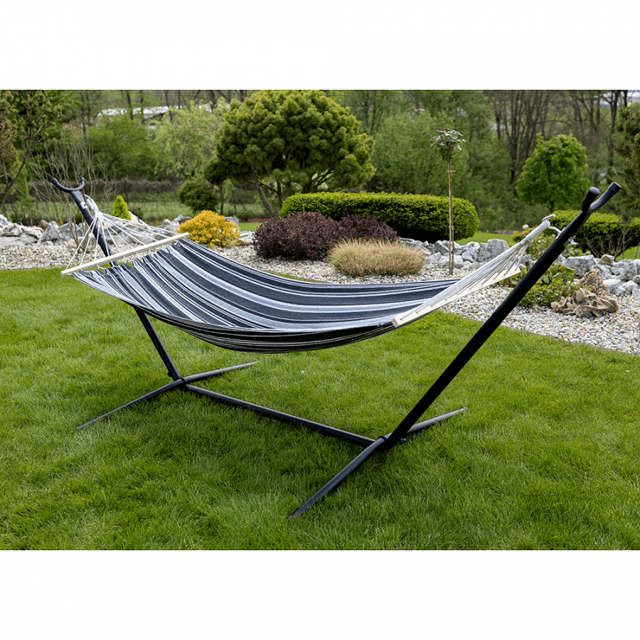 Materiál: 50% bavlna / 50% polyester / dřevo Barva: šedá / bílá Rozměr (ŠxD): 80x200 cm Nosnost: 120 kg Vhodná pro 1 osobu Vhodné do interiéru i exteriéru Stojan není součástí balení, můžete si doobjednat Dodávané v demontu