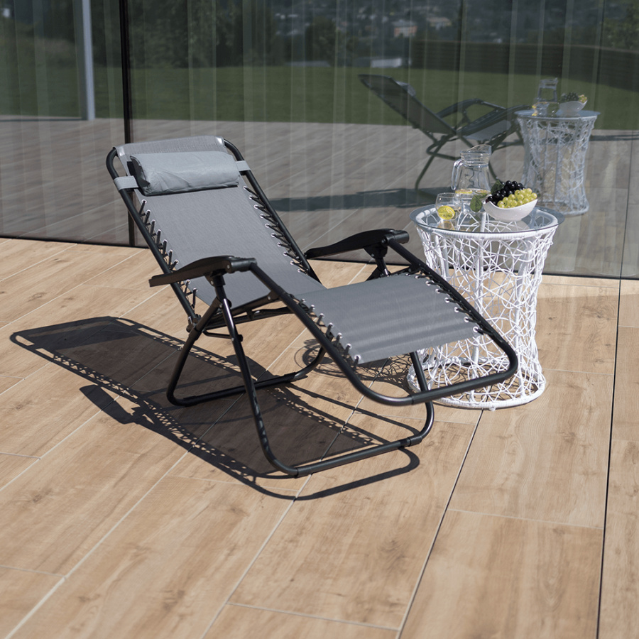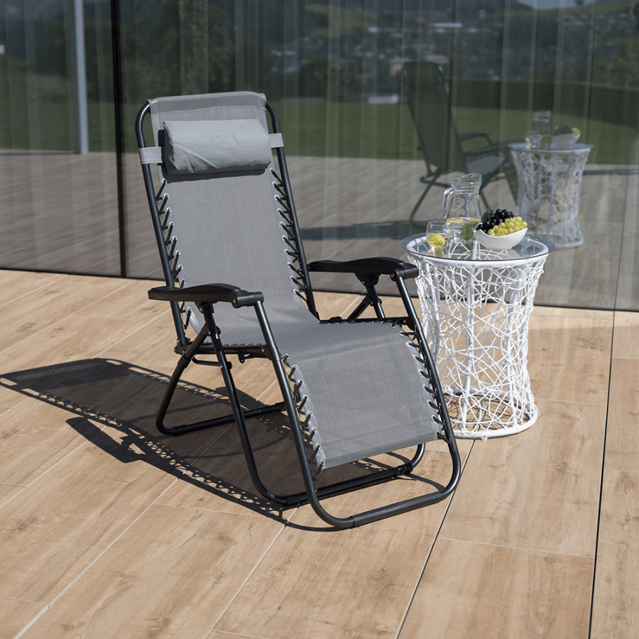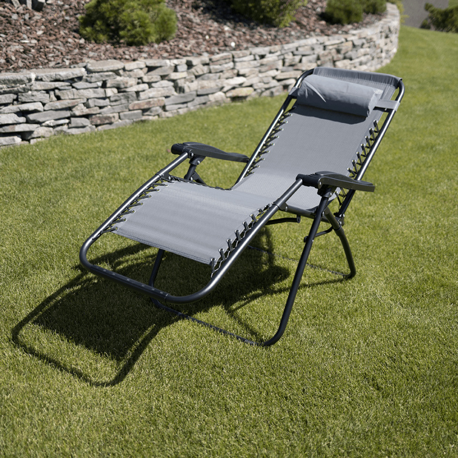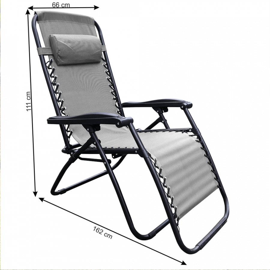 Zahradní polohovatelné křeslo Barva: světlešedá Materiál: síťovina / ocel Rozměry (ŠxHxV): 66x162x111 cm Výška sedu: 50 cm Hloubka sedu: 50 cm Nosnost: 100 kg Dodávané v montu.