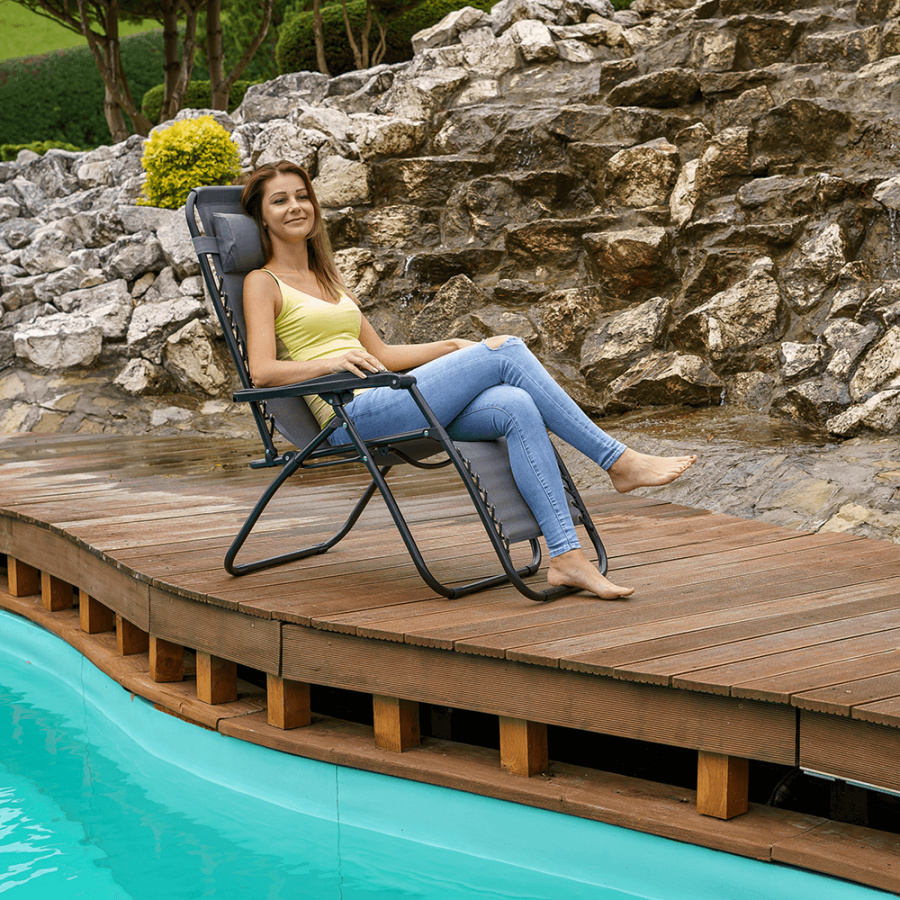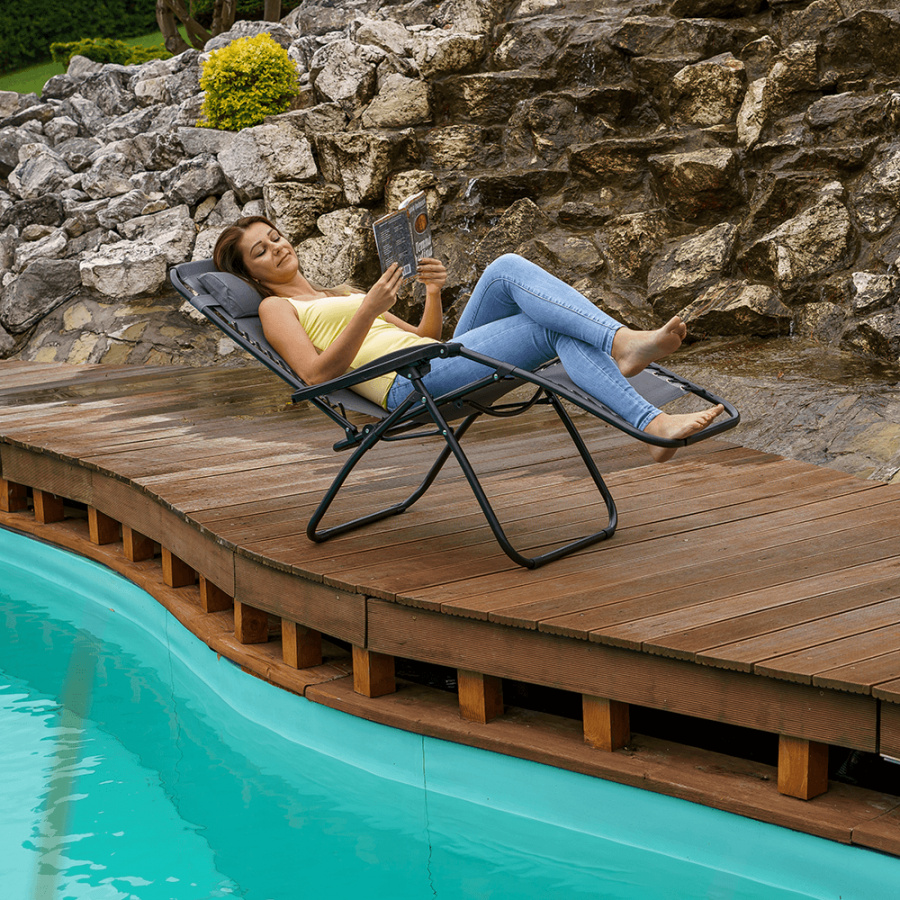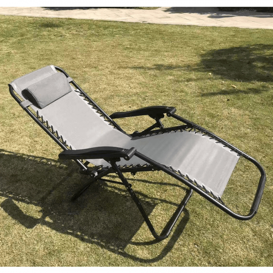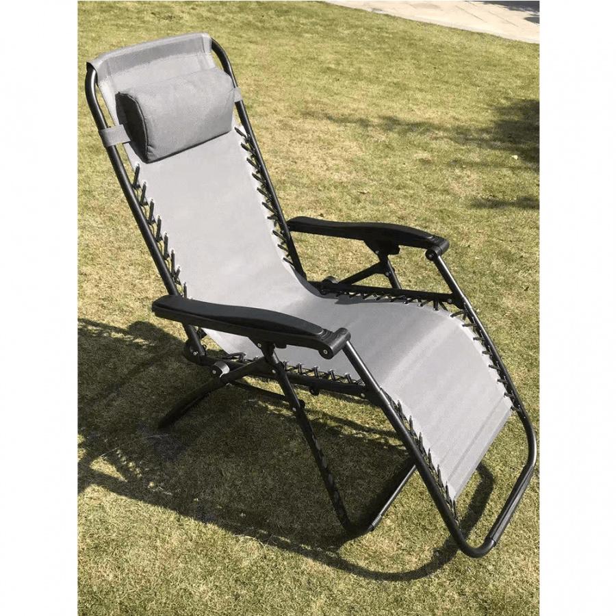 Zahradní polohovatelné křeslo Barva: světlešedá Materiál: síťovina / ocel Rozměry (ŠxHxV): 66x162x111 cm Výška sedu: 50 cm Hloubka sedu: 50 cm Nosnost: 100 kg Dodávané v montu.