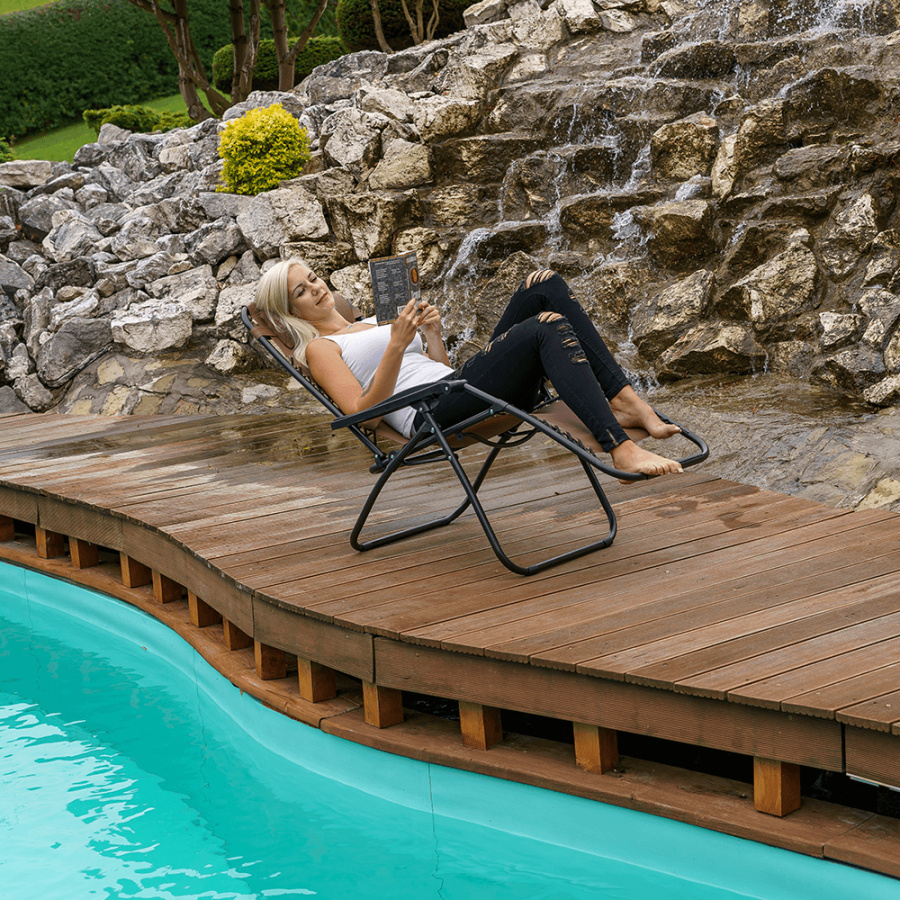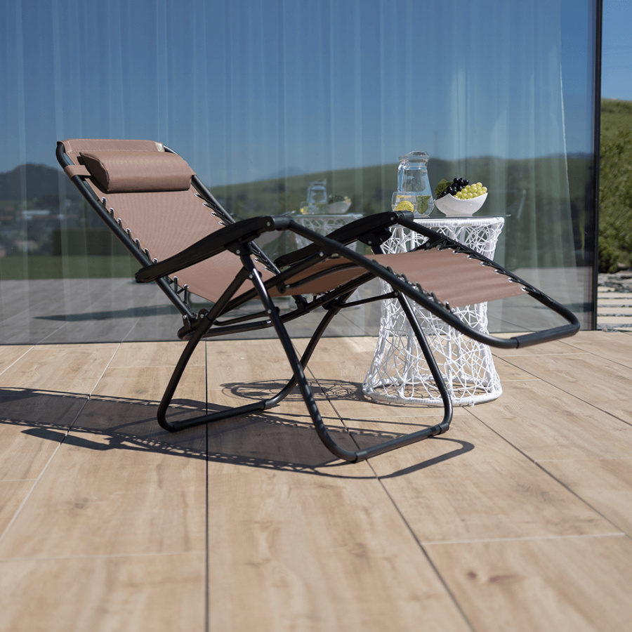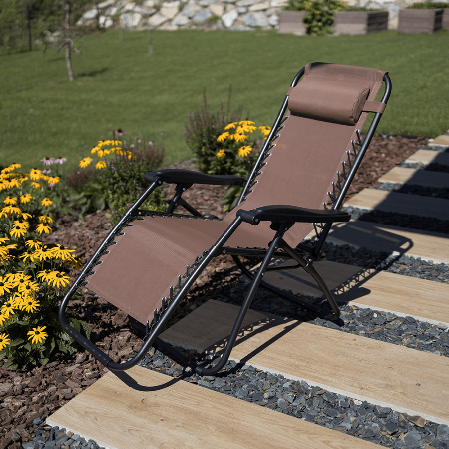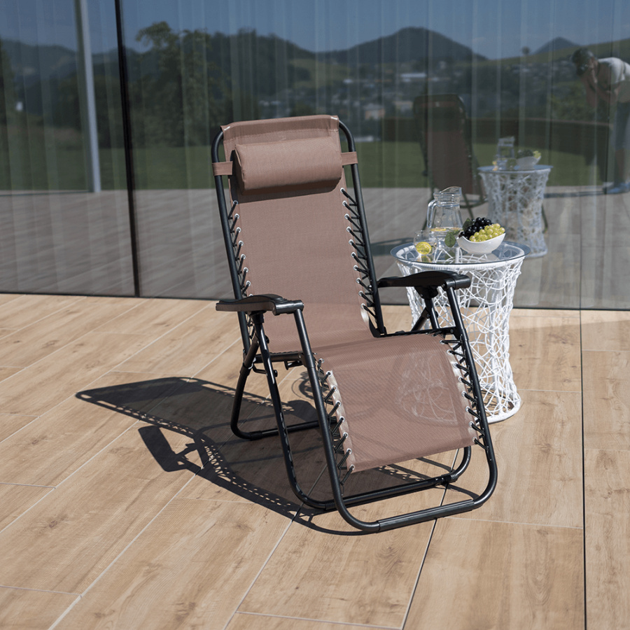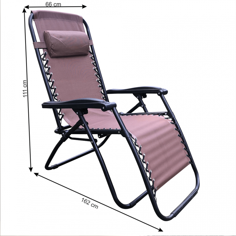 Zahradní polohovatelné křeslo Barva: světlehnědá Materiál: síťovina / ocel Rozměry (ŠxHxV): 66x162x111 cm Výška sedu: 50 cm Hloubka sedu: 50 cm Nosnost: 100 kg Dodávané v montu.