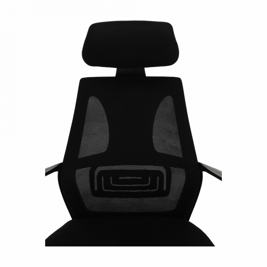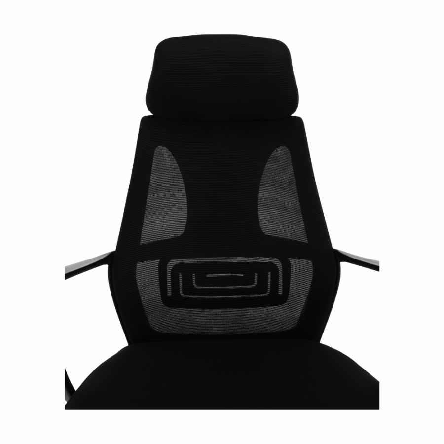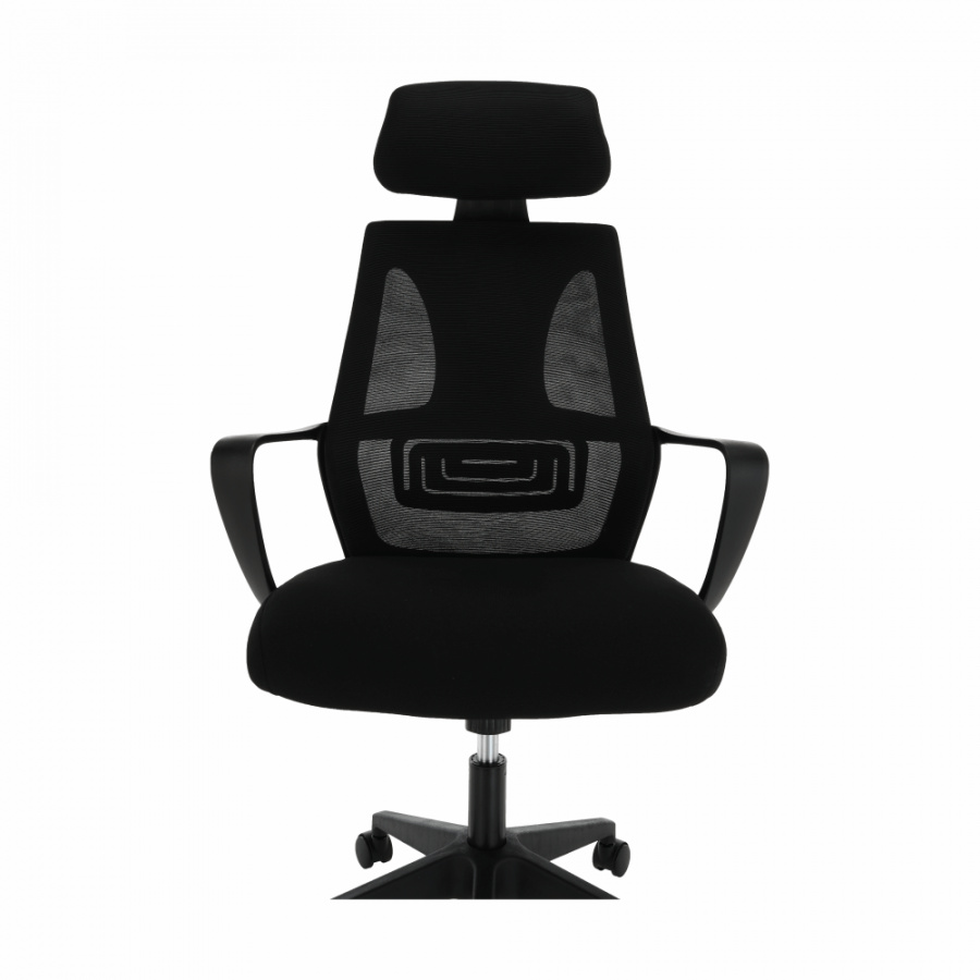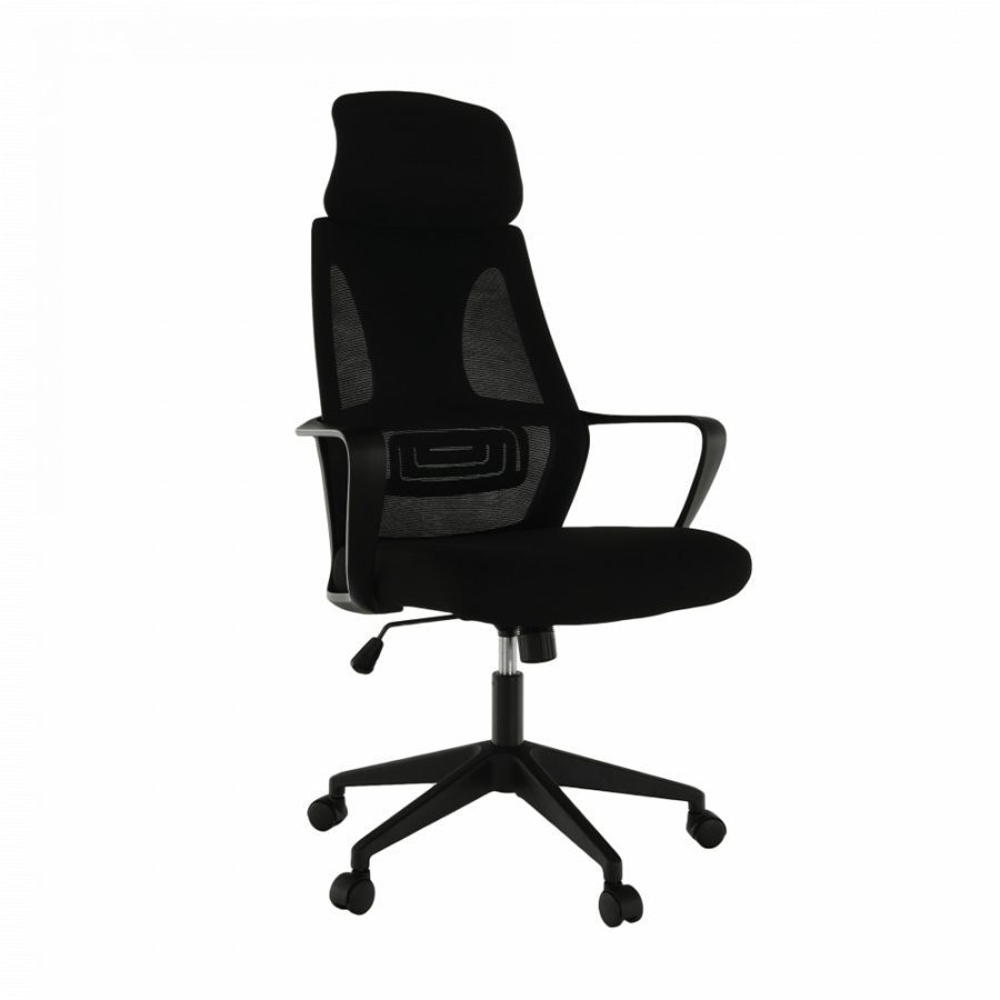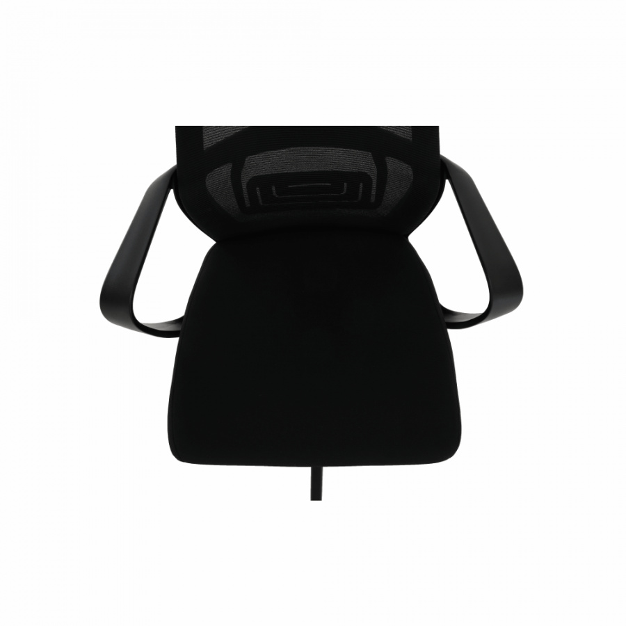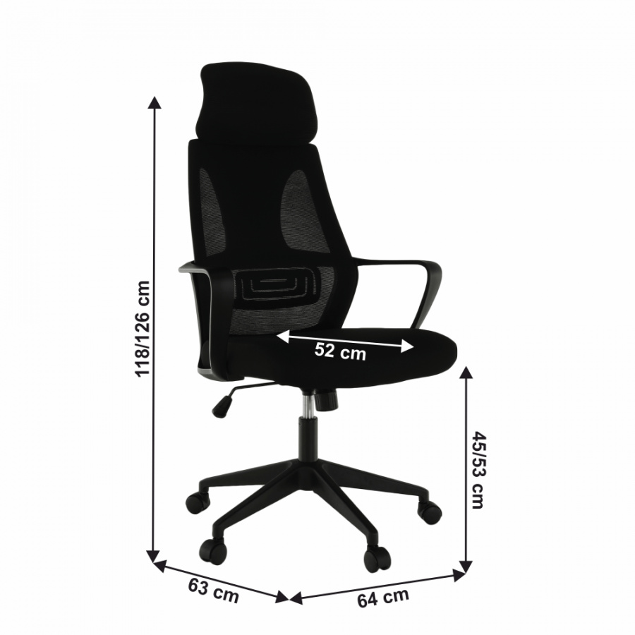 Materiál: látka / plast Barva: černá Rozměry (ŠxHxV): 64x63x118-126 cm Nastavitelná výška sedu: 45-53 cm Hloubka sedu: 52 cm Šířka sedu: 50 cm Výška zádové opěrky: 76-79,5 cm Šířka zádové opěrky: 49 cm Nosnost: 110 kg S opěrkou hlavy S opěrkou na ruce mechanismus houpání plastová podstava Dodávané v demontu