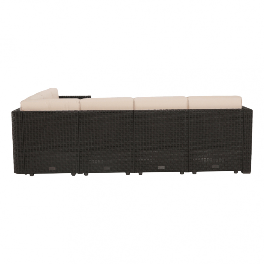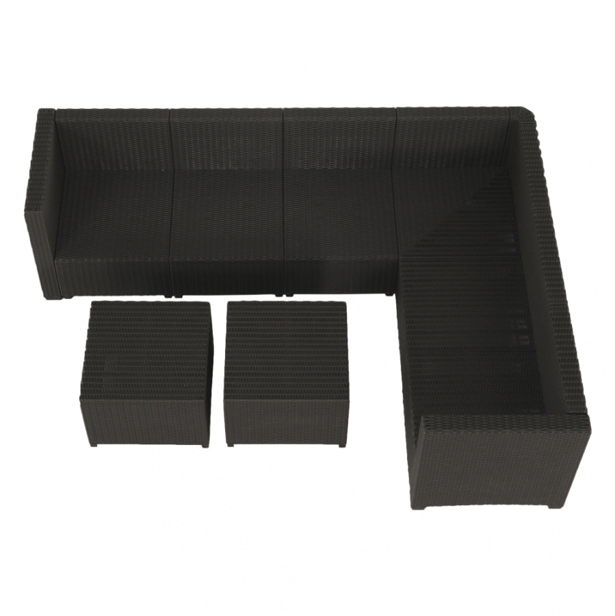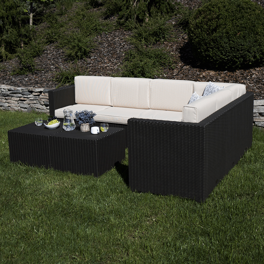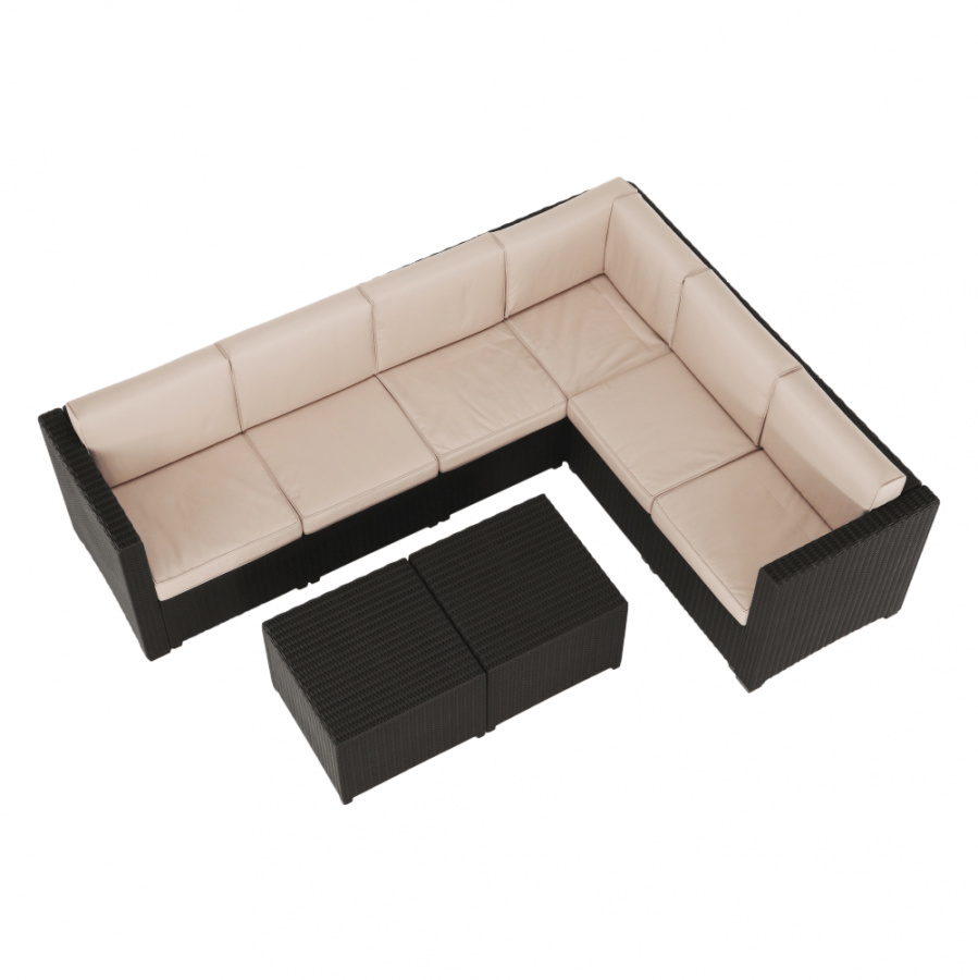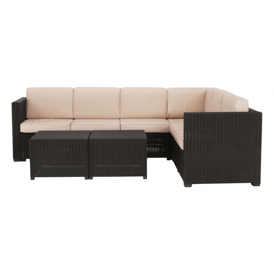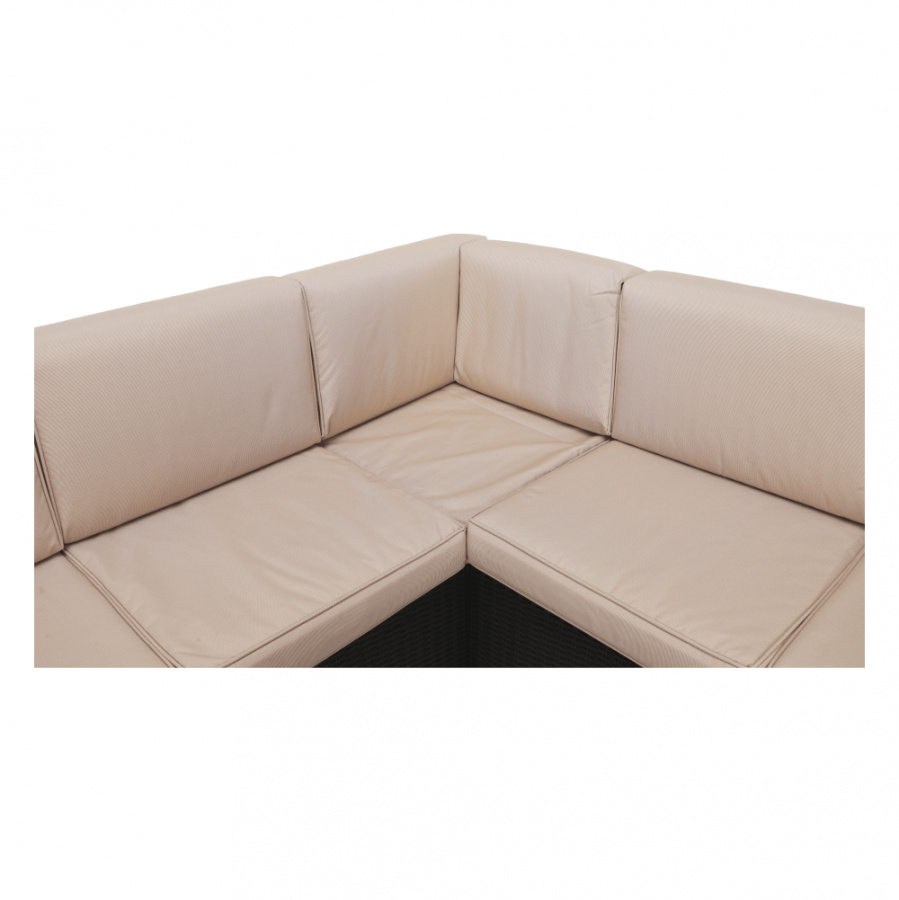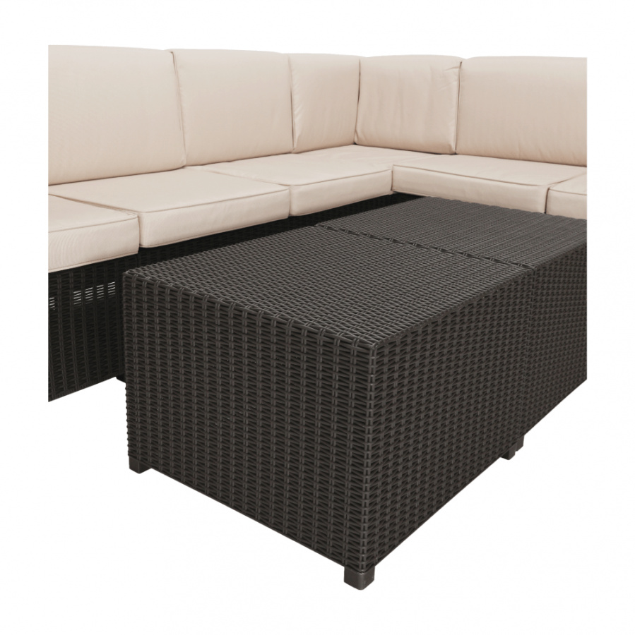 Materiál: umělý ratan / látka / pěna Barva: hnědá / béžová Rozměry roh (ŠxHxV): 246,6 / 190,6x69,5x67,5 / 80 cm Výška sedu: 41,5 cm Hloubka sedu: 51 cm Rozměry stůl (ŠxHxV): 56x56x40 cm Tloušťka polštáře: 9 cm 3-dílný set S polštáři 2 konferenční stolky Potahy nejsou snímatelné Dodávané v demontu.