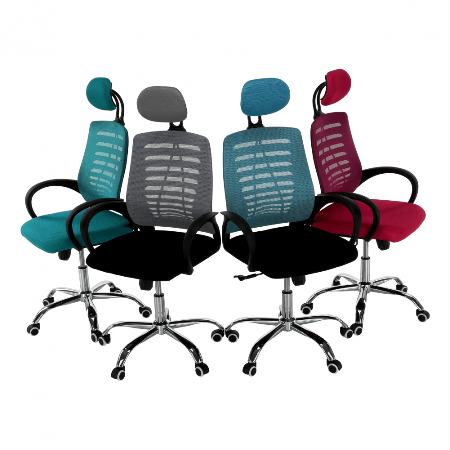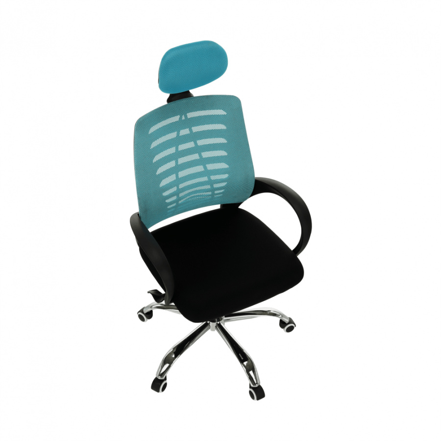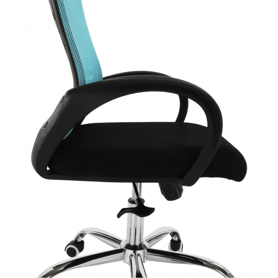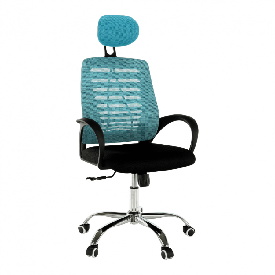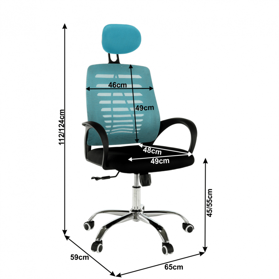 Materiál: látka / kov Barva: modrá / černá Rozměry (ŠxHxV): 65x59x112-124 cm Nastavitelná výška sedu: 45-55 cm Hloubka sedu: 48 cm Šířka sedu: 49 cm Šířka zádové opěrky: 46 cm Výška zádové opěrky (bez opěrky hlavy): 49 cm Nosnost: 110 kg S chromovou podstavou. Pogumované kolečka vhodné na dřevěné nebo plovoucí podlahy. Dodávány v demontu.