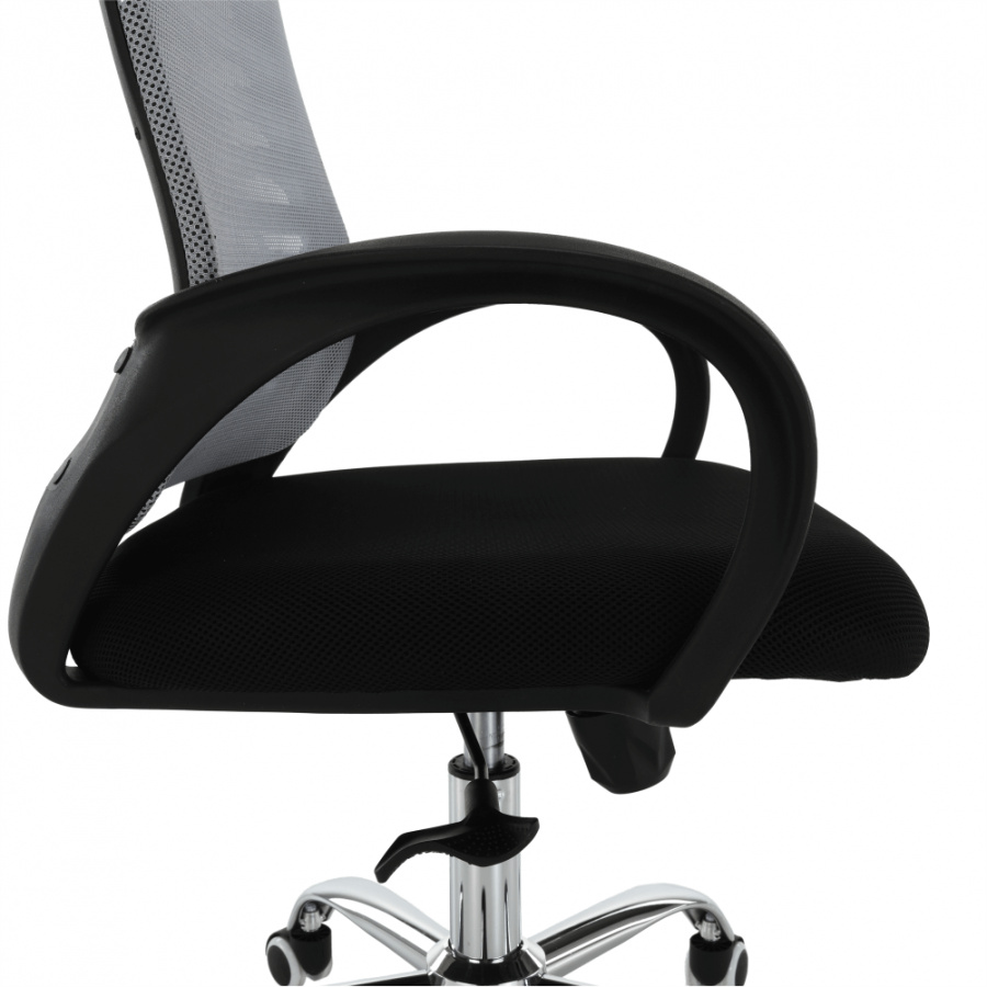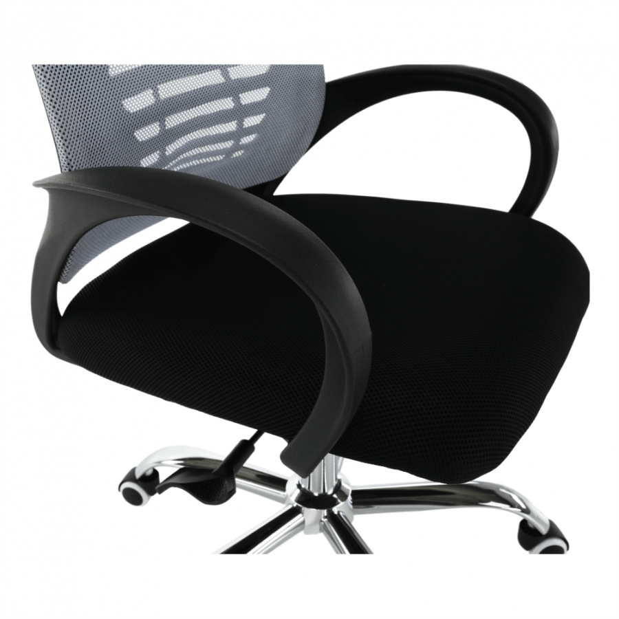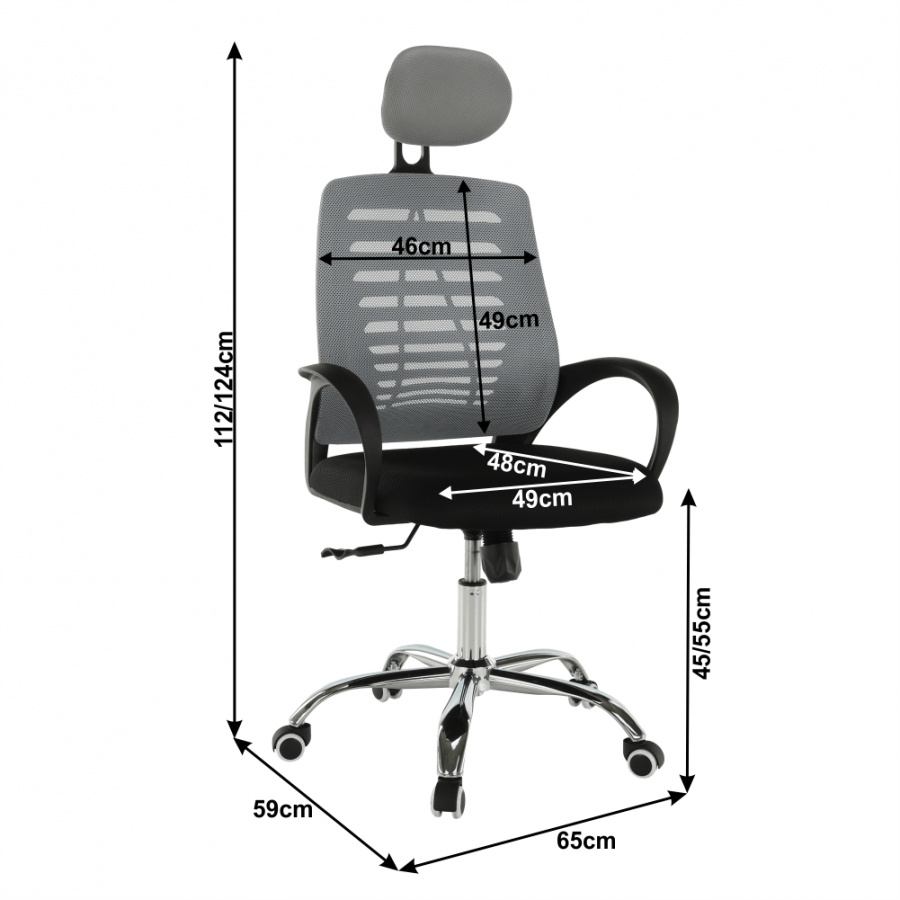 Materiál: látka / plast / kov Barva: šedá / černá Rozměry (ŠxHxV): 65x59x112-124 cm Nastavitelná výška sedu: 45-55 cm Hloubka sedu: 48 cm Šířka sedu: 49 cm Výška zádové opěrky (bez opěrky hlavy): 49 cm Šířka zádové opěrky: 46 cm Nosnost: 110 kg S opěrkou hlavy S područkami mechanismus houpání chromová podstava pogumovaná kolečka Vhodné na dřevěnou nebo plovoucí podlahu Dodávané v demontu