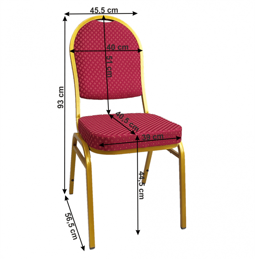 Barva: červená látka / zlatý nátěr Rozměry (ŠxHxV): 45,5x56,5x93 cm Výška sedu: 44,5 cm Hloubka sedu: 40,5 cm Šířka sedu: 39 cm Šířka zádové opěrky: 40 cm Výška zádové opěrky: 51 cm Nosnost: 120 kg Dodávané v monte. Při koupi více než 20 kusů židle JEFF 3 NEW je cena židle úžasných 729 Kč.