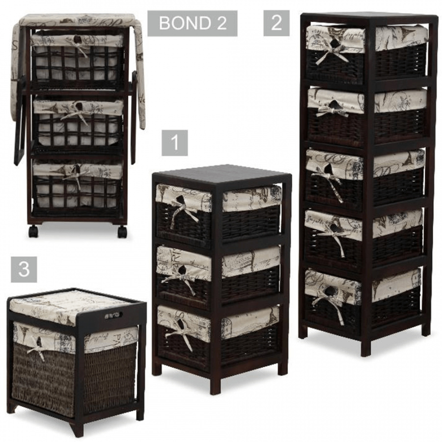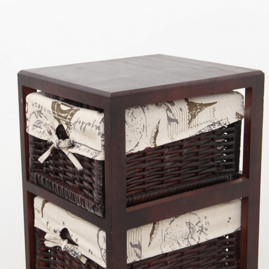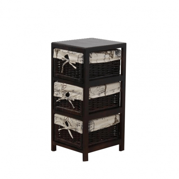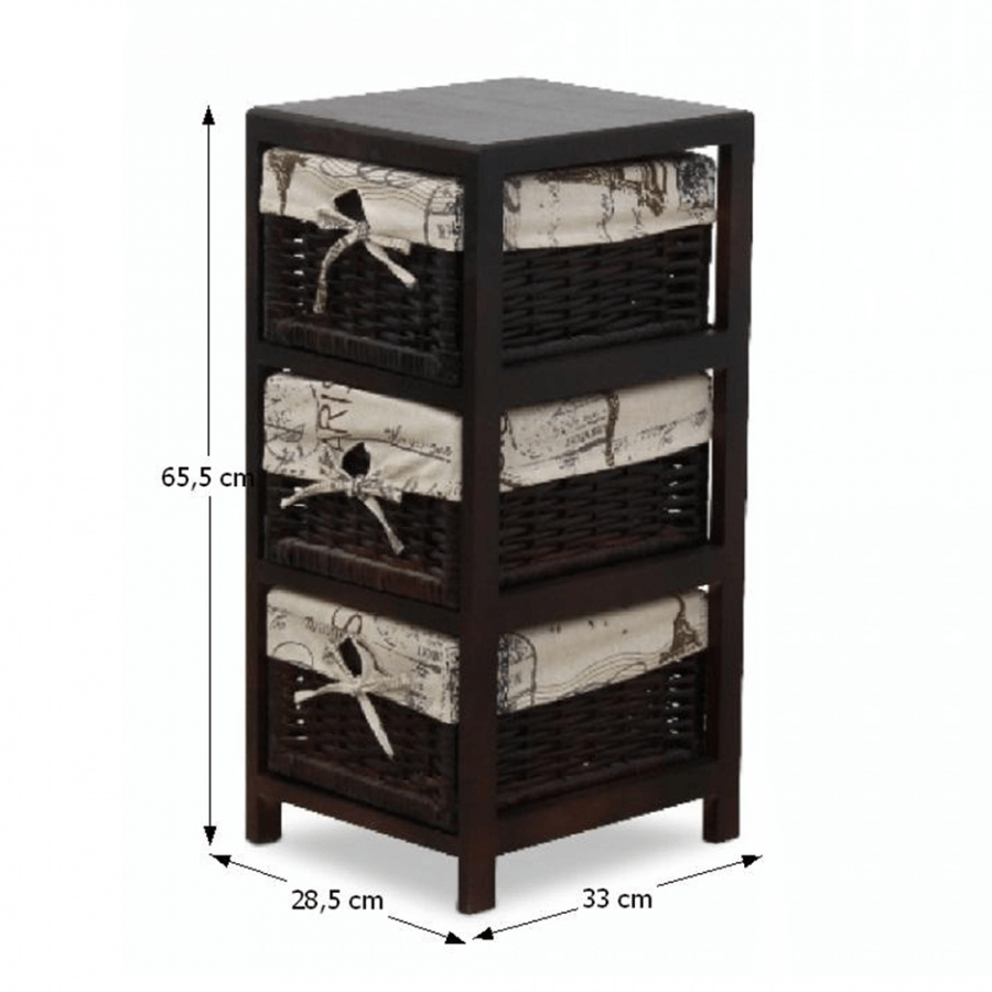 komoda s 3 proutěnými košíky v pevném dřevěném rámu, provedení tmavě hnědá, materiál: dřevo / pruty, rozměry ŠxVxH: 28,5x65,5x33 cm.