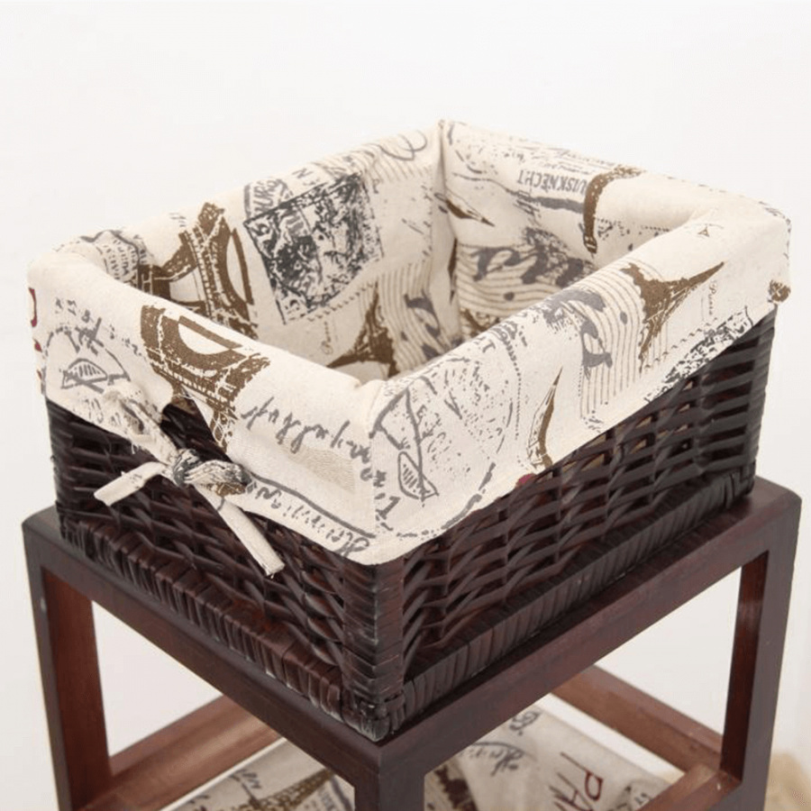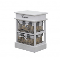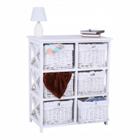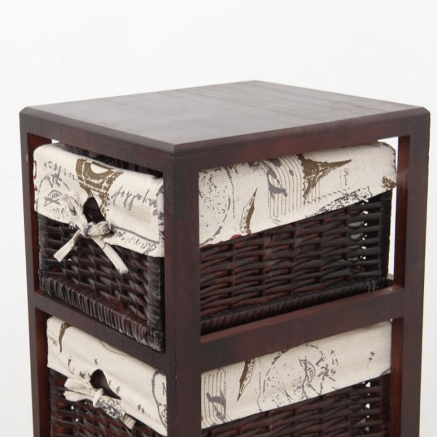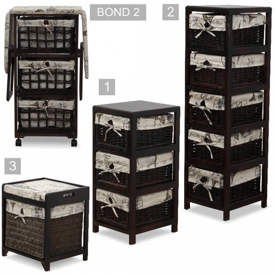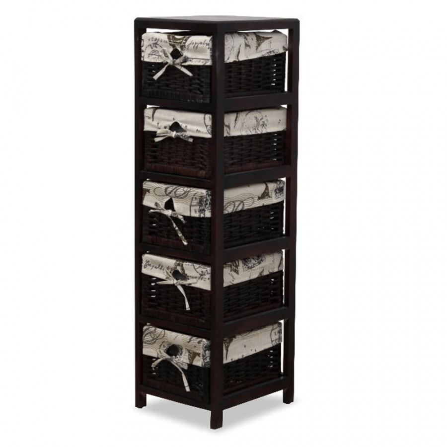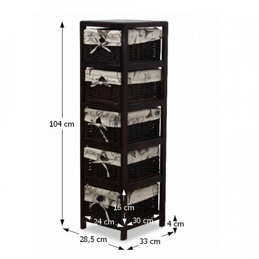 komoda s 5 proutěnými košíky v pevném dřevěném rámu, provedení tmavě hnědá, materiál: dřevo / pruty, rozměry ŠxVxH: 28,5x104x33 cm.