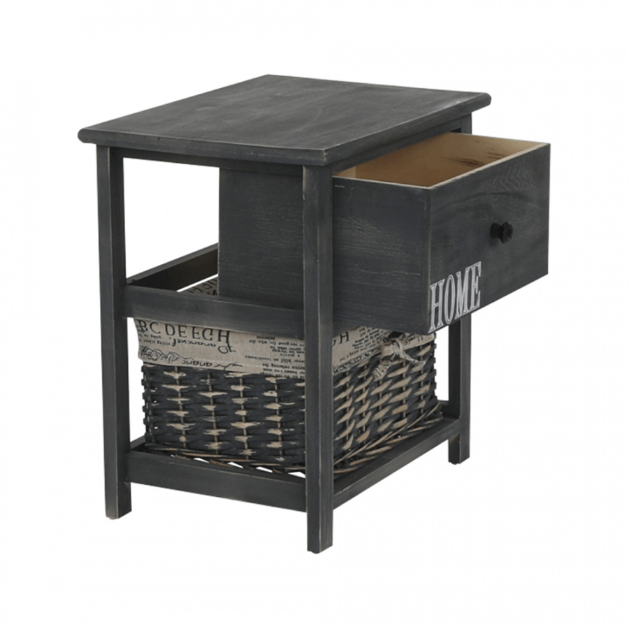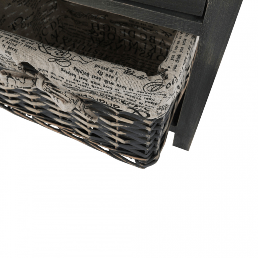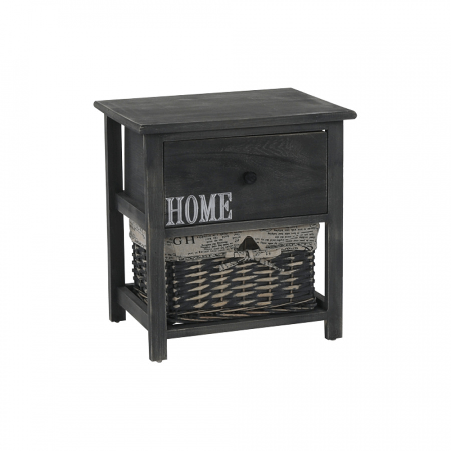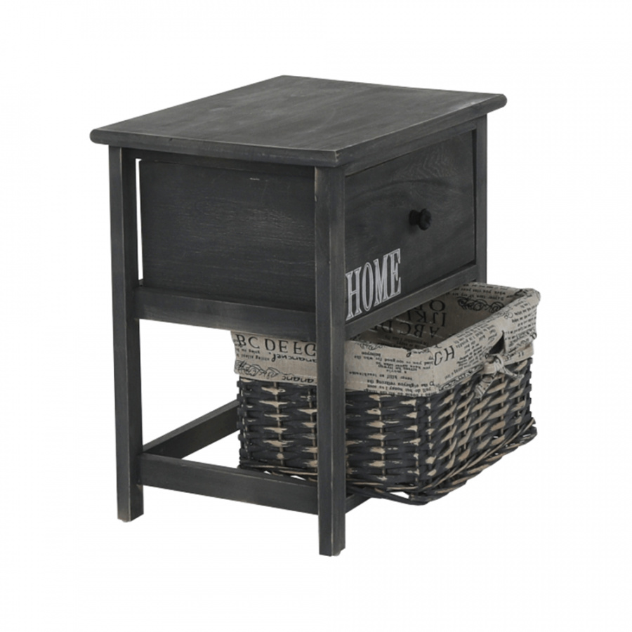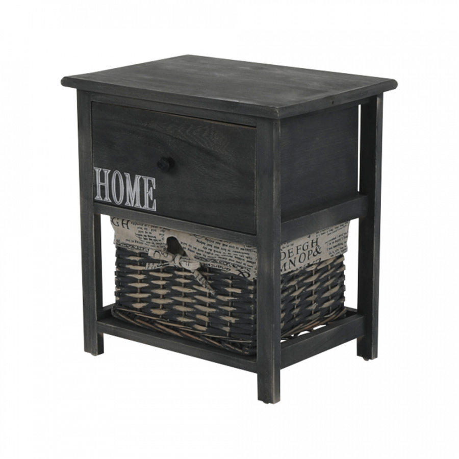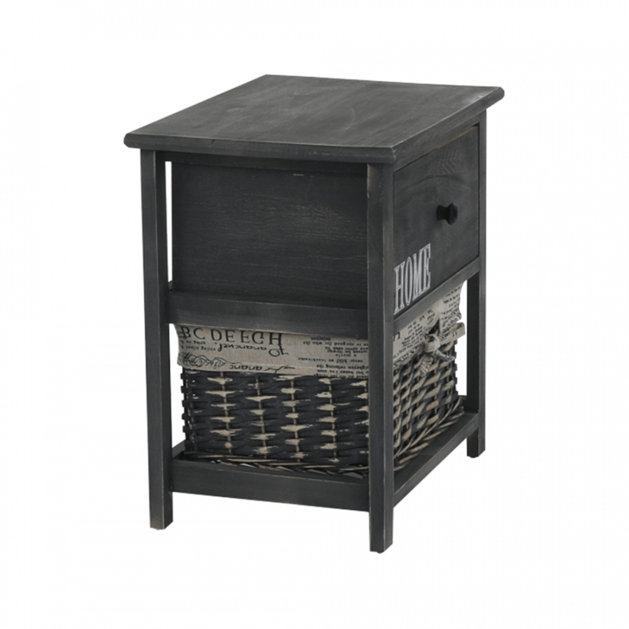 komoda (případně noční stolek) s pevným rámem, s funkční zásuvkou a proutěným košíkem, materiál: dřevo / proutí, barevné provedení: tmavě hnědá, ŠxVxH: 40x42x29 cm.