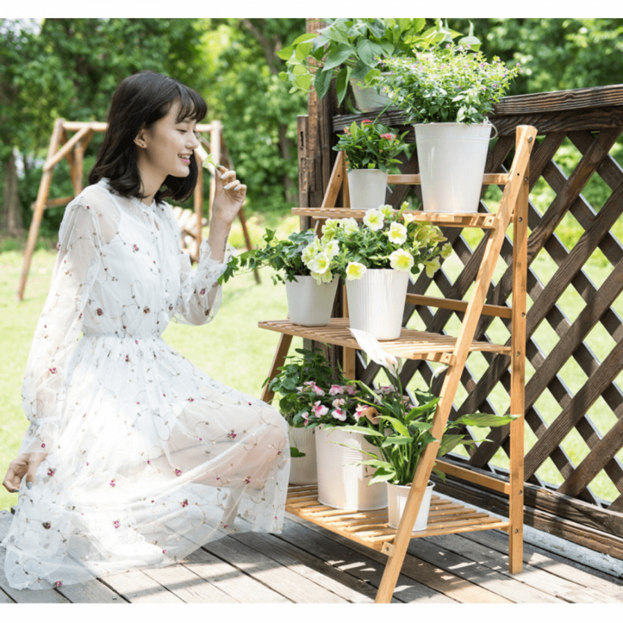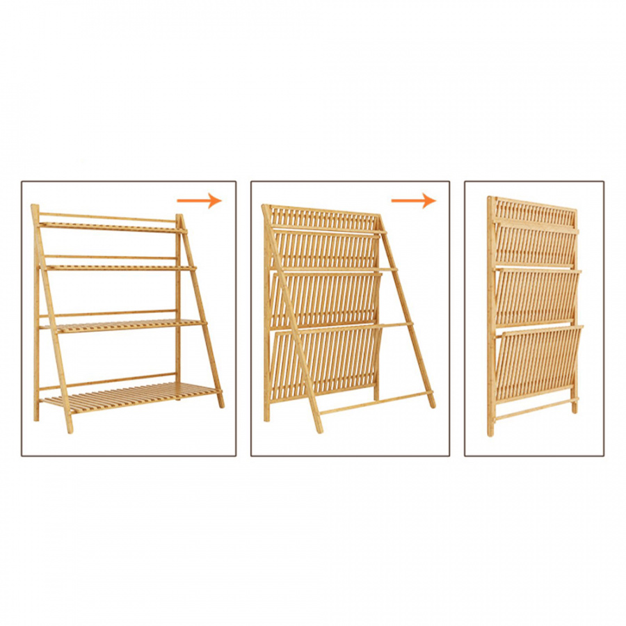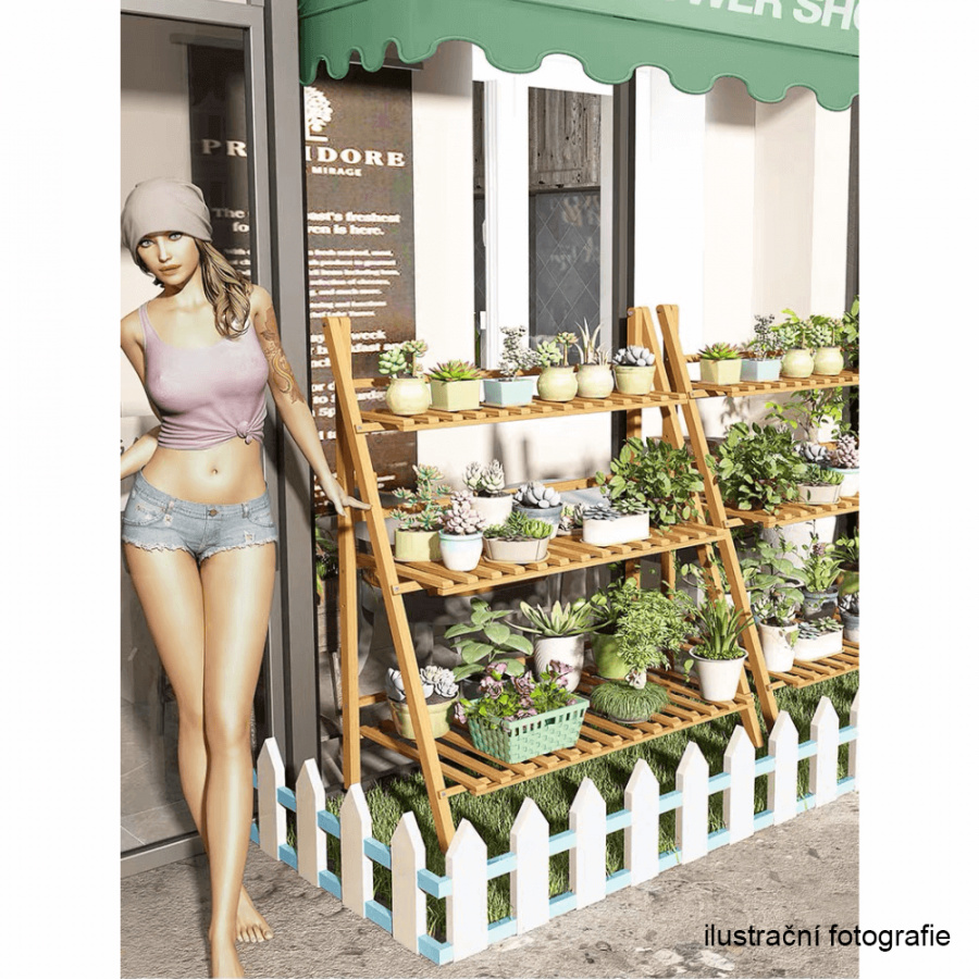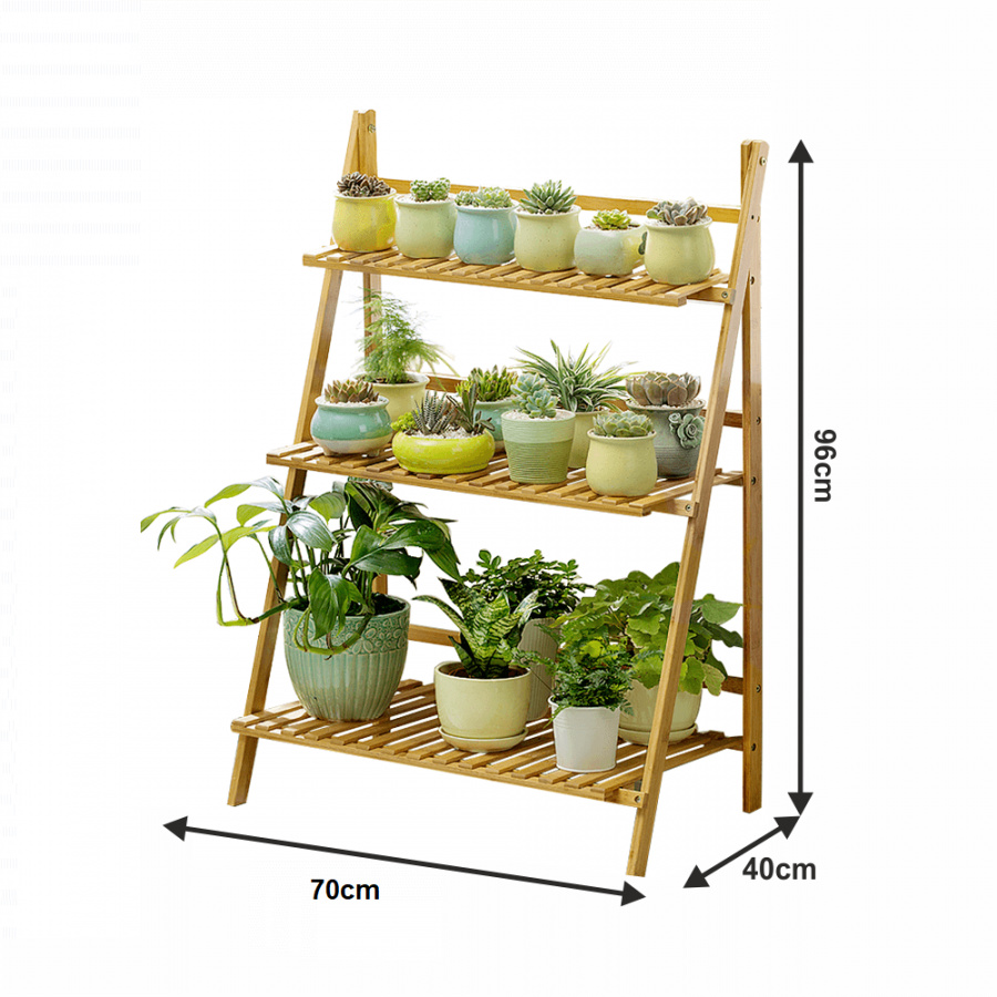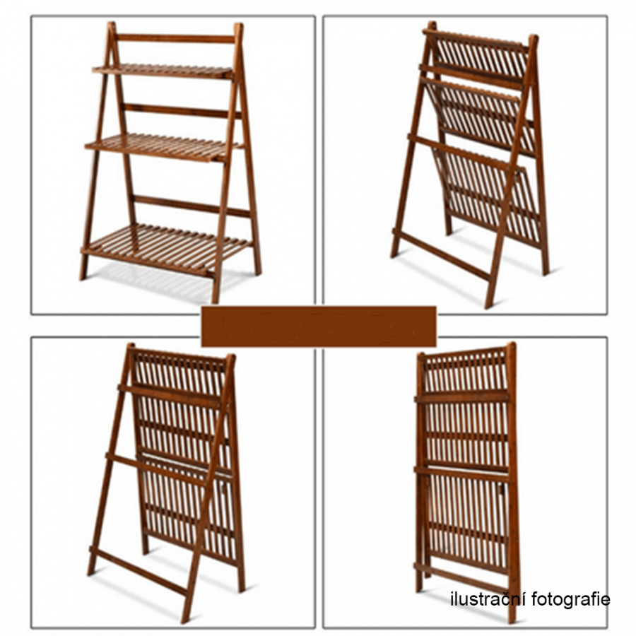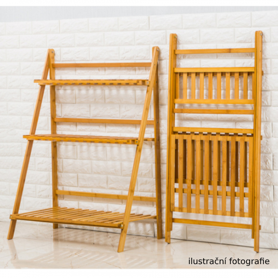 Materiál: bambus Barva: bambus Rozměry (ŠxHxV): 70x40x96 cm Nosnost na polici: 10 kg tři police Skládací Složený nezabere mnoho místa Jeden pár rukavic grátis Set ručního zahradního nářadí grátis Vhodný do interiéru i exteriéru Dodávané v demontu