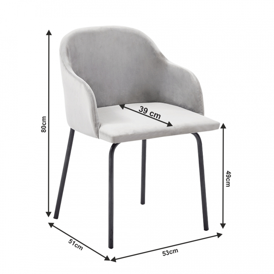 Jídelní křeslo díval Materiál: Velvet látka / kov Barva: šedá / černá Rozměry (ŠxHxV): 53x51x80 cm Hloubka sedu: 49 cm Výška sedu: 39 cm designové Dodávané v demontu.