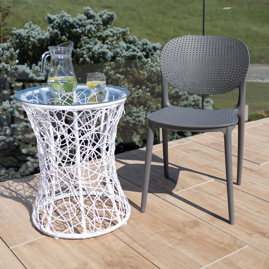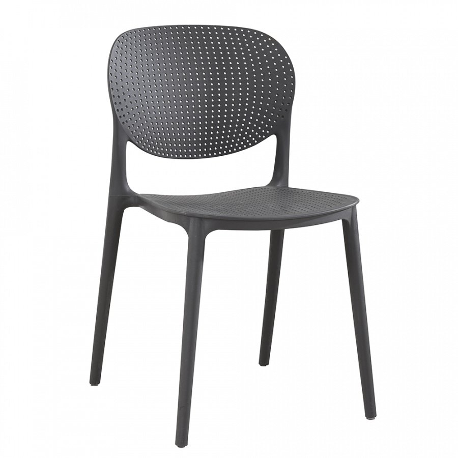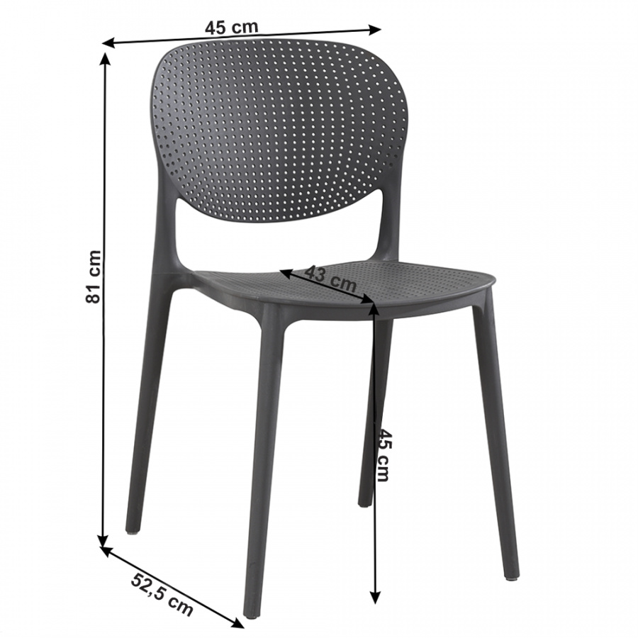 Materiál: plast Barva: tmavě šedá Rozměry (ŠxHxV): 45x52,5x81 cm Výška sedu: 45 cm Hloubka sedu: 43 cm stohovatelná Dodávané v monte