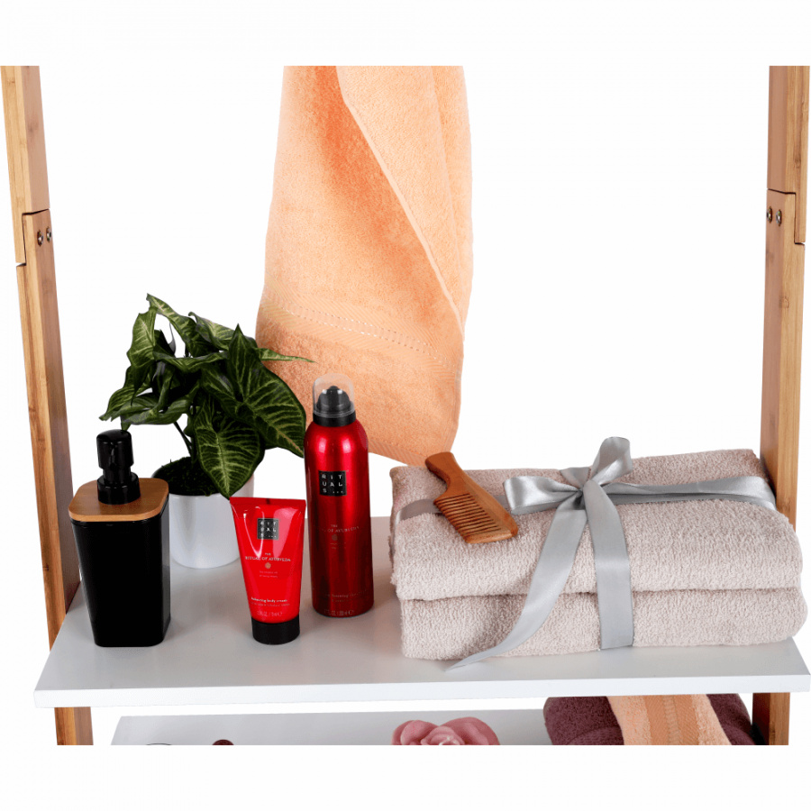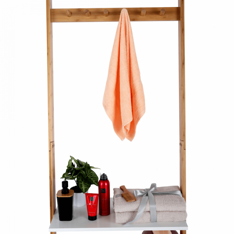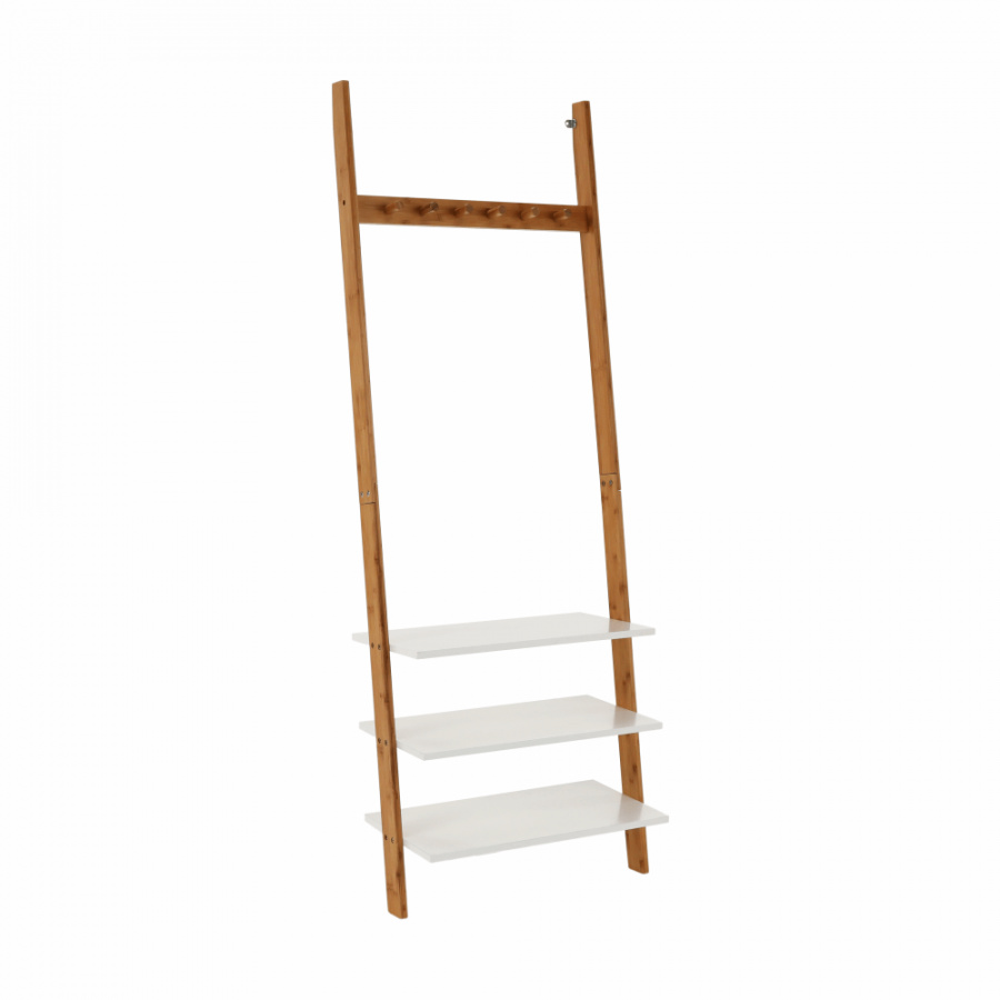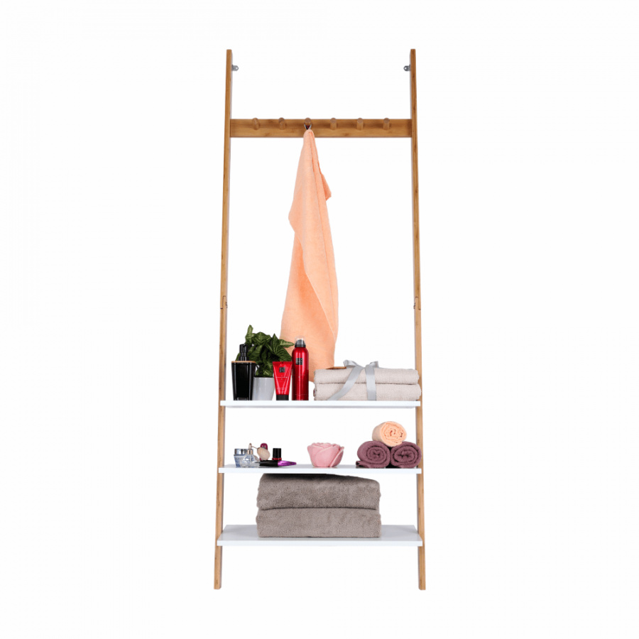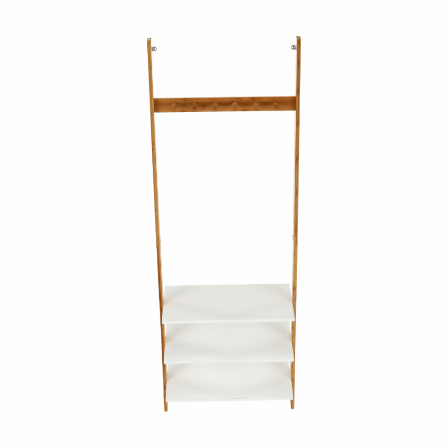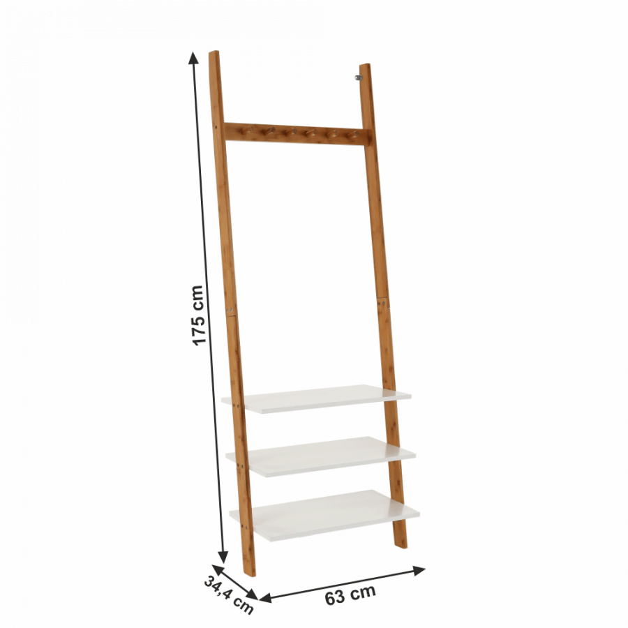 Věšák s policemi MARIKE TYP 2 Materiál: bambus lakovaný / MDF Barva: bílá / bambus Rozměr (ŠxHxV): 63x34,4x175 cm Nosnost na polici: 5 kg tři police šest háčků Není vhodný do exteriéru Dodávané v demontu