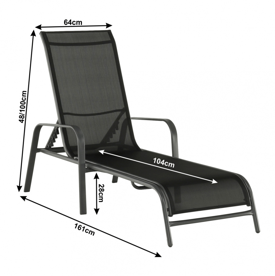 Materiál: látka / kov Provedení: černá / šedá Rozměry (ŠxHxV): 64x161x48 / 100 cm Výška sedu: 28 cm Hloubka sedu: 104 cm Celková hloubka po sklopení: 195 cm Nosnost: 90 kg polohovací S područkami Dodávané v demontu.