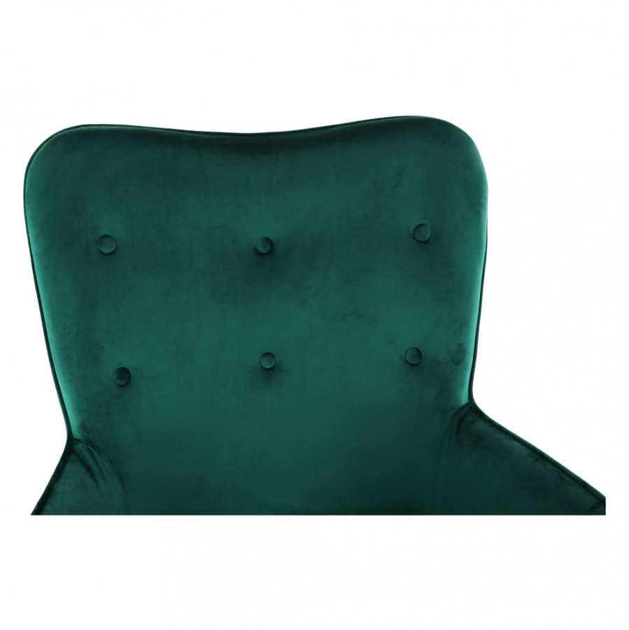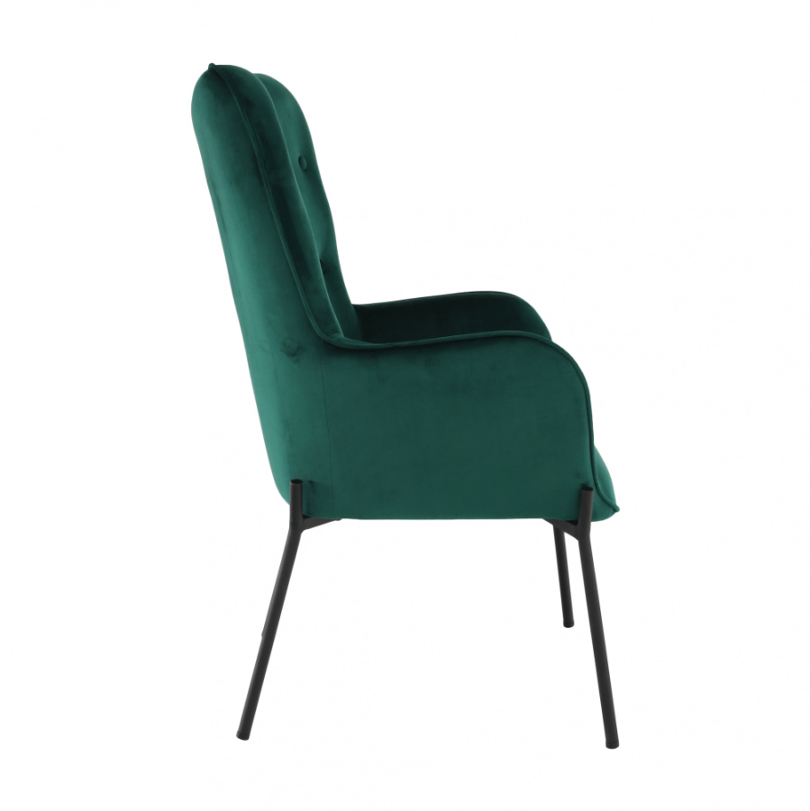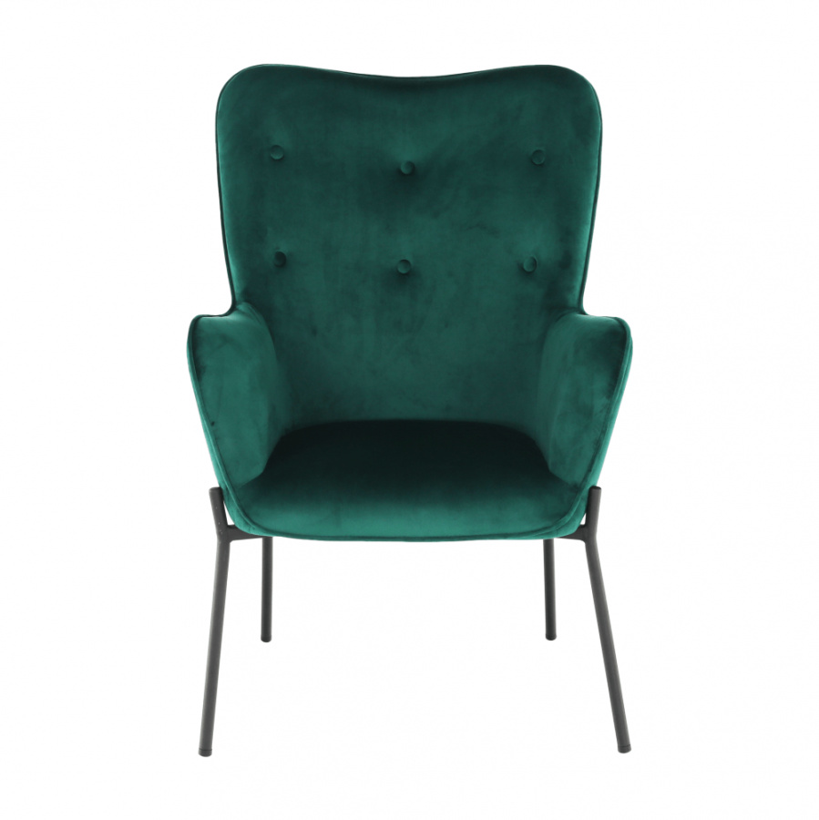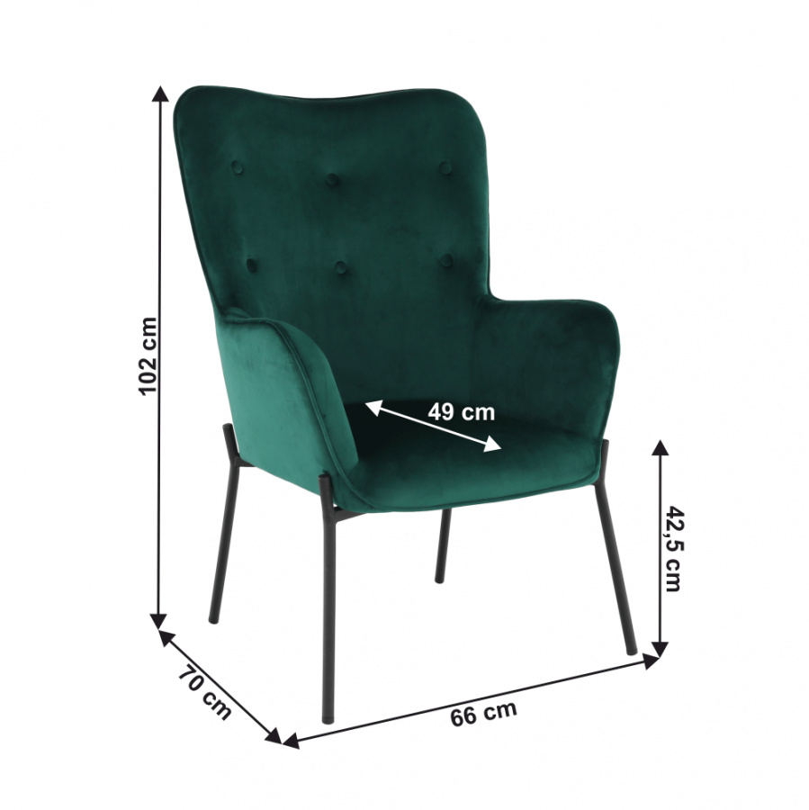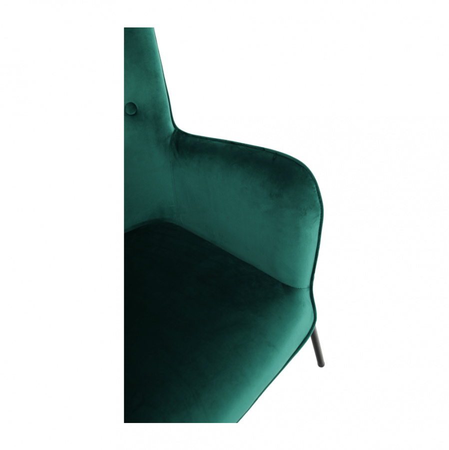 Materiál čalounění: Velvet látka Barva čalounění: smaragdová Materiál nohy: kov Barva nohy: černá Rozměry (ŠxHxV): 66x70x102 cm Výška sedu: 42,5 cm Hloubka sedu: 49 cm Nosnost: 100 kg designové S dekorativními knoflíky S područkami Dodávané v demontu