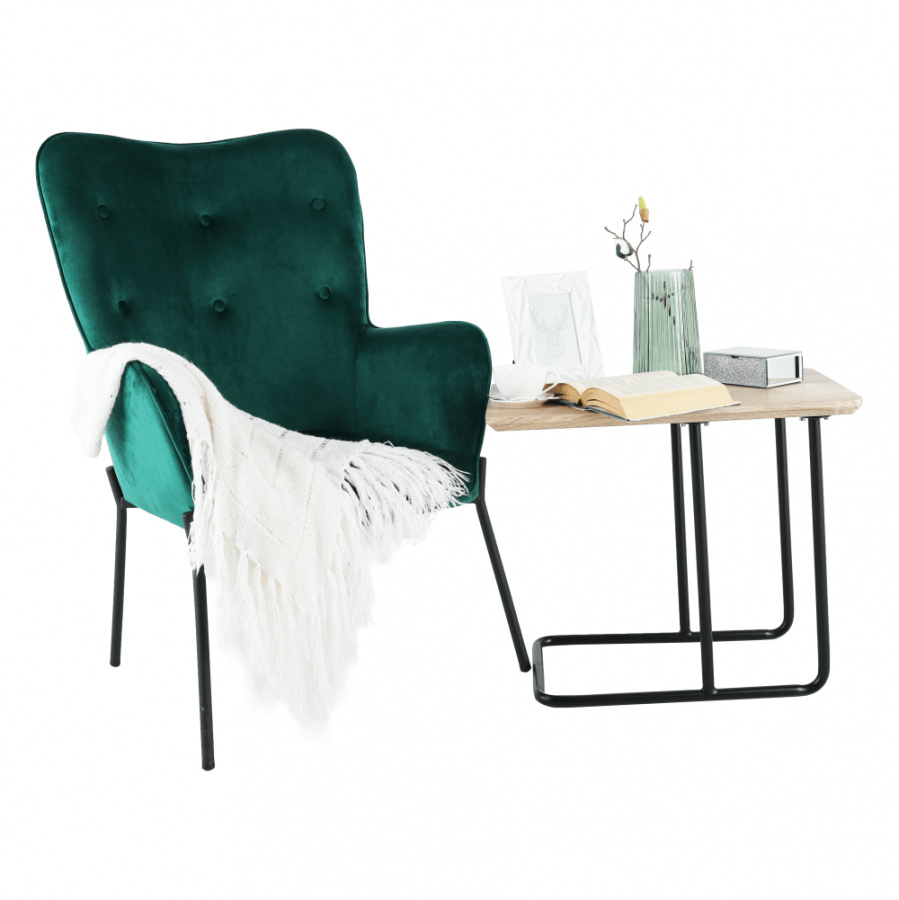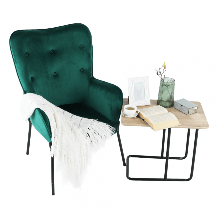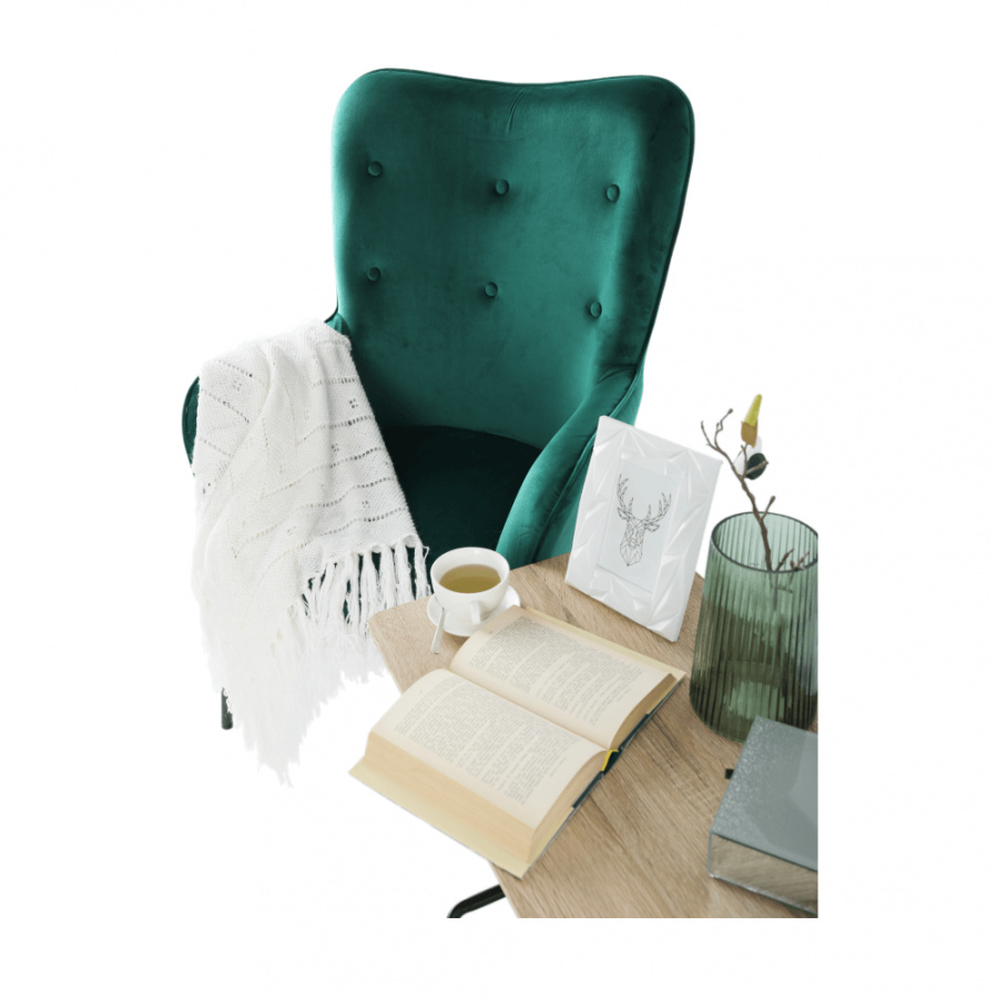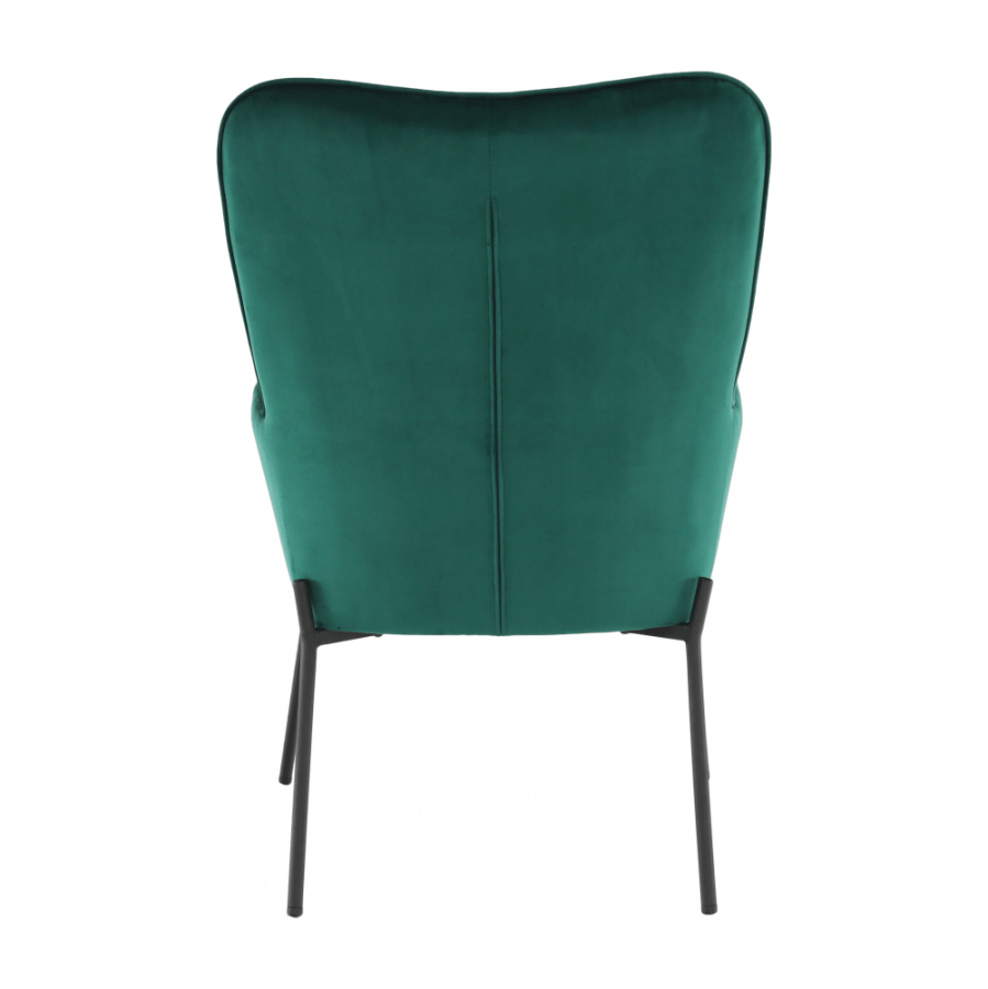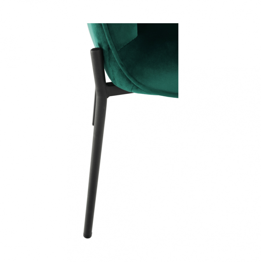 Materiál čalounění: Velvet látka Barva čalounění: smaragdová Materiál nohy: kov Barva nohy: černá Rozměry (ŠxHxV): 66x70x102 cm Výška sedu: 42,5 cm Hloubka sedu: 49 cm Nosnost: 100 kg designové S dekorativními knoflíky S područkami Dodávané v demontu