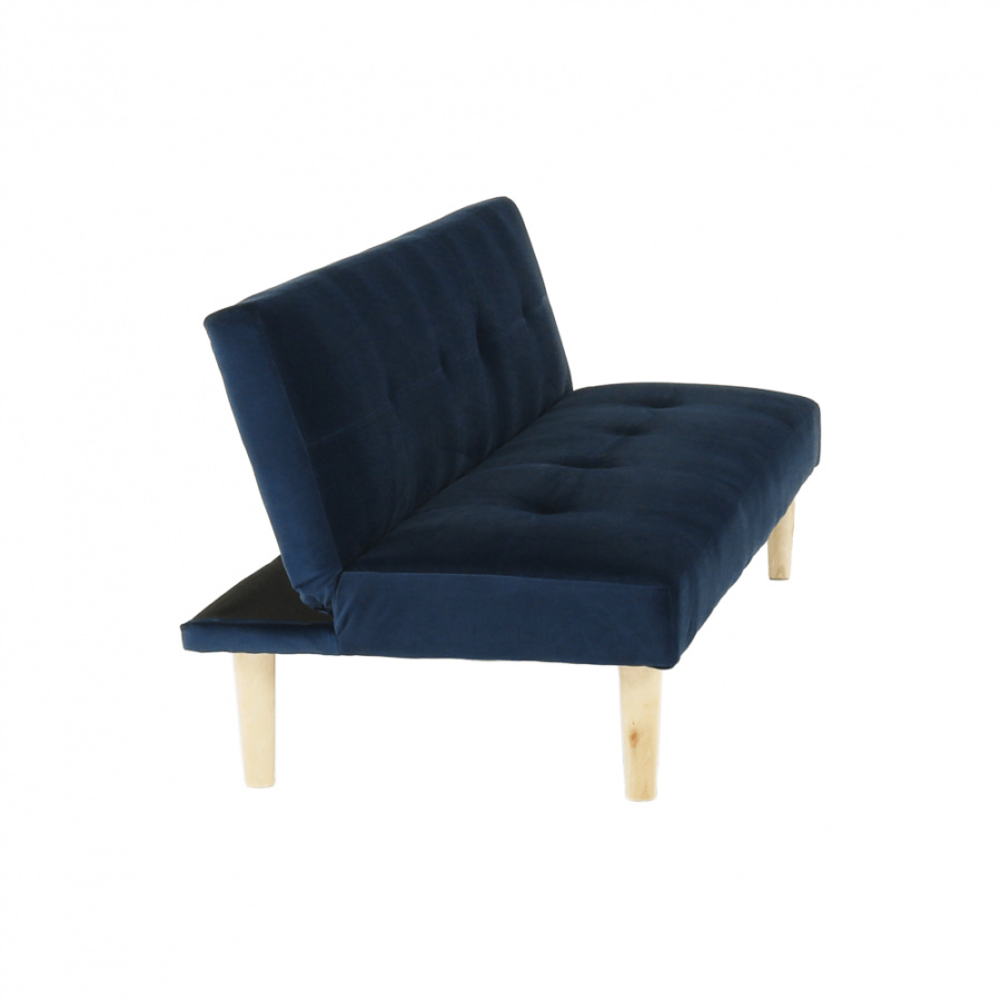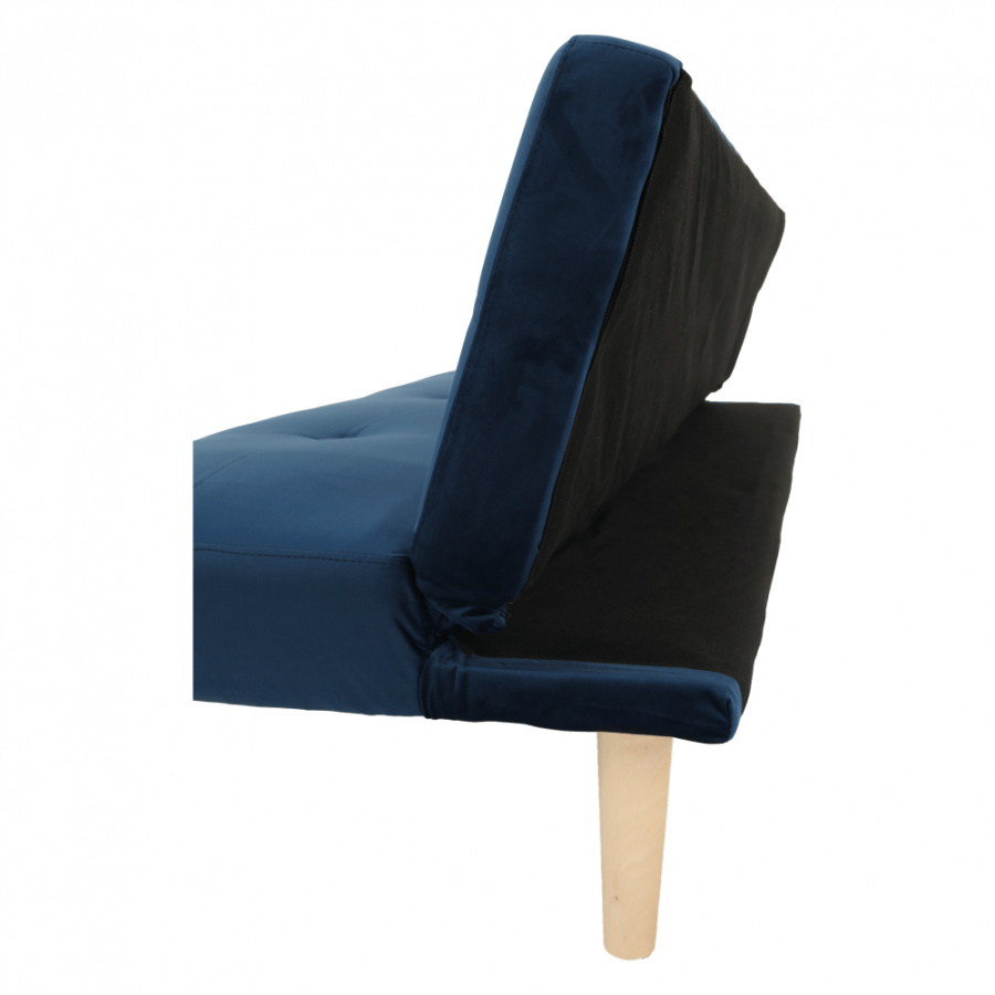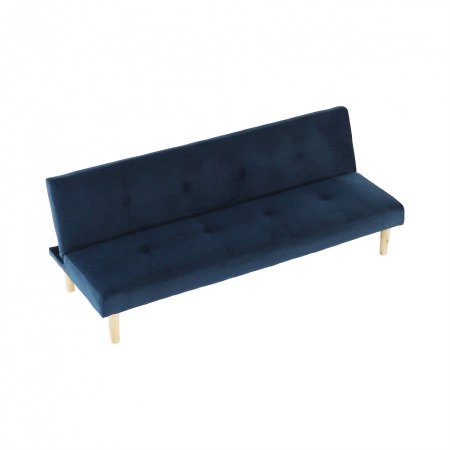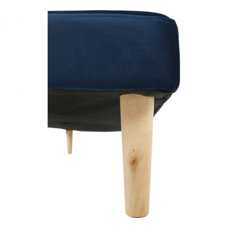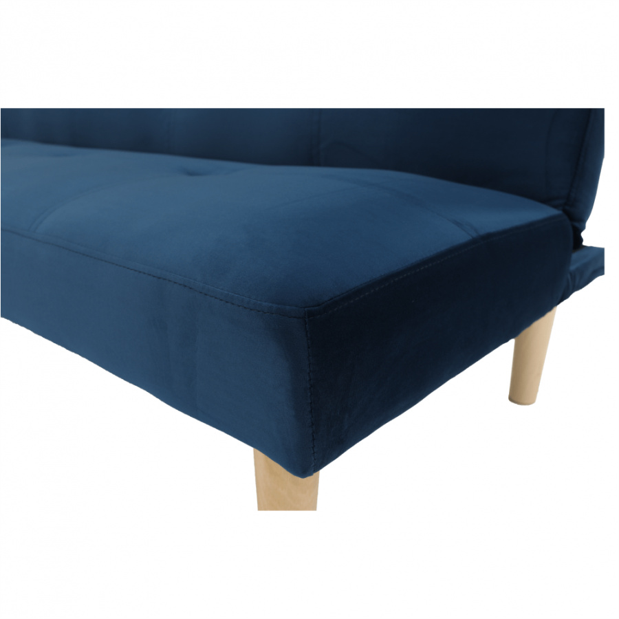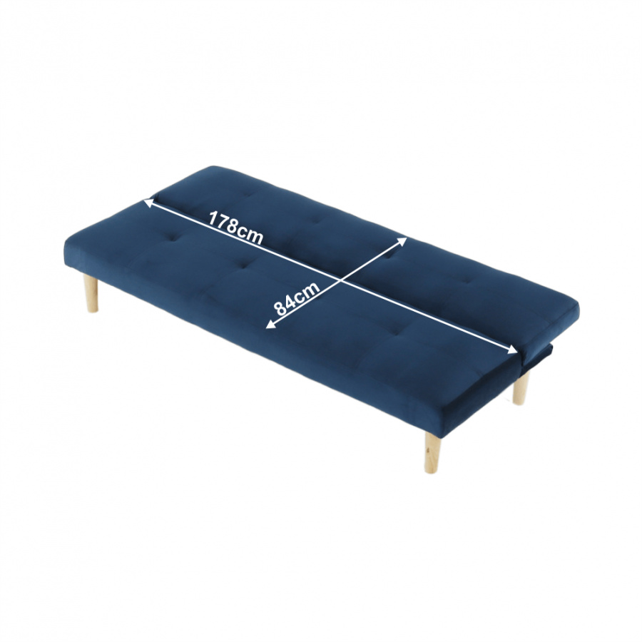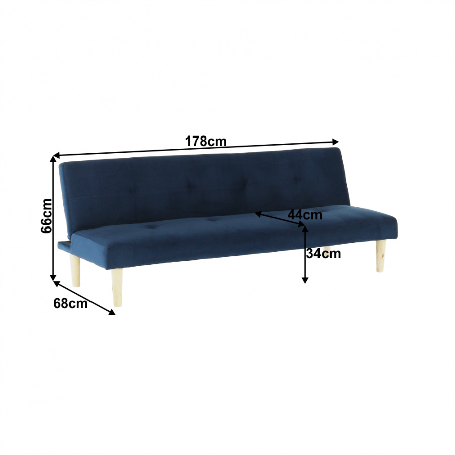 Materiál čalounění: Velvet látka Barva čalounění: tmavomodrá Materiál nohy: dřevo Barva nohy: dub Rozměry (ŠxHxV): 178x68x66 cm rozkládací Plocha na spaní (ŠxHxV): 178x84x34 cm Výška sedu: 34 cm Hloubka sedu: 44 cm moderní design Molitanová výplň sedáku Dřevěné nožičky Dodávané v demontu