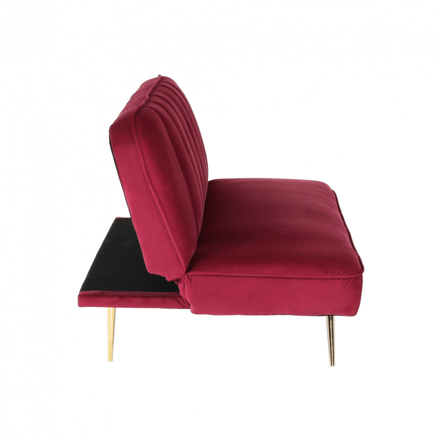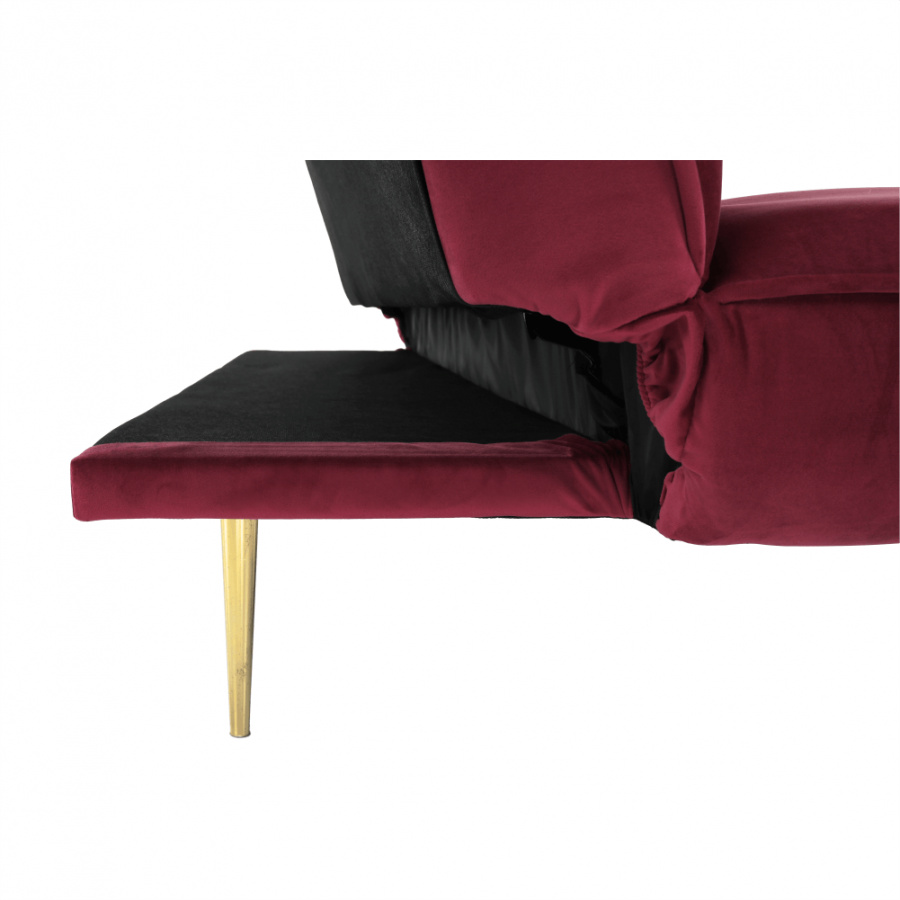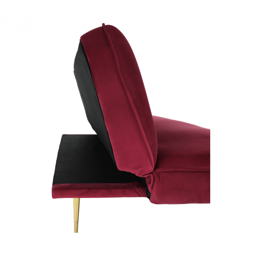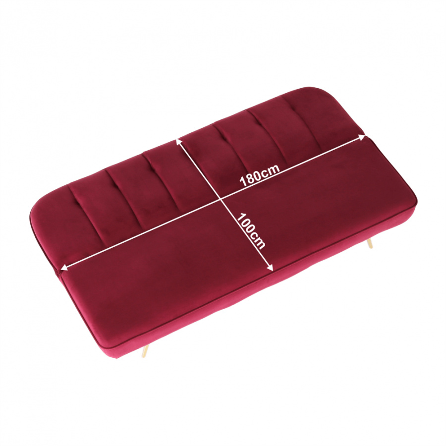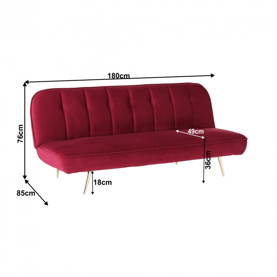 Materiál čalounění: Velvet látka Barva: malinová Materiál nohy: chrom Barva: gold zlatý Rozměry (ŠxHxV): 180x85x76 cm Plocha na spaní (ŠxHxV): 180x100x36 cm Výška spodního prostoru od podlahy: 18 cm Výška sedu: 36 cm Hloubka sedu: 49 cm rozkládací Dodávané v demontu