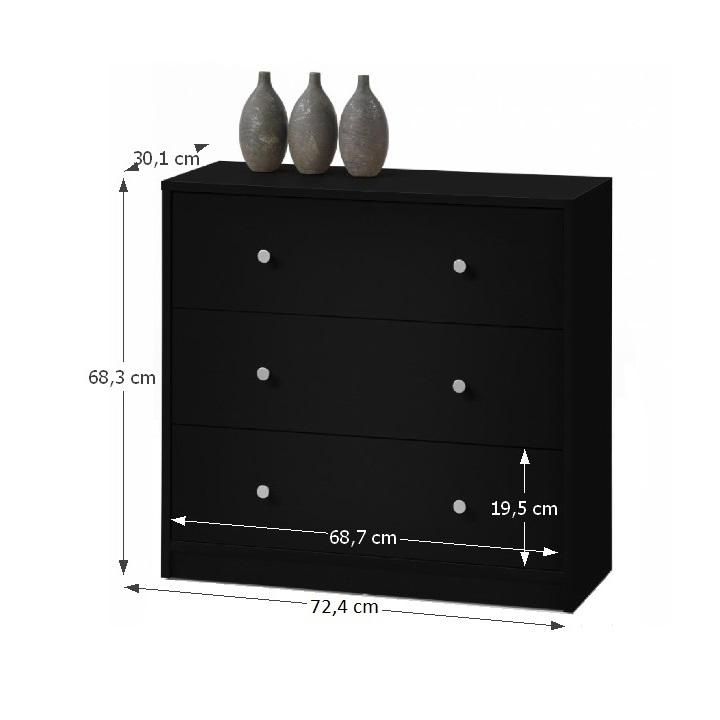 3- šuplíková komoda MAY 3 Materiál: DTD laminovaná Barevné provedení: černá Rozměry (ŠxHxV): 72,4x30,1x68,3 cm Tloušťka materiálu: 12 mm Dodávané v demontu.