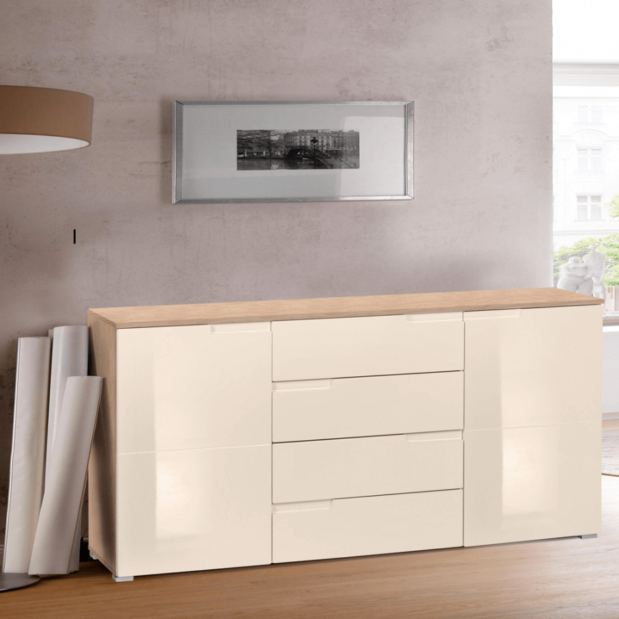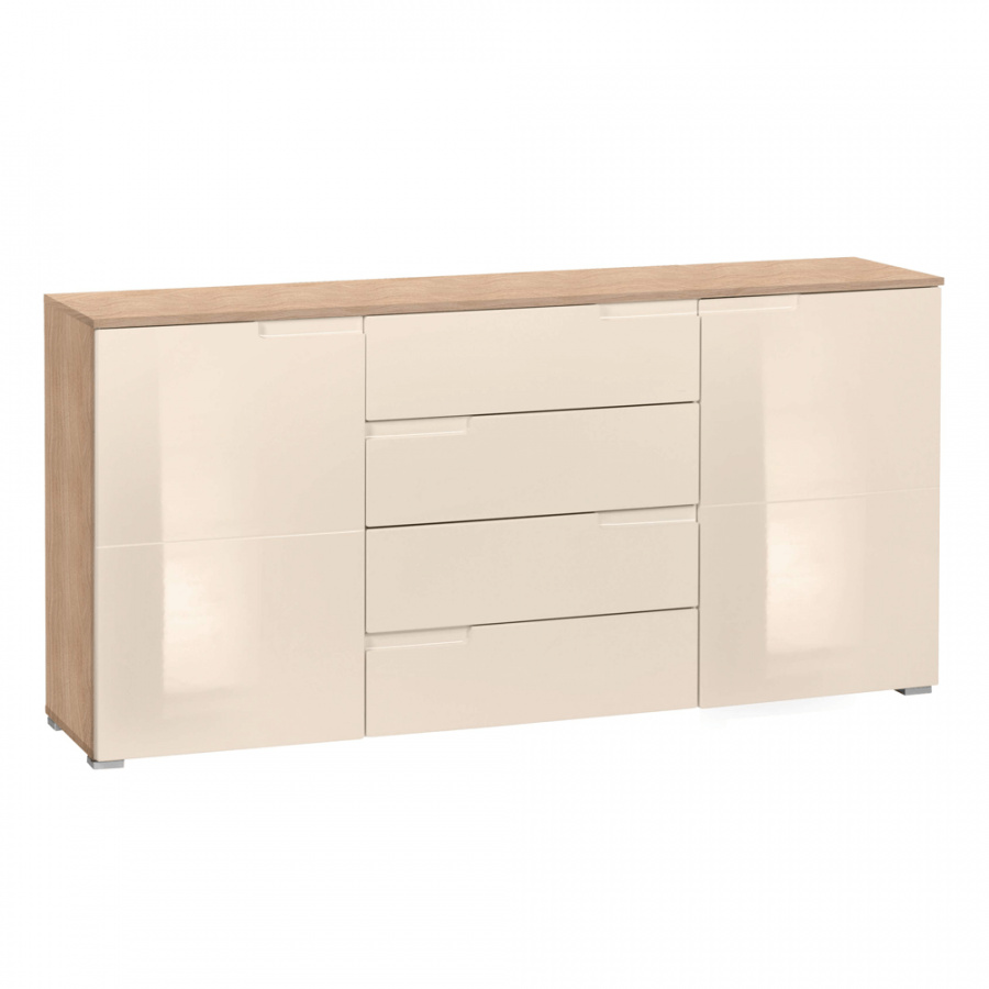 Materiál: DTD laminovaná Barva: krémový HG lesk/dub sonoma Rozměry (ŠxHxV): 165x40x80 cm Tloušťka materiálu: 16 mm Extra vysoký lesk bez úchytkové čtyři šuplíky dvě skříňky Dodávané v demontu