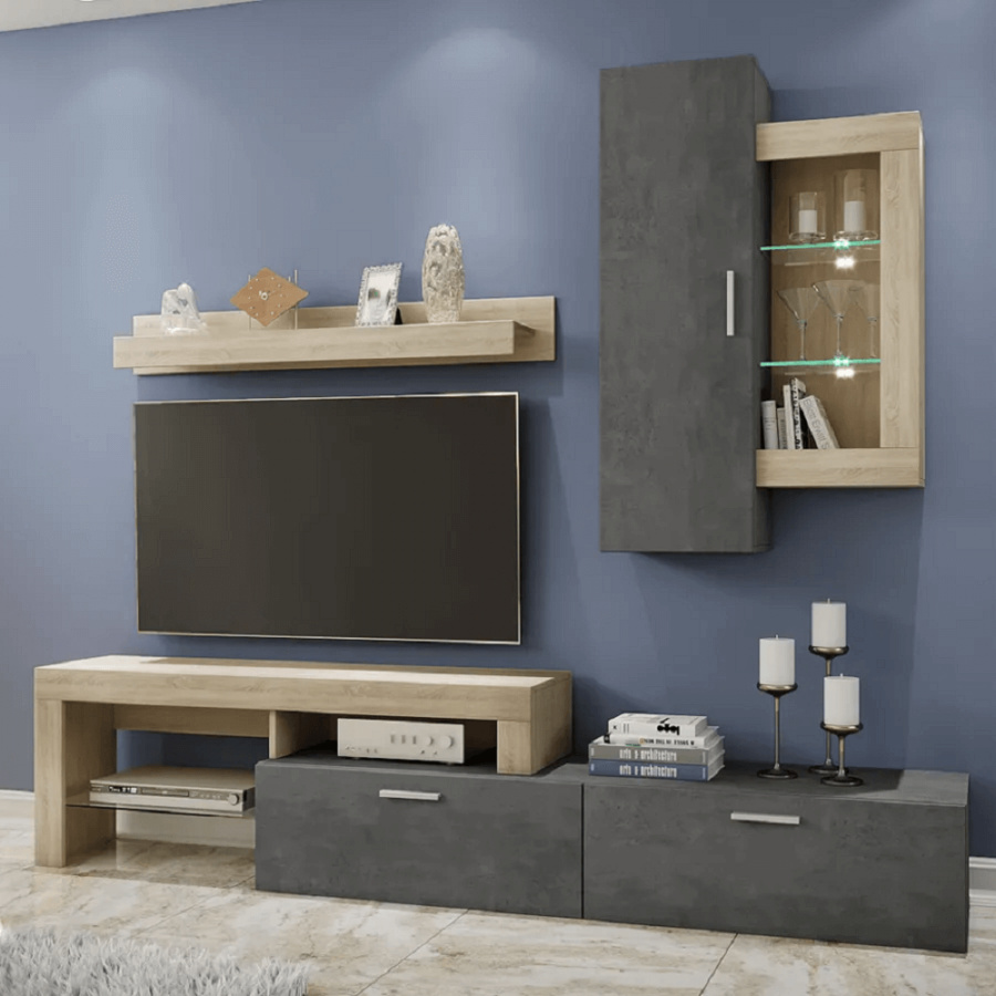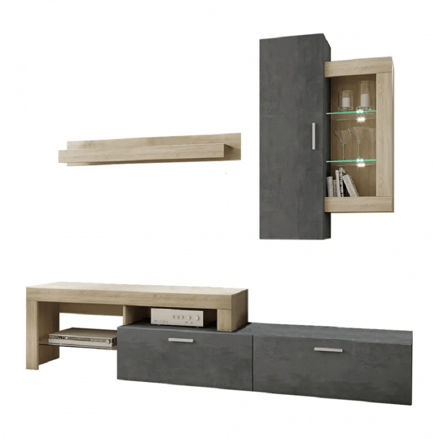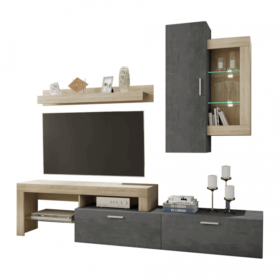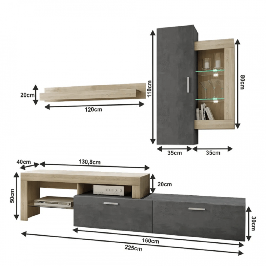 Materiál: DTD laminovaná Barva: dub sonoma / tmavý beton Rozměry (ŠxHxV): 225x40x220 cm RTV stolek závěsná skříňka polička Dodávané v demontu