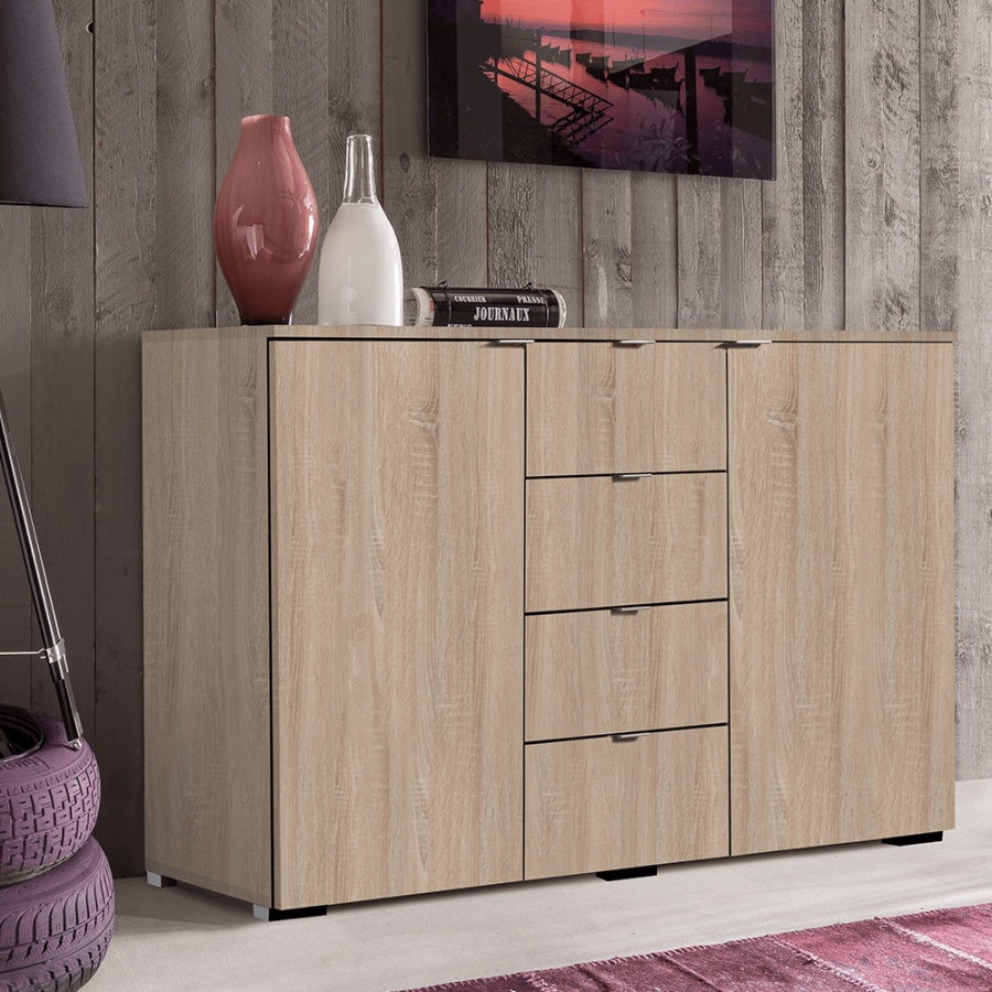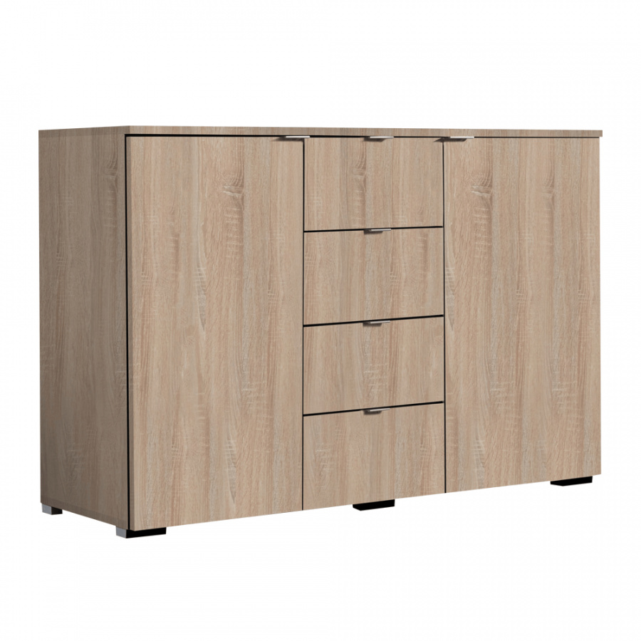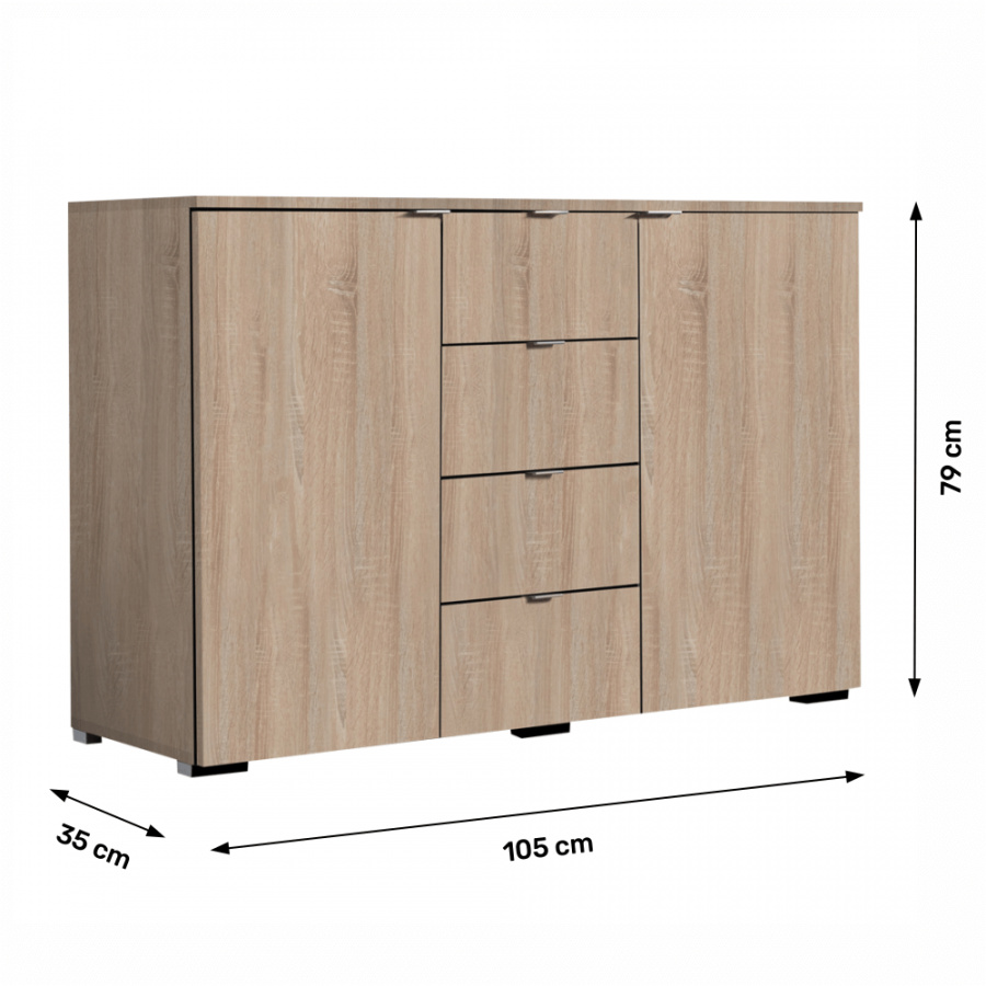 Materiál: DTD laminovaná Barva: dub sonoma Rozměry (ŠxHxV): 105x35x79 cm dvoudveřová dvě skříňky čtyři šuplíky Dodávané v demontu