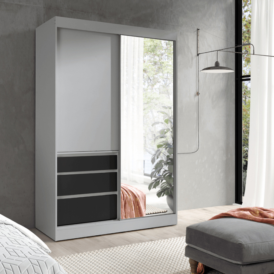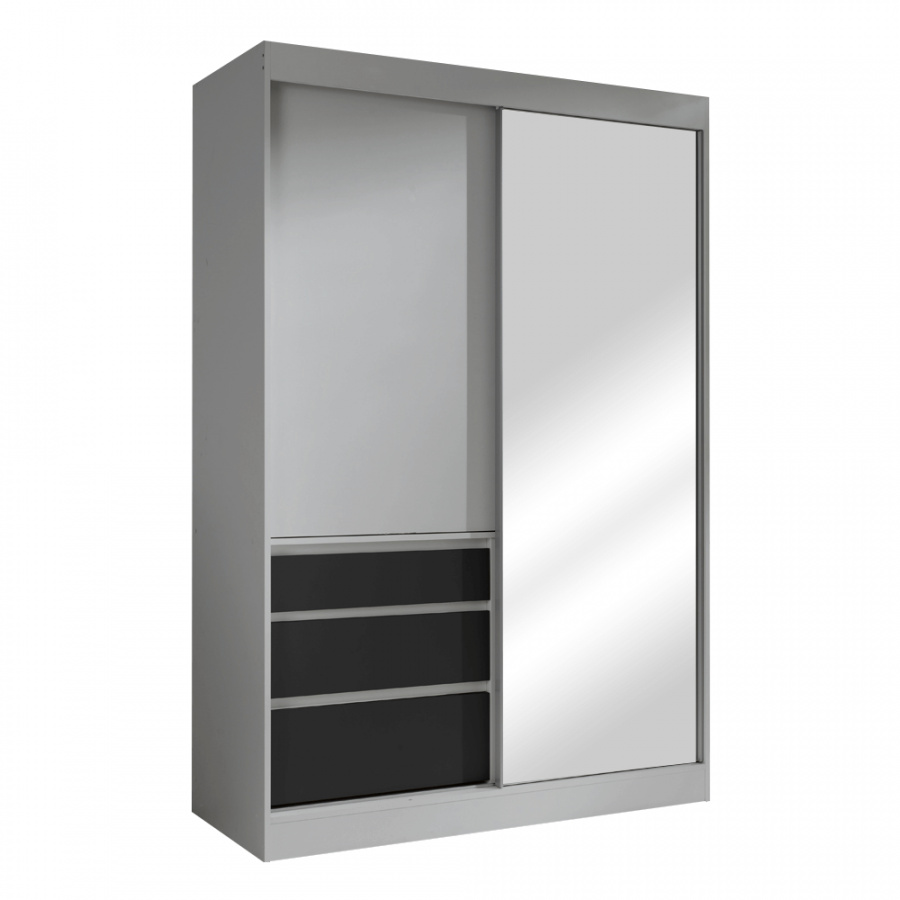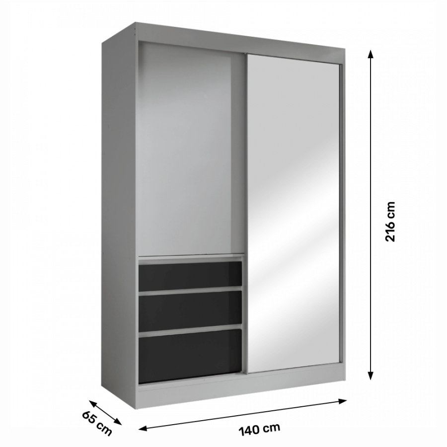 Materiál: DTD laminovaná / zrcadlo Barva: šedá / černá Rozměry (ŠxHxV): 140x65x216 cm Tloušťka materiálu: 16 mm šuplíky police věšáková tyč posuvné dveře se zrcadlem kombinovaná Dodávané v demontu