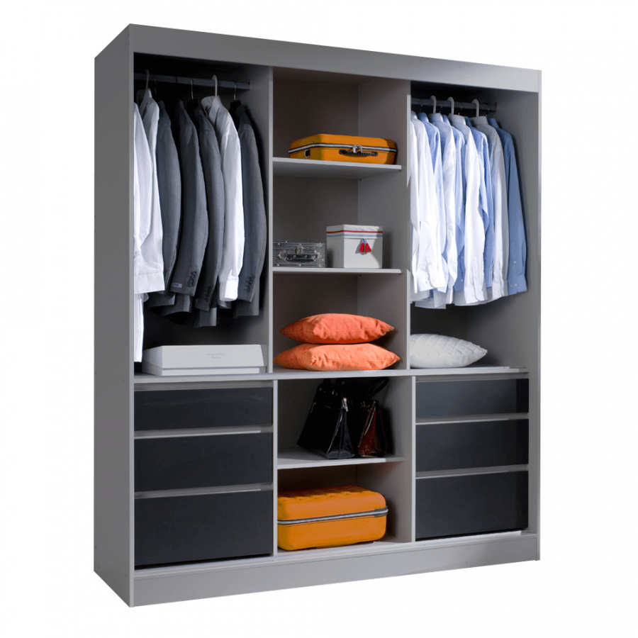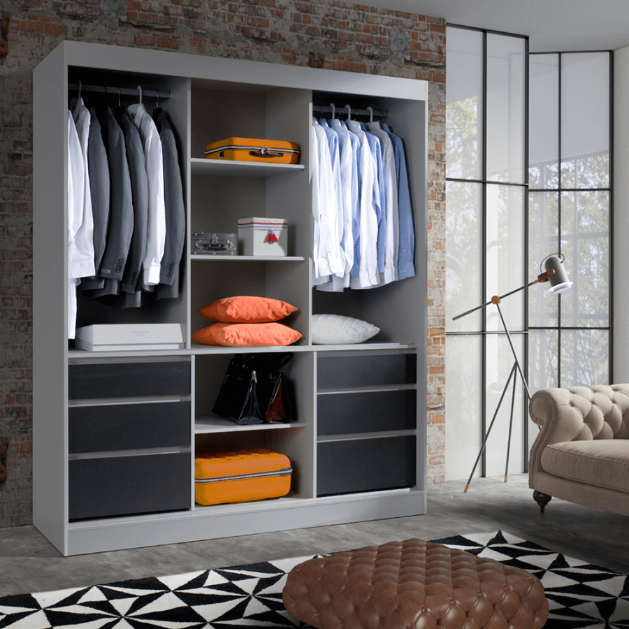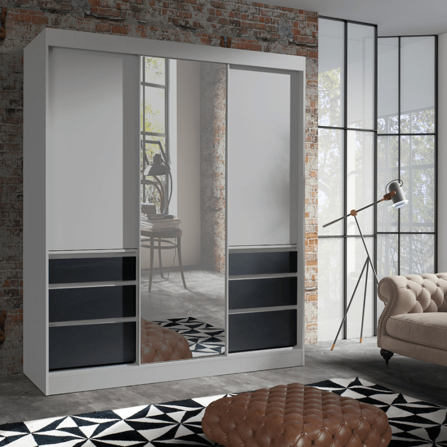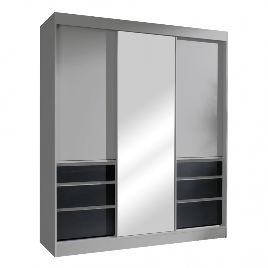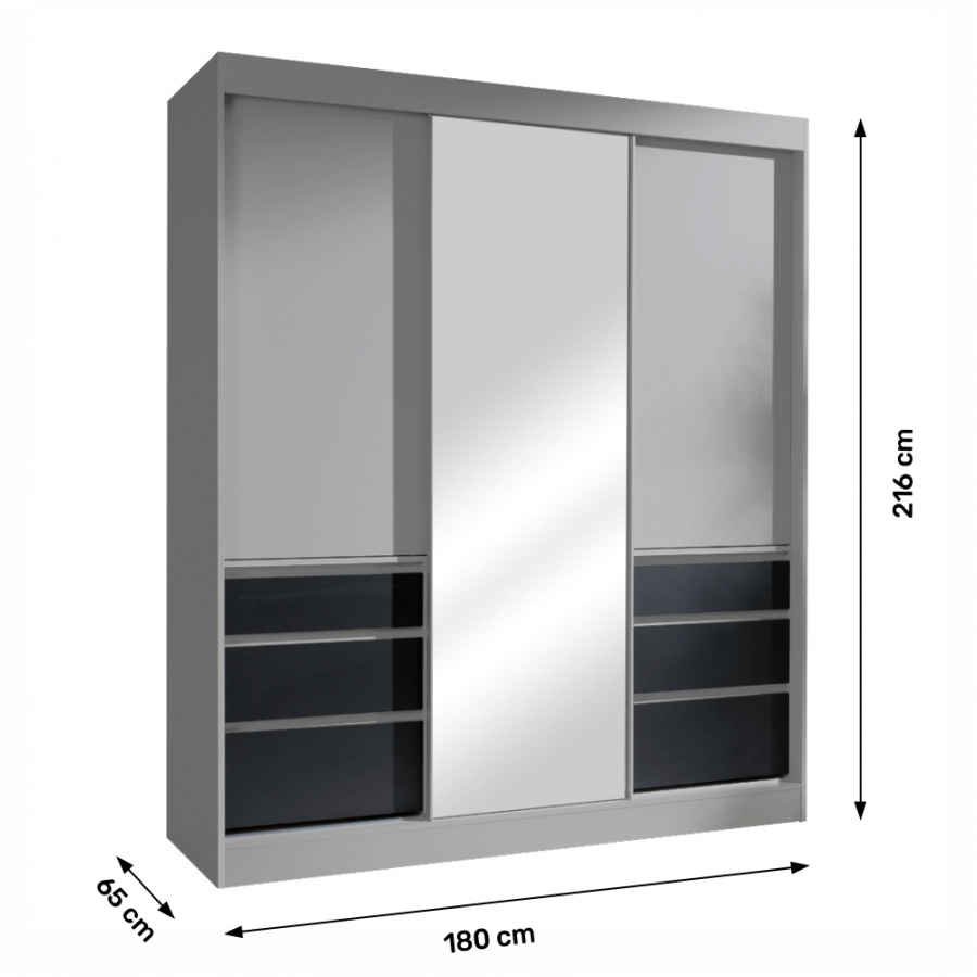 Materiál: DTD laminovaná / zrcadlo Barva: šedá / černá Rozměry (ŠxHxV): 180x65x216 cm Tloušťka materiálu: 16 mm šuplíky police věšáková tyč posuvné dveře se zrcadlem kombinovaná Dodávané v demontu