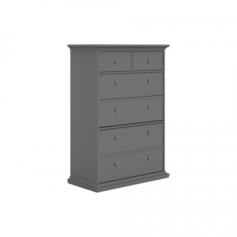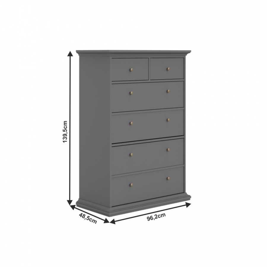 Materiál: DTD laminovaná / MDF lakovaná Barva: šedá Rozměry (ŠxHxV): 96,2x48,5x139,5 cm Tloušťka materiálu: 18 mm šest šuplíků kovové úchytky provensálsku styl ozdobné lišty Dodávané v demontu.