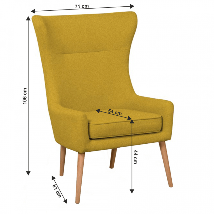 Materiál čalounění: látka Malmo Barva čalounění: 41 hořčicová Materiál nohy: dřevo Barva nohy: buk Rozměry křesla (ŠxHxV): 71x81x106 cm Výška sedu: 44 cm Hloubka sedu: 54 cm Nosnost: 120 kg Dřevěné nožičky Dodávané v demontu Možnost objednání ve vyobrazených barevných provedeních látek Kronos a ve 4 provedeních nohou v ceně 6.630 Kč,Upozorňujeme, že při objednávkách na nábytek v jiném barevném provedení, jak máme běžně skladem, neumíme zaručit doručení do Vánoc. Totéž platí i při nábytku označeném na objednávku. Doba dodání 14-17 týdnů.