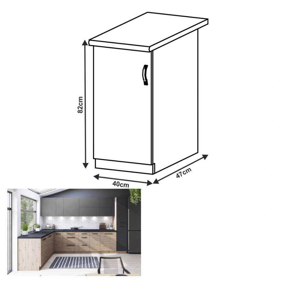 Cena sektorových skříněk je uváděna bez pracovní desky a spodní lišty. Cena za pracovní desku dub artisan je 1180 Kč / bm - tloušťka 38 mm, cena za pracovní desku černý vulkán je 1410 Kč / bm - tloušťka 38 mm. Možnost dokoupení spodní lišty dub artisan v rozměru 1 m za cenu 190 Kč nebo v rozměru 2 m za cenu 280 Kč. Ke každé dolní skříňce je nutné doobjednat 2 ks úchytů na sokl cena 20Kč / 2 ks.