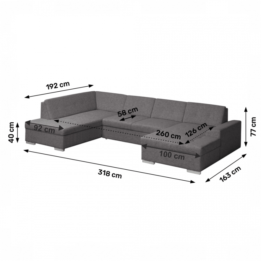 Materiál: látka Soro Barva: 90 šedá Rozměry (ŠxHxV): 318x163 / 192x77 cm Výška sedu: 40 cm Hloubka sedu: 58 cm Plocha na spaní (ŠxD): 126x260 cm Výška spodního prostoru od podlahy: 4,5 cm Šířka otomanů: 92/100 cm Výplň sedací části - pružina faliste celočalouněná rozkládací levé provedení Bez dekorativních polštářů Dodávané v demontu Možnost objednání v 6 barevných provedeních látky Soro. Doba dodání 14-17 týdnů. Upozorňujeme, že při objednávkách na nábytek v jiném barevném provedení, jak máme běžně skladem, neumíme zaručit doručení do Vánoc. Totéž platí i při nábytku označeném na objednávku. Doba dodání 14-17 týdnů.