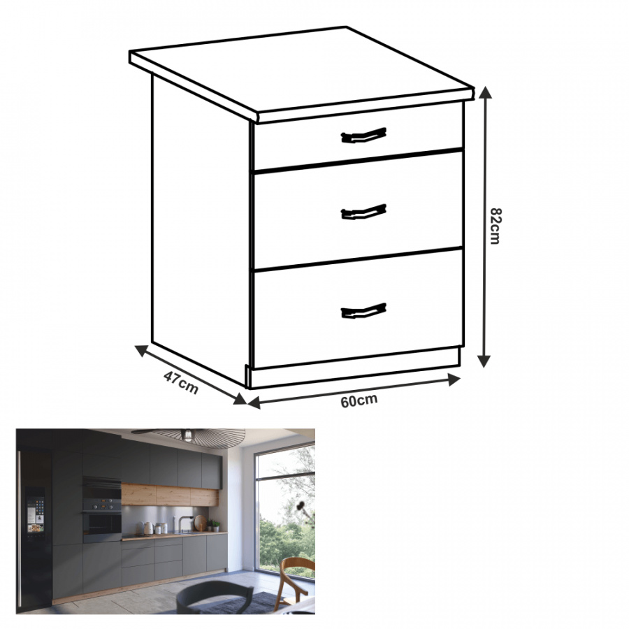 Materiál: DTD laminovaná Barva: dub artisan / šedý mat Rozměry (ŠxHxV): 60x47x82 cm Otváranie pomocí úchytiek 3 šuplíky Bez pracovní desky Bez spodní lišty Dodávané v demontu Cena sektorových skříněk je uváděna bez pracovní desky a spodní lišty. Cena za pracovní desku dub artisan je 1180 Kč / bm - tloušťka 38 mm, cena za pracovní desku černý vulkán je 1410 Kč / bm - tloušťka 38 mm. Možnost dokoupení spodní lišty dub artisan v rozměru 1 m za cenu 190 Kč nebo v rozměru 2 m za cenu 280 Kč. Ke každé dolní skříňce je nutné doobjednat 2 ks úchytů na sokl cena 20Kč / 2 ks.