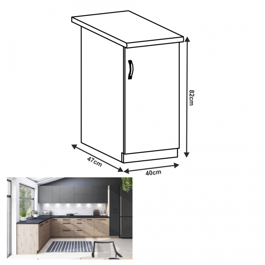 Cena sektorových skříněk je uváděna bez pracovní desky a spodní lišty. Cena za pracovní desku dub artisan je 1180 Kč / bm - tloušťka 38 mm, cena za pracovní desku černý vulkán je 1410 Kč / bm - tloušťka 38 mm. Možnost dokoupení spodní lišty dub artisan v rozměru 1 m za cenu 190 Kč nebo v rozměru 2 m za cenu 280 Kč. Ke každé dolní skříňce je nutné doobjednat 2 ks úchytů na sokl cena 20Kč / 2 ks.