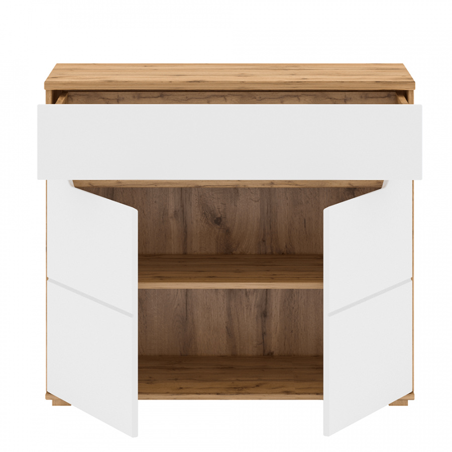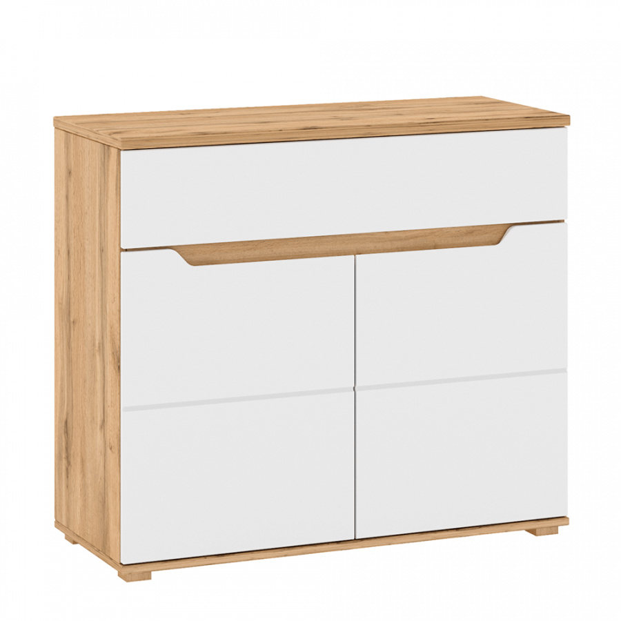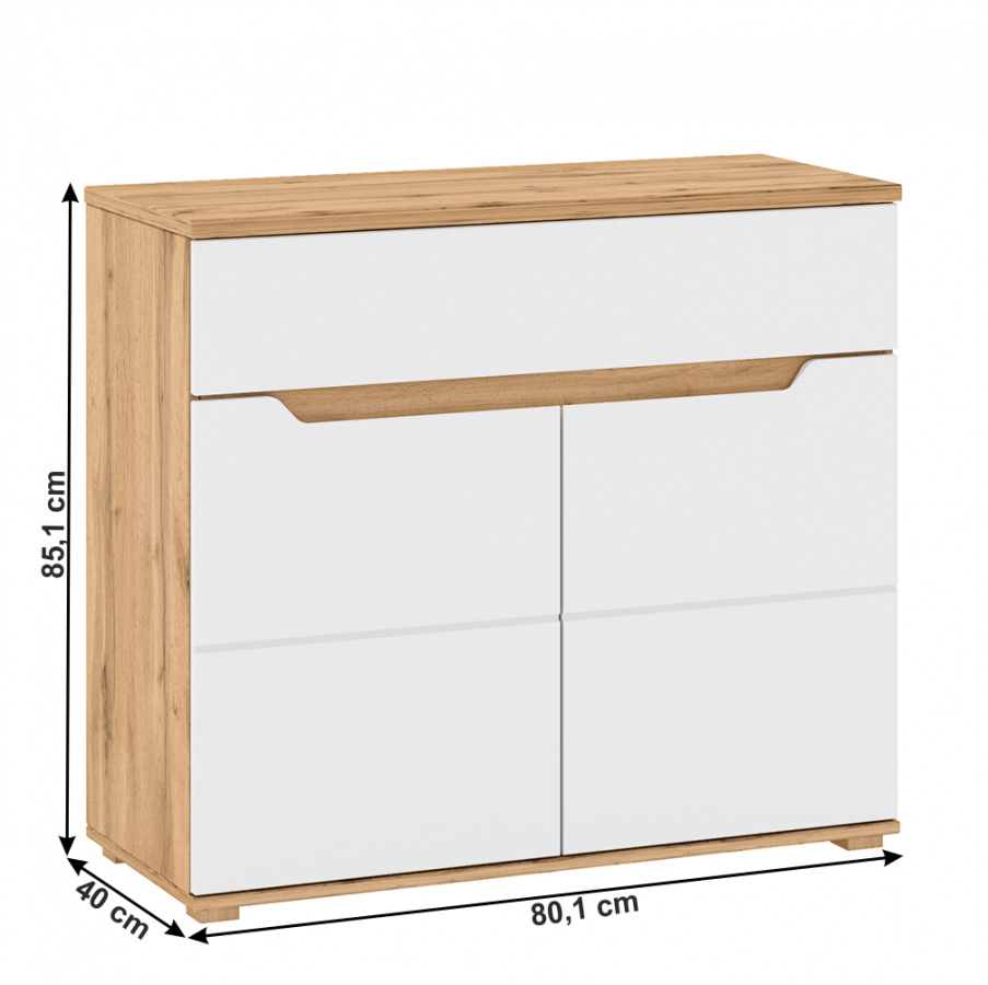 Materiál: DTD laminovaná / ABS hrany / MDF Barva: dub wotan / bílá extra vysoký lesk Rozměry (ŠxHxV): 80,1x40x85,1 cm Tloušťka materiálu korpus: 16 mm Tloušťka materiálu vrchní deska: 22 mm MDF dvířka dvoudveřová skříňka šuplík Dodávané v demontu