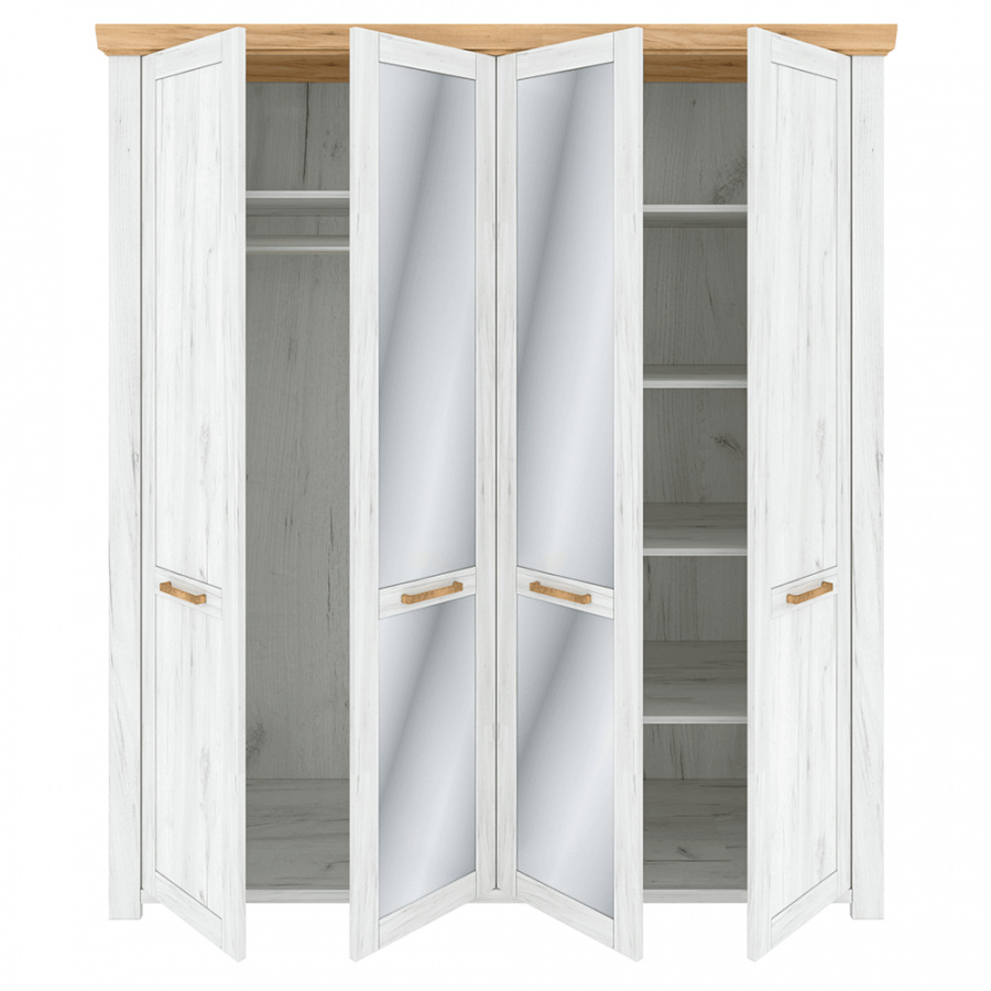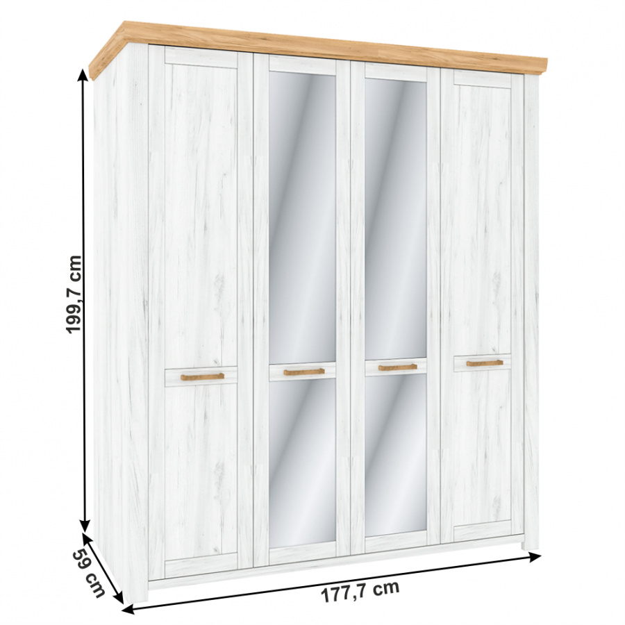 Materiál: DTD laminovaná / MDF Barva: dub craft zlatý / dub craft bílý Rozměry (ŠxHxV): 177,7x59x199,7 cm Tloušťka materiálu korpus: 16 mm Tloušťka materiálu vrchní deska: 22 mm Tloušťka materiálu dvířka: 19 mm Výška spodního prostoru od podlahy je 4,2 cm se zrcadlem čtyřdveřová věšáková tyč police Dodávané v demontu