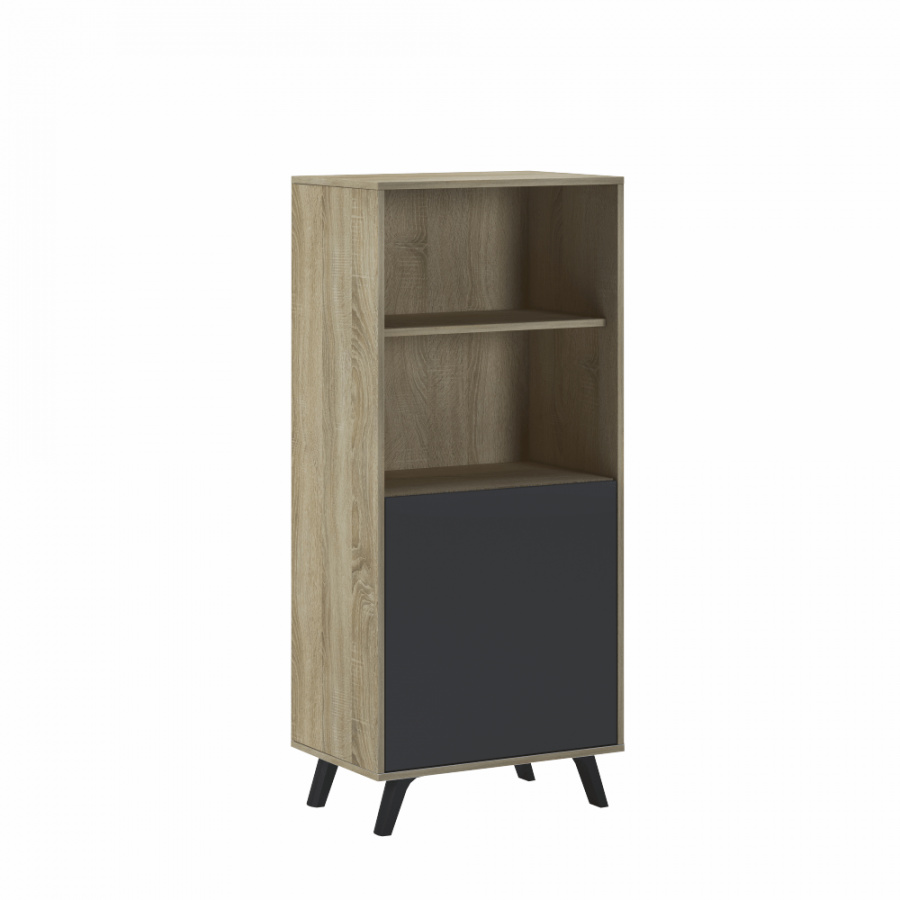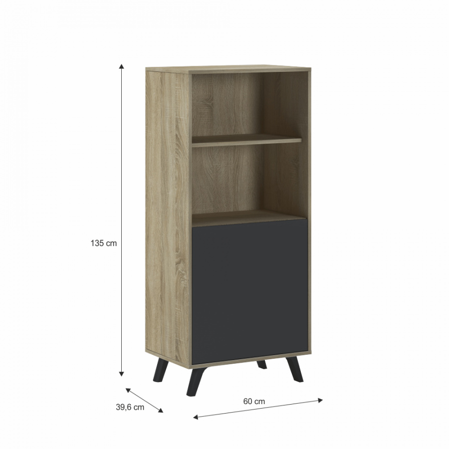 Materiál: DTD laminovaná Barva: dub sonoma / šedá Materiál nohy: plast Barva nohy: tmavěšedá Rozměry (ŠxHxV): 60x39,6x135 cm Výška spodního prostoru od podlahy: 12 cm Otevřený úložný prostor jedna skříňka S dotykovým systémem PUSH UP Dodávané v demontu.