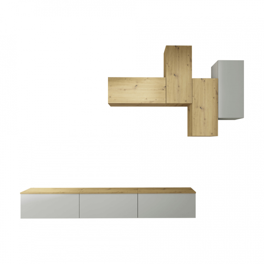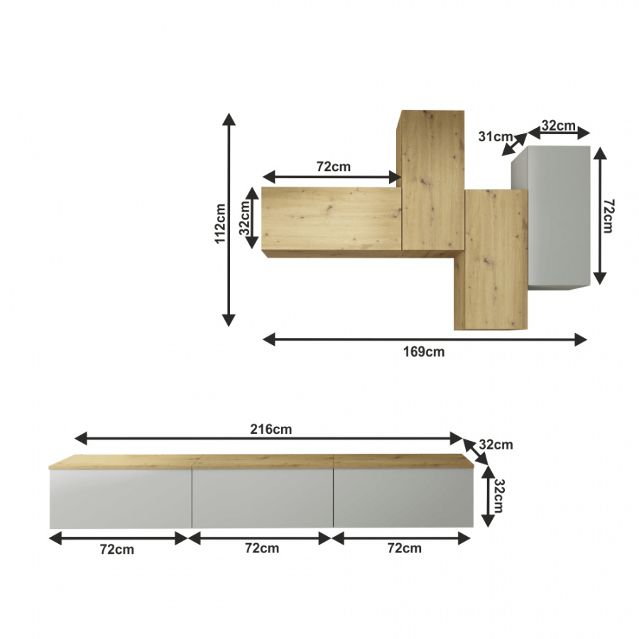 Materiál: DTD laminovaná Barva: světlešedá / dub artisan Rozměry (ŠxHxV): 216x32x190 cm Tloušťka materiálu: 16 mm RTV skříňka Čtyři závěsné skříňky Dotykový systém PUSH UP Dodávané v demontu