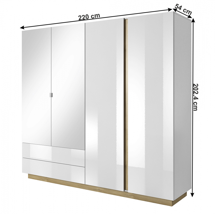 Materiál: DTD laminovaná / ABS hrany Barva: bílá / dub grandson / bílý lesk Rozměry (ŠxHxV): 220x54x202,4 cm Tloušťka materiálu: 16 mm bez úchytek Dotykové otevírání PUSH UP věšáková část S věšákovou tyčí dva šuplíky policová část S policemi se zrcadlem Dodávané v demontu