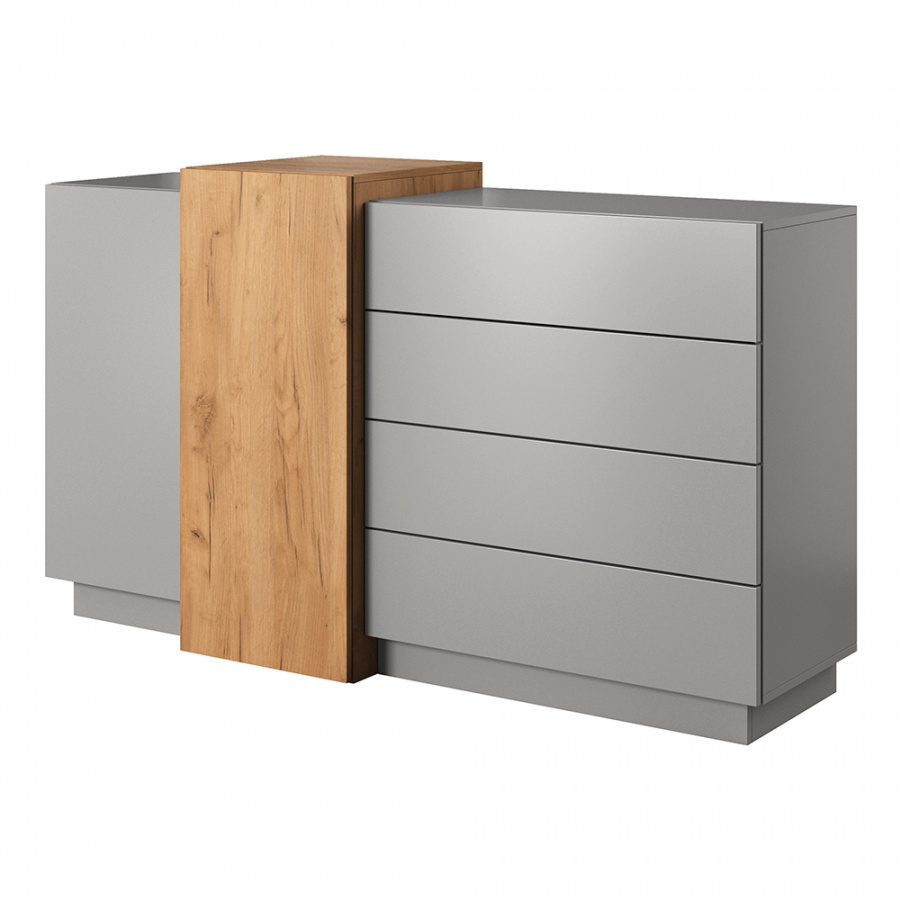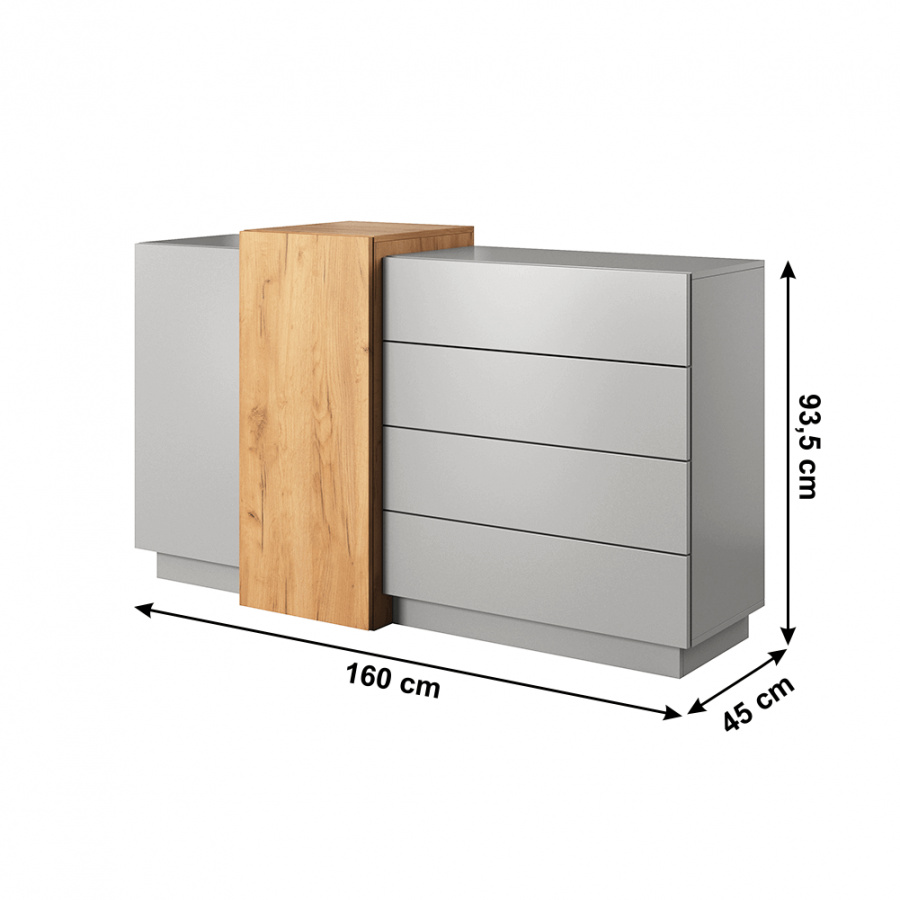 Materiál: DTD laminovaná / ABS hrany Barva: šedá / dub craft zlatý Rozměry (ŠxHxV): 160x45x93,5 cm dvoudveřová čtyři šuplíky S dotykovým systémem PUSH UP designová Dodávané v demontu